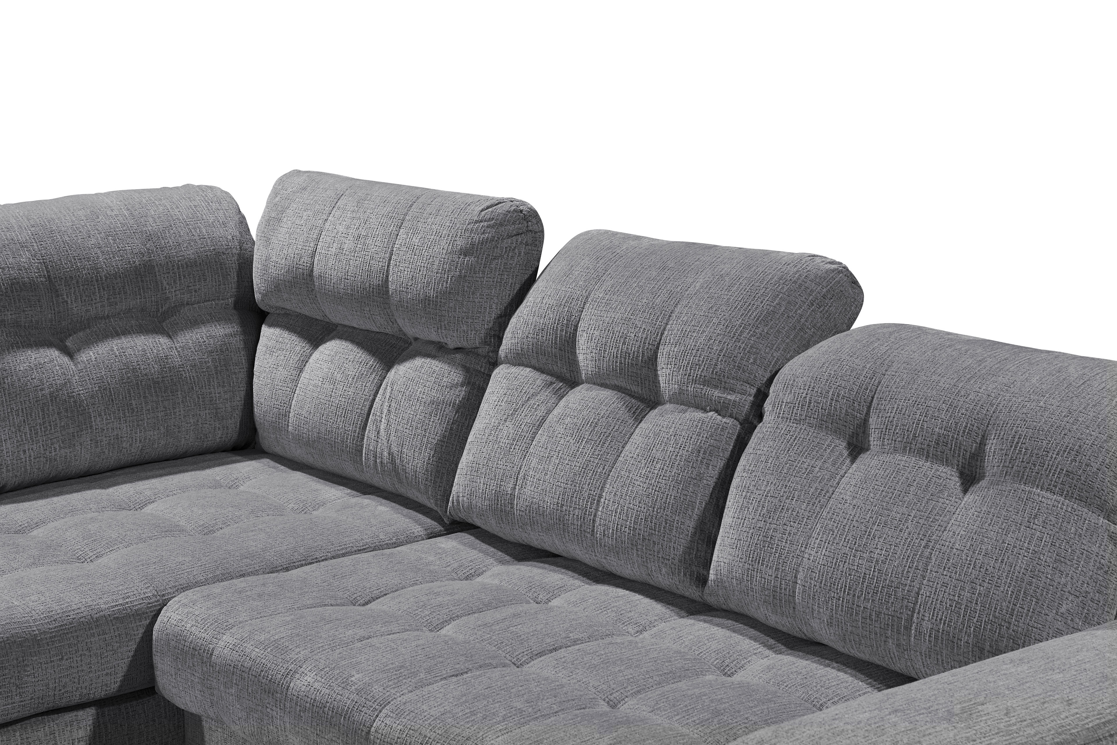 Sie sind auf der Suche nach einer neuen Garnitur für Ihr Wohnzimmer und legen großen Wert auf Design sowie Funktionen? Dann werfen Sie gern einen genaueren Blick auf das Modell Varadero aus dem Hause ED-Lifestyle, welches sich mit seinem dezenten Äußeren perfekt in fast jedes Wohnambiente einfügt und einen Hauch von zeitloser Eleganz versprüht. Gekleidet in einem dunkelgrauen Chenille-Flachgewebe sowie stehend auf edlen Kunststofffüßen, verleiht das Polstersofa jedem Raum eine sanfte Note von Luxus und setzt ein stilvolles Statement, ohne dabei aufdringlich zu wirken. Das ca. 220 x 280 cm große Ecksofa schenkt Ihnen einen Ort, an dem Sie dem ganzen Alltagsstress entfliehen und eine wohltuende Auszeit mit einem fesselnden Buch oder ruhigen Musikklängen genießen können. Hier wird Ihnen nicht nur eine großzügige Sitzfläche geboten, auf der Sie mit der Familie oder den Freunden eine schöne Zeit verbringen können, sondern auch ein himmlisches Sitzerlebnis, dank einer Schaumstoffpolsterung auf einer Nosagfederung, welche zum Verweilen und Wohlfühlen einlädt. Alles, was Sie für erholsame Momente benötigen, lässt sich mühelos in den bereits integrierten Bettkasten, welcher sich in der Ottomane befindet, verstauen sowie wieder entnehmen. Ein weiteres Highlight dieses Möbelstücks ist die manuelle Kopfteilverstellung und die elektrische Sitztiefenverstellung im 2-Sitzer, mit der sich die Sitztiefe von etwa 60 cm bis zu ca. 90 cm per Knopfdruck vergrößern lässt: So können Sie sich Ihre bevorzugte Entspannungsposition individuell einstellen. Mit dem ED-Lifestyle Polstermöbel erhalten Sie eine moderne Couchgarnitur mit viel Platz, hohem Sitzkomfort sowie praktischer Funktionalität - Varadero.