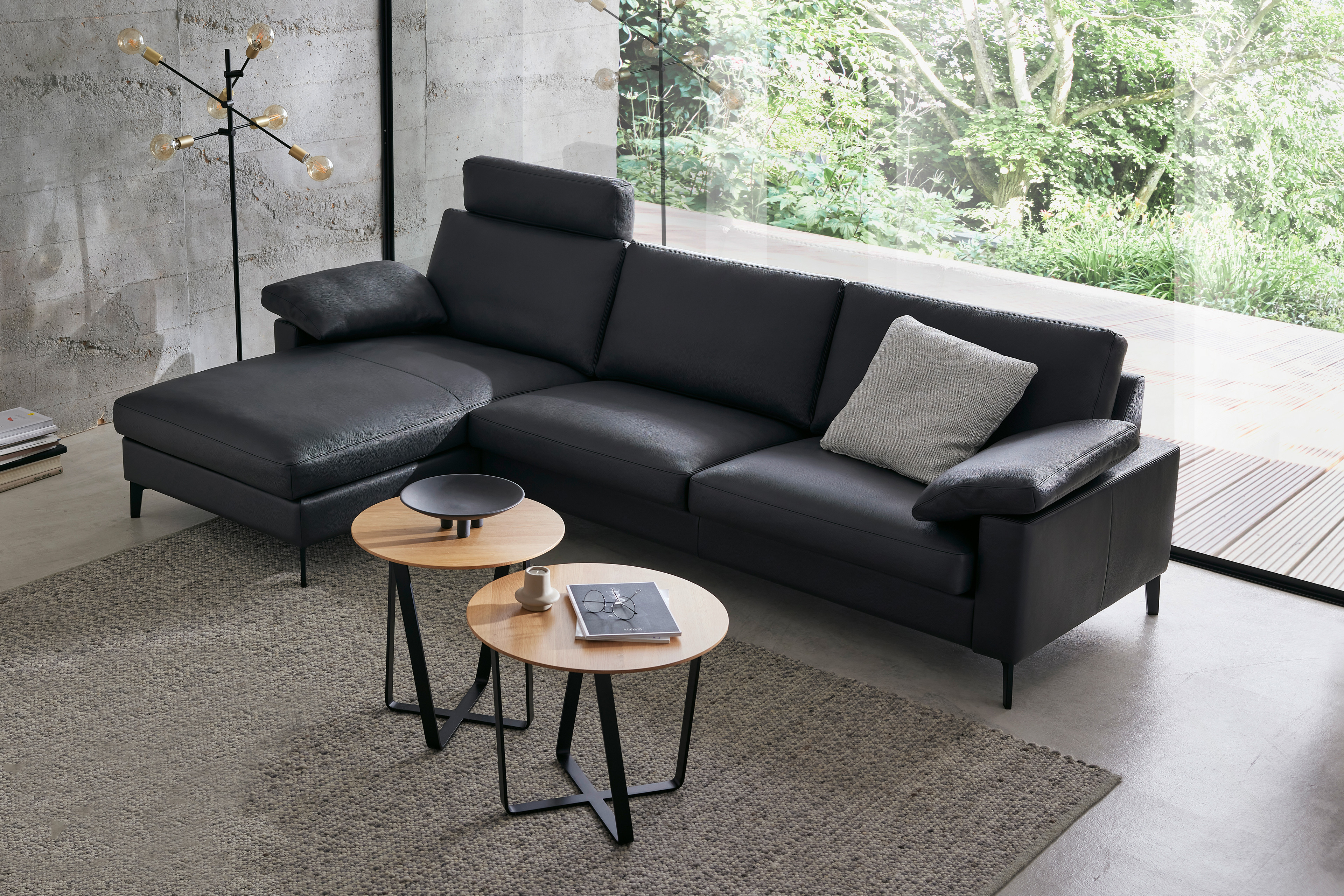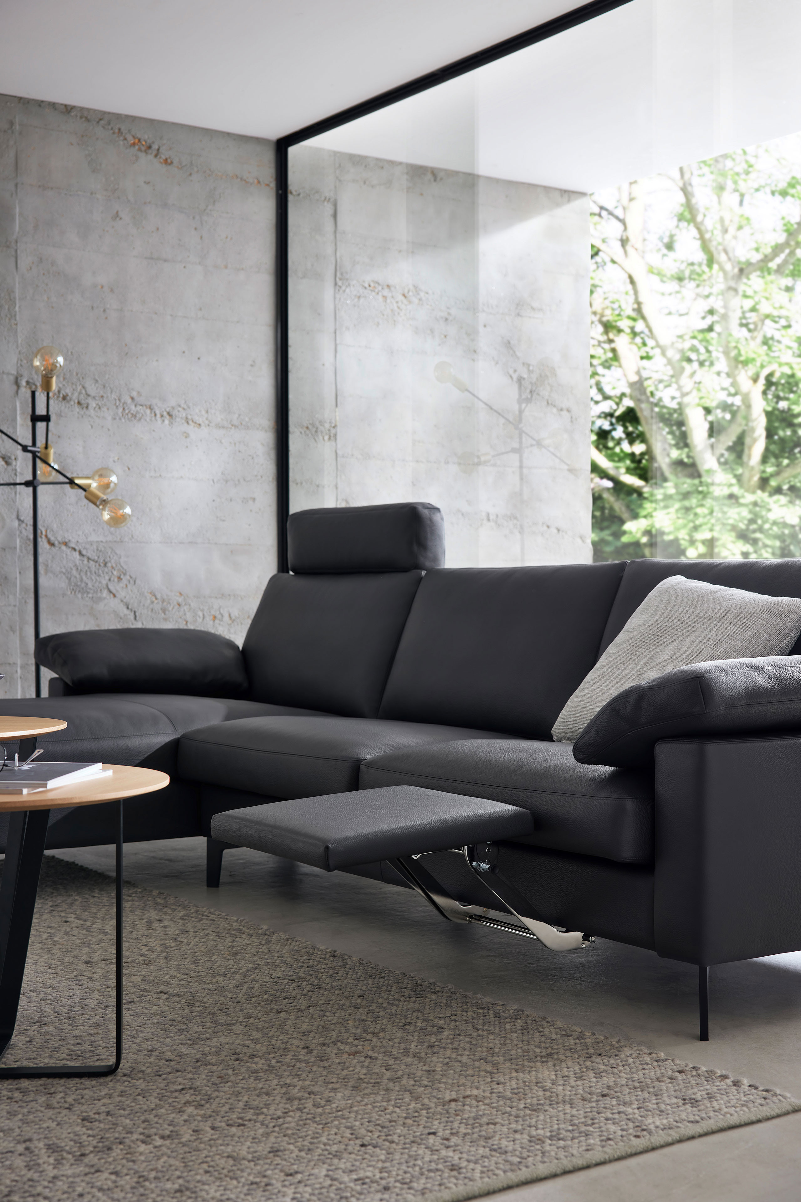Mit klarer Linienführung, hochwertiger Verarbeitung sowie einem durchdachten Einrichtungskonzept präsentiert sich die Ledergarnitur CL 500 von Erpo Möbelwerke als ansprechende Lösung für moderne Wohnräume. Die elegante Sitzgarnitur verbindet minimalistisches Design mit einem hohen Maß an Individualität und lädt zum längeren Verweilen ein. In der hier gezeigten Anordnung besteht die Garnitur aus einer großzügigen Ottomane, die durch einen komfortablen Zweisitzer ergänzt wird. Die Zusammenstellung schafft ein einladendes Sitzmöbel, das sowohl zum Sitzen als auch zum Ausstrecken der Beine einlädt. Charakteristisch für das Modell ist die harmonische Formsprache, bei der klare Konturen auf weiche Polster treffen und so eine zeitgemäße Optik entsteht. Für angenehmen Sitzkomfort sorgt eine hochwertige Polsterung mit weichem Daunencharakter in den Sitz- sowie Rückenkissen. Sie bietet eine besonders behagliche Grundlage zum Entspannen und macht das Sofa schnell zum Lieblingsplatz im Wohnzimmer. Ein besonderes Merkmal der Modellreihe CL 500 ist die hohe Flexibilität. Verschiedene Elemente lassen sich individuell miteinander kombinieren, sodass Sie Ihre Polstergarnitur ganz nach Ihren persönlichen Wohnbedürfnissen gestalten können. Neben unterschiedlichen Sofaelementen stehen auch passende Zusatzoptionen zur Verfügung: Bei dem Zweisitzer kann beispielsweise eine praktische Fußstütze integriert werden, die sich bFequem von unten ausfahren lässt. Optional erhältliche Kopfstützen für beide Elemente sorgen für zusätzlichen Komfort im Nackenbereich, während dekorative Zierkissen und Armlehnenkissen das gemütliche Gesamtbild stilvoll abrunden. Ob als eleganter Mittelpunkt im Wohnzimmer oder als gemütlicher Rückzugsort nach einem langen Tag - mit Erpo CL 500 holen Sie sich zeitlose Ästhetik, individuellen Wohlfühlfaktor sowie hochwertige Polsterkunst in Ihr Zuhause.