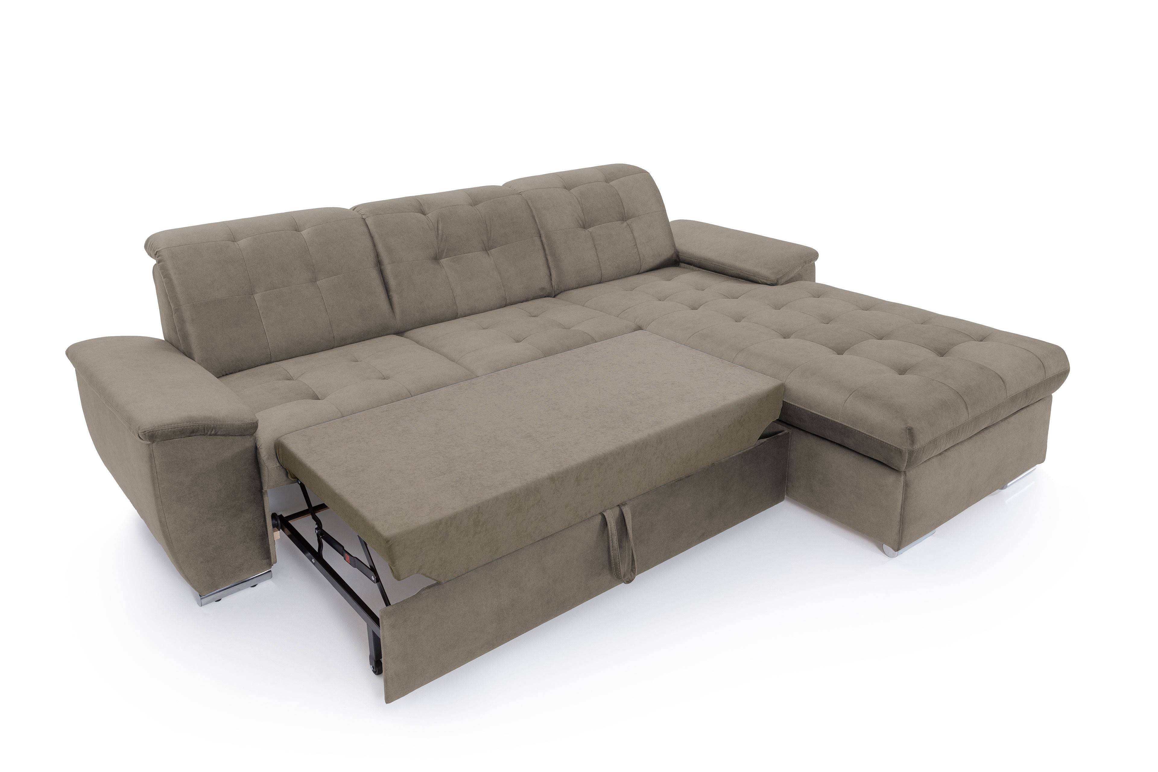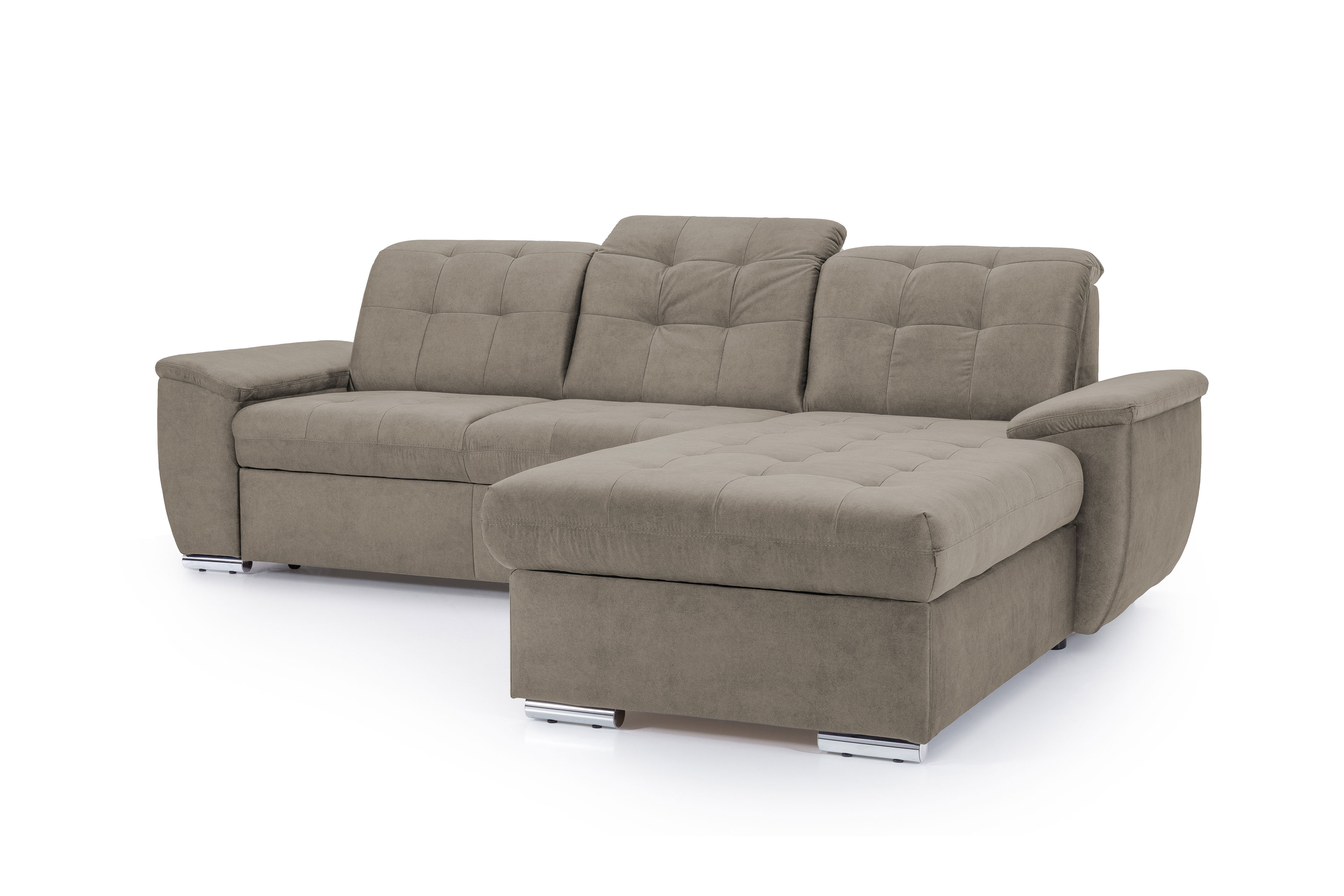 Das Wohnzimmer ist der zentrale Mittelpunkt Ihres Zuhauses - der Ort, an dem Sie nach einem langen Tag zur Ruhe kommen, lachen und unvergessliche Momente teilen. Genau für diese besonderen Augenblicke wurde Durango von Exxpo entworfen. Mit seiner cleveren Kombination aus einem großzügigen 2,5-Sitzer und einem herrlich einladenden Longchair bietet es auf einem Stellmaß von ungefähr 277 x 206 cm den perfekten Rückzugsort. Ob für den entspannten Serienmarathon an einem regnerischen Wochenende oder eine gesellige Runde mit guten Freunden - hier findet jeder seinen Platz. Doch das Exxpo Sofa überzeugt nicht nur durch seine einladende Größe, sondern vor allem durch seine inneren Werte. Das Geheimnis liegt versteckt im Inneren des Modells. Ein hochwertiger PUR-Schaum ruht auf einer Wellenunterfederung, welche den Körper optimal stützt, sanft federt und wunderbar formstabil bleibt. Um das Entspannungserlebnis abzurunden, verfügt die Garnitur über individuell verstellbare Kopfteile. Diese passen sich mit ein paar Handgriffen genau an Ihre Bedürfnisse an und entlasten Nacken sowie Schultern spürbar. Optisch setzt das Möbelstück mit seinem soften Microfaserbezug in einem zeitlosen, modernen Braun ein starkes Statement in Ihren vier Wänden. Ein weiterer Pluspunkt für die Raumplanung ist der echt bezogene Rücken des Modells, wodurch Ihnen die Möglichkeit offensteht, dass Exxpo Sofa als Raumteiler zu fungieren. Und weil jedes Zuhause individuell ist, lässt sich auch dieses Polstermöbelstück ganz nach Ihrem persönlichen Geschmack gestalten. Wählen Sie aus einer Vielzahl an Bezugsfarben sowie Fußausführungen genau die Kombination aus, welche Ihren Stil unterstreicht. Für maximale Funktionalität lässt sich Durango von Exxpo mit einer praktischen Schlaffunktion sowie einem versteckten Stauraum für Decken ausstatten. Holen Sie sich ein Möbelstück nach Hause, das keine Wünsche offenlässt.