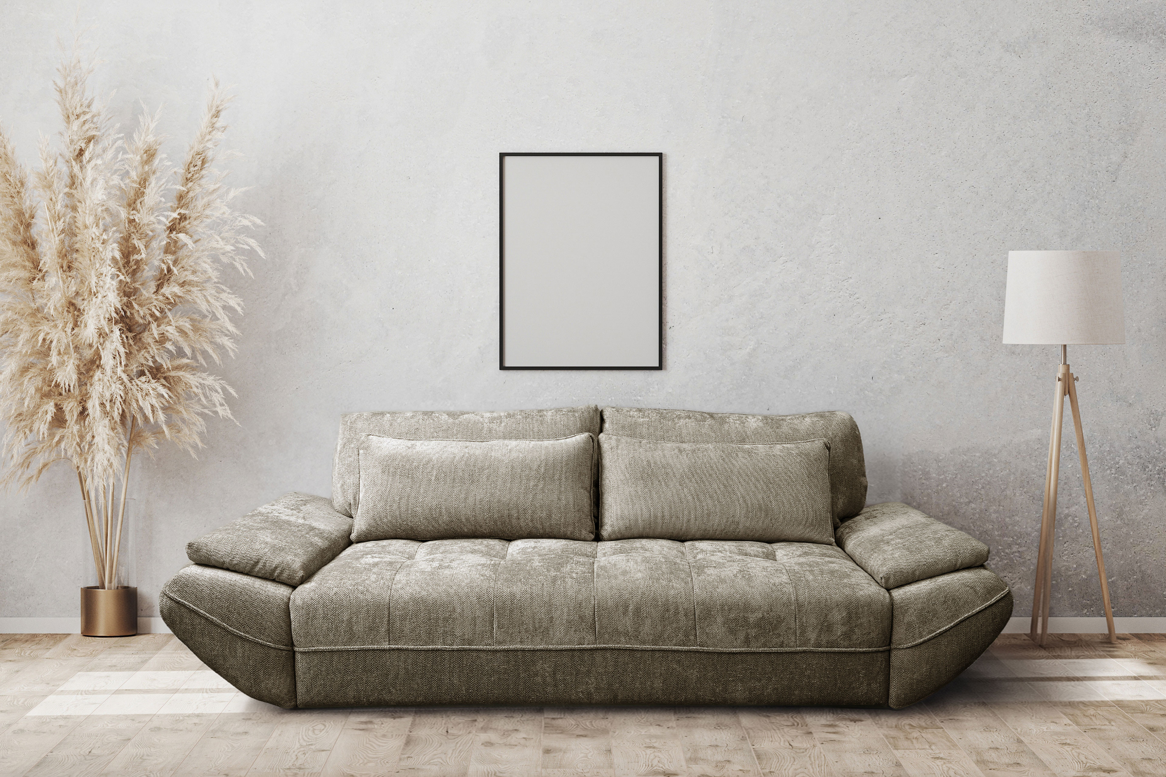 Dieses stilvolle Sofa in edlem Dunkelgrau vereint modernes Design mit durchdachter Funktionalität und ist die perfekte Wahl für alle, die ein elegantes Sitzmöbel sowie ein vollwertiges Gästebett in einem suchen. Mit seiner bodennahen, klaren Formgebung und dem hochwertigen Chenille-Flachgewebe fügt sich die Garnitur harmonisch in jeden Raum ein. Der Stoff unterstreicht nicht nur eine ruhige, zeitlose Wohnatmosphäre, sondern umschmeichelt auch mit seiner besonderen Haptik. Ob im Gästezimmer als Schlafmöglichkeit oder im Kinderzimmer als gemütliche Oase zum Spielen und Relaxen - die hochwertige Polsterung aus PUR-Schaum auf einer stabilen Wellenunterfederung garantiert Ihnen und Ihren Gästen stets optimalen Sitz- sowie Liegekomfort. Sollte sich spontan doch Übernachtungsbesuch ankündigen, zeigt das Möbelstück sein wahres Können: Mit nur wenigen Handgriffen verwandelt sich das Exxpo Sofa in einen komfortablen Schlafplatz mit einer großzügigen Liegefläche von etwa 200 x 160 cm. Äußerst praktisch ist dabei der clevere, integrierte Stauraum, in dem Bettzeug tagsüber unsichtbar verschwindet. Für die Extraportion Gemütlichkeit und eine einladende Optik sorgt das umfangreiche Zubehör, denn die passenden Rücken-, Nieren- sowie festen Armlehnenkissen sind im Lieferumfang bereits enthalten. So schaffen Sie rund um die Uhr einen Ort zum Abschalten. Elma-LE26 von Exxpo - tagsüber ein eleganter Blickfang, nachts eine herrlich bequeme Schlafoase.