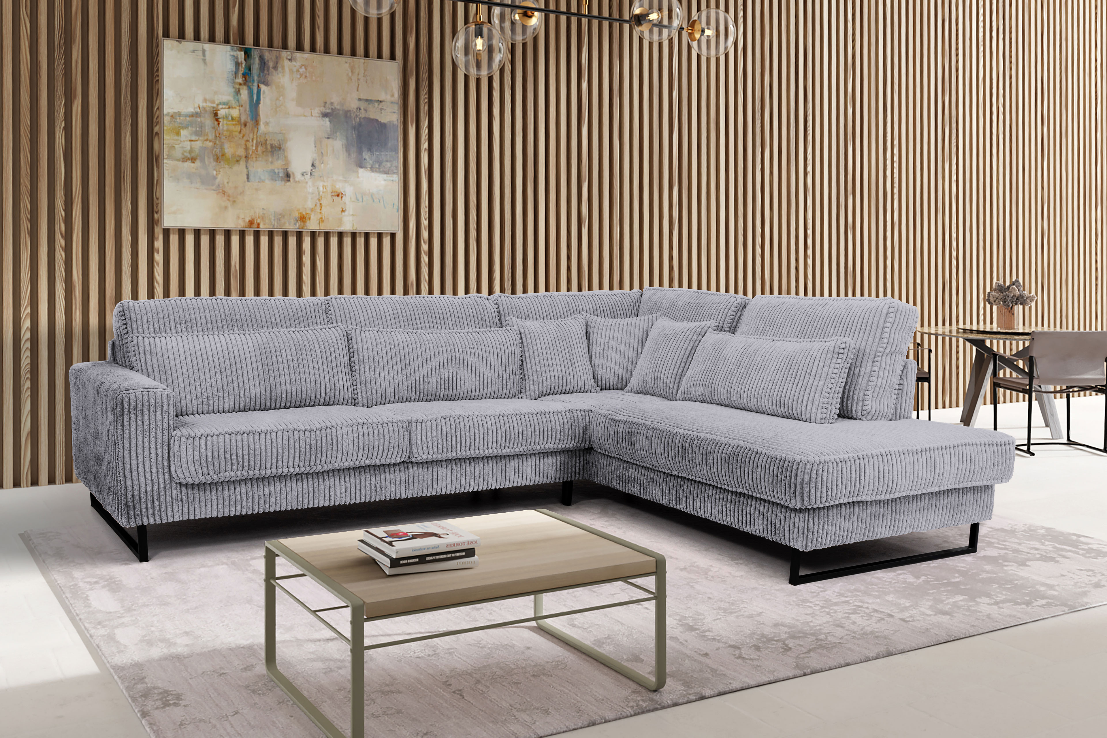 Die Kinder sind aus dem Haus? Dann ist jetzt endlich Schluss mit reiner Funktionalität - es ist Zeit, sich bei der Einrichtung ganz vom eigenen Stil leiten zu lassen. Mit dem Polstersofa Icon-LE26 holen Sie sich ein Möbelstück ins Wohnzimmer, welches nicht nur frischen Wind in Ihren Wohnbereich bringt, sondern auch kompromissloses Design vereint. Sobald Sie sich fallen lassen, umhüllt Sie die durchdachte Kombination aus hochwertigem Federkern und anschmiegsamem PUR-Schaum mit einem Sitzkomfort, der seinesgleichen sucht. Auf beeindruckenden ca. 284 x 253 cm bietet die Kombination aus 2,5-Sitzer und Ottomane jede Menge Raum zum Relaxen, während die großzügige Sitztiefe von etwa 90 cm zum gemütlichen Zurücklehnen einlädt. Trotz seiner Größe wirkt das Ecksofa herrlich leicht, was an den eleganten, schwarzen Metallfüßen liegt. Die beachtliche Bodenfreiheit sorgt für ein luftiges Raumgefühl und punktet zudem im Alltag: Ihr Staubsaugerroboter dreht hier mühelos seine Runden, sodass lästige Staubecken gar nicht erst entstehen. Gehüllt in angesagten, hellgrauen Cord und ausgestattet mit passenden Rücken-, Nieren- sowie Zierkissen, setzt das Exxpo Sofa optisch echte Akzente. Sollten Sie kein Fan von Cord sein oder eine hellere Nuance bevorzugen, ist auch dies kein Problem. Unter der Kategorie "Farbe ändern" finden Sie eine vielseitige Auswahl an alternativen Stoffen sowie Farben direkt vom Hersteller, um das Möbelstück genau an Ihre Wünsche anzupassen. Haben Sie sich verliebt? Dann machen Sie keine Kompromisse mehr und bestellen Sie Ihre neue Eckgarnitur Icon-LE26 noch heute.