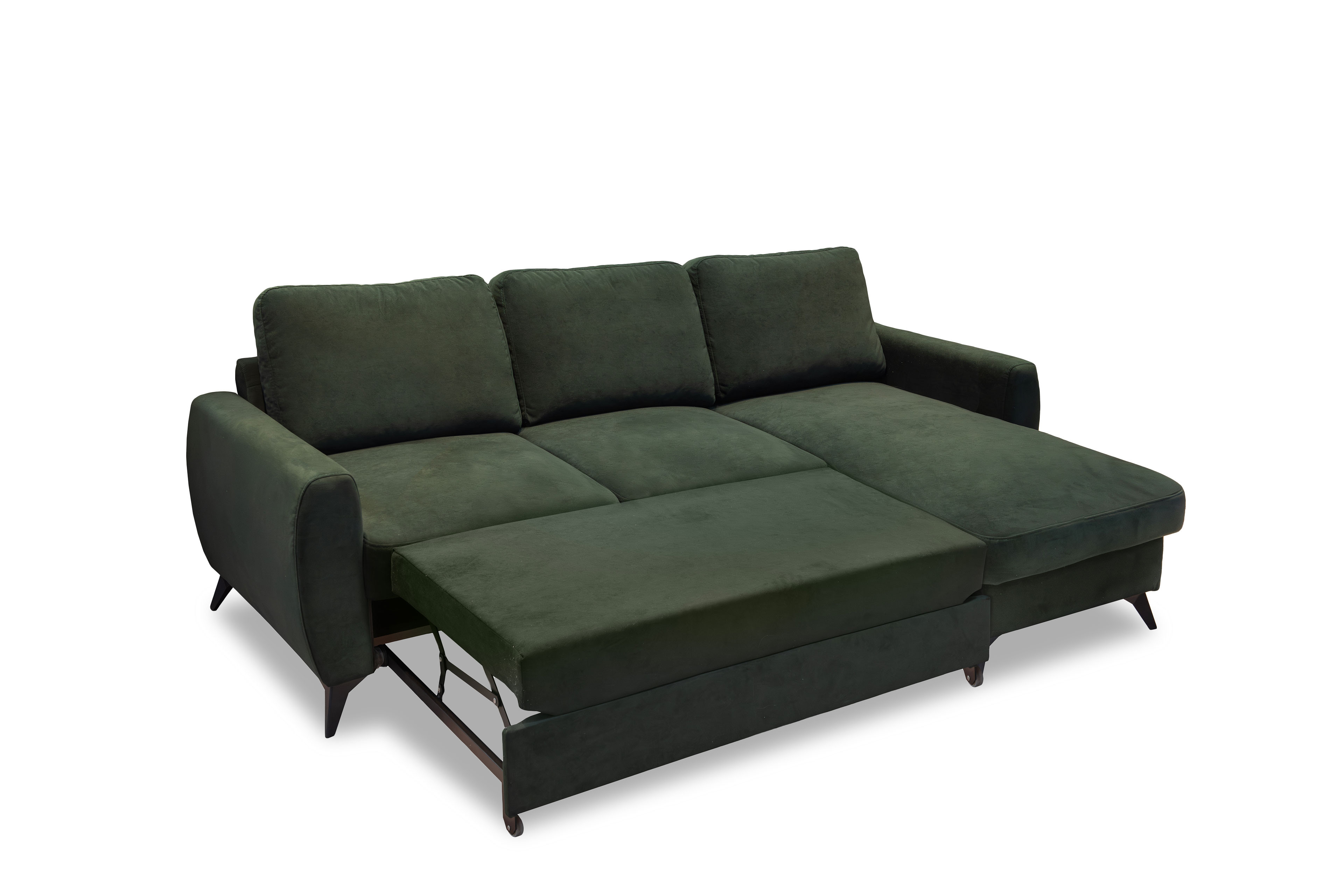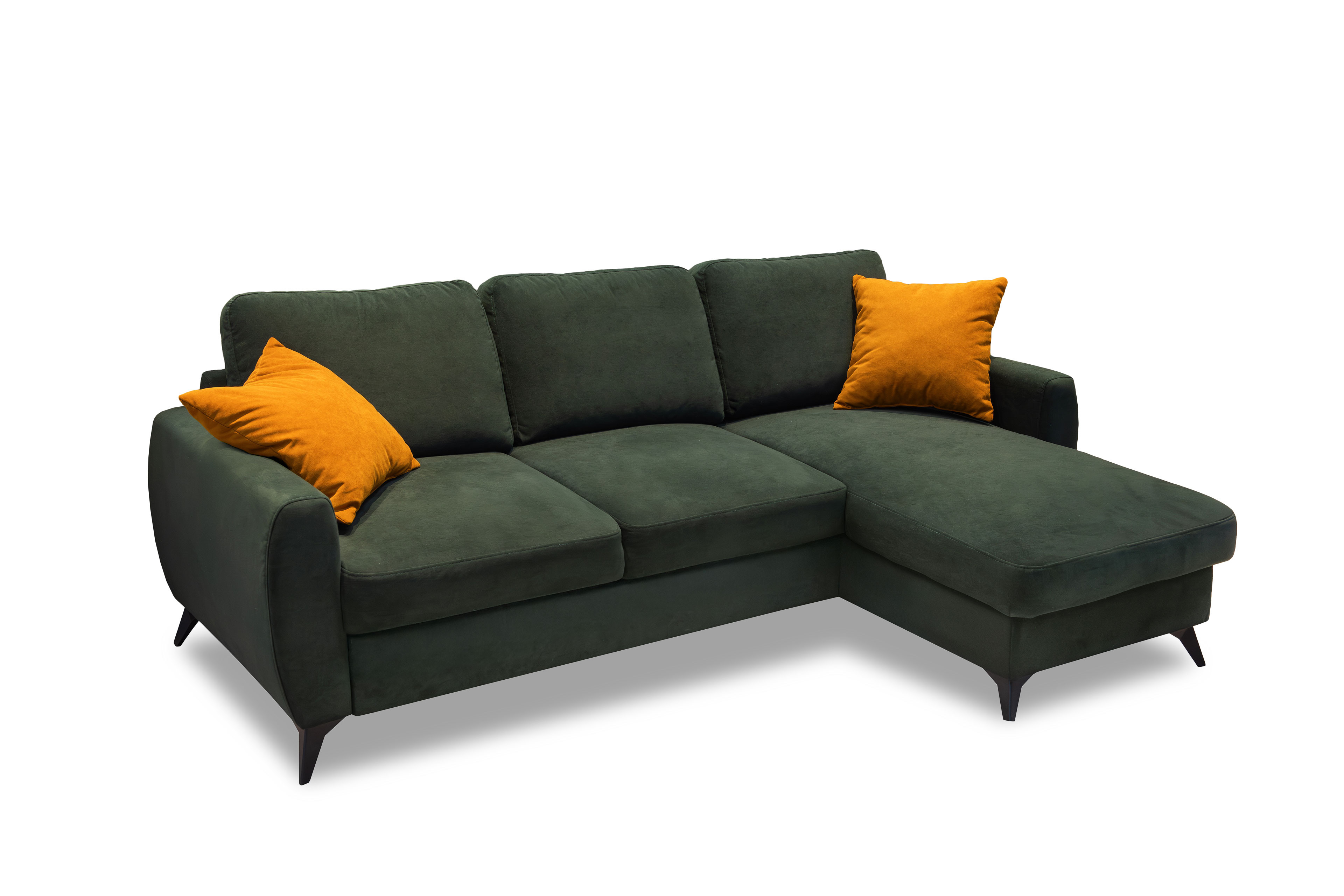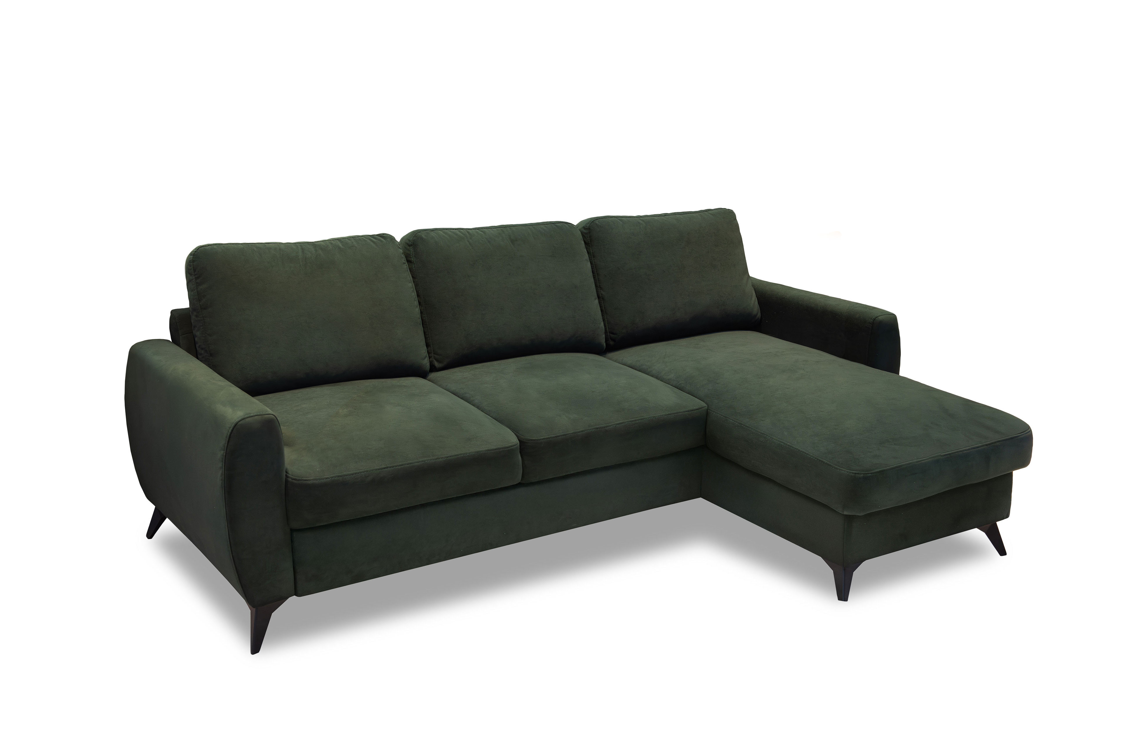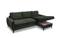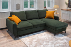 Ein Statement in Stil und Komfort - das ist das elegante Ecksofa Jeffrey von Exxpo. Mit seinem modernen Äußeren zieht es alle Blicke auf sich und verwandelt Ihr Wohnzimmer in eine stilvolle Wohlfühloase. In einen beeindruckenden grünen Bezug gehüllt, strahlt das Sofamodell Charakter, Tiefen und zeitlose Eleganz aus. Die kraftvolle Farbgebung harmoniert perfekt mit den schlanken schwarzen Kunststofffüßen, die dem Sofa eine zeitgemäße Leichtigkeit verleihen und das Design stilvoll abrunden. Neben ihrer ausdrucksstarken Optik überzeugt die Garnitur durch durchdachten Komfort auf höchstem Niveau. Die Polsterung aus PUR-Schaum auf einer Wellenunterfederung sorgt für ein besonders angenehmes Sitzgefühl mit optimaler Unterstützung. Die Kombination aus elastischer Federung und formstabilen Schaum schafft eine perfekte Balance zwischen sanftem Einsinken und stabiler Stützkraft - ideal für entspannte Stunden mit Familie und Freunden. Inklusive drei komfortablen Rückenkissen bietet die Couch zusätzlichen Gemütlichkeitsfaktor und lädt zum Zurücklehnen ein. Dank des im Rücken echt bezogenen Designs lässt es sich frei im Raum platzieren und es wirkt aus jeder Perspektive hochwertig und vollendet. Auch funktional lässt das Exxpo Ecksofa keine Wünsche offen: Der gemütliche 2-Sitzer verfügt über eine praktische Schlaffunktion, mit der sich im Handumdrehen eine komfortable Liegefläche von etwa 197 x 130 cm für Gäste schaffen lässt. Im Longchair versteckt sich zudem eine clevere Stauraumfunktion - perfekt, um Decken und Kissen ordentlich zu verstauen. Jeffrey von Exxpo vereint Design, Komfort und Funktionalität auf beeindruckende Weise und wird so zum Herzstück Ihres Wohnbereichs.