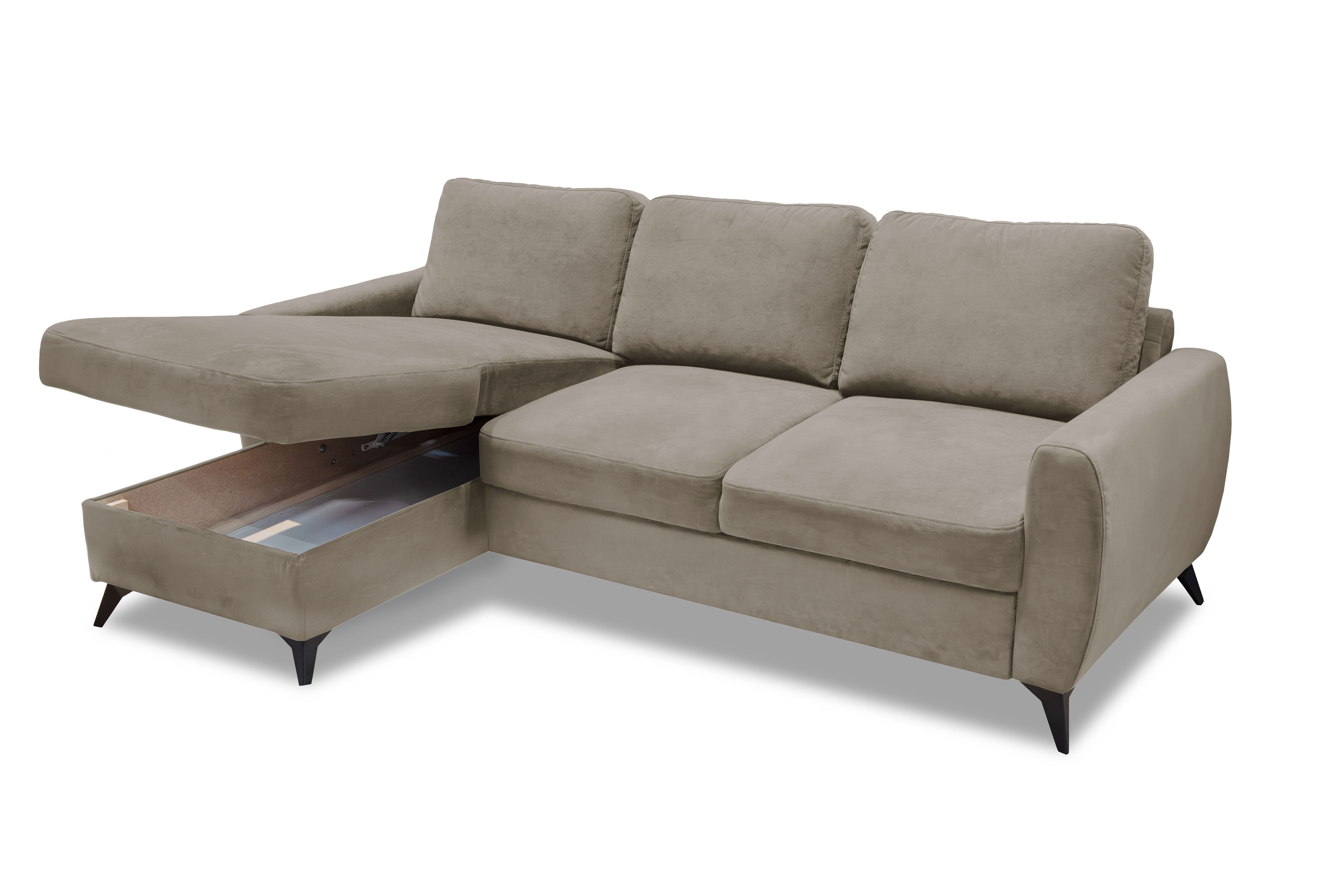 Ein Statement für Stil und Komfort - das ist das elegante Ecksofa Jeffrey von Exxpo. Mit seinem modernen Äußeren zieht es alle Blicke auf sich und verwandelt Ihr Wohnzimmer in eine stilvolle Wohlfühloase. In einen beeindruckenden taupefarbenen Bezug gehüllt, strahlt das Sofamodell Charakter, Tiefe und zeitlose Eleganz aus. Die kraftvolle Farbgebung harmoniert perfekt mit den schlanken schwarzen Kunststofffüßen, die dem Sofa eine zeitgemäße Leichtigkeit verleihen und das Design stilvoll abrunden. Neben ihrer ausdrucksstarken Optik überzeugt die Garnitur durch durchdachten Komfort auf höchstem Niveau. Die Polsterung aus PUR-Schaum auf einer Wellenunterfederung sorgt für ein besonders angenehmes Sitzgefühl mit optimaler Unterstützung. Die Kombination aus elastischer Federung sowie formstabilem Schaum schafft eine perfekte Balance zwischen sanftem Einsinken und stabiler Stützkraft - ideal für entspannte Stunden mit Familie und Freunden. Mit drei komfortablen Rückenkissen bietet die Couch ein zusätzlichen Gemütlichkeitsfaktor und lädt zum Zurücklehnen ein. Dank des im Rücken echt bezogenen Designs lässt es sich frei im Raum platzieren und wirkt aus jeder Perspektive hochwertig aber auch vollendet. Auch funktional lässt das Exxpo Ecksofa keine Wünsche offen: Der gemütliche 2-Sitzer verfügt über eine praktische Schlaffunktion, mit der sich im Handumdrehen eine komfortable Liegefläche von etwa 197 x 130 cm für Gäste schaffen lässt. Im Longchair versteckt sich zudem eine clevere Stauraumfunktion - perfekt, um Decken sowie Kissen ordentlich zu verstauen. Jeffrey von Exxpo vereint Design, Komfort und Funktionalität auf beeindruckende Weise und wird so zum Herzstück Ihres Wohnbereichs.