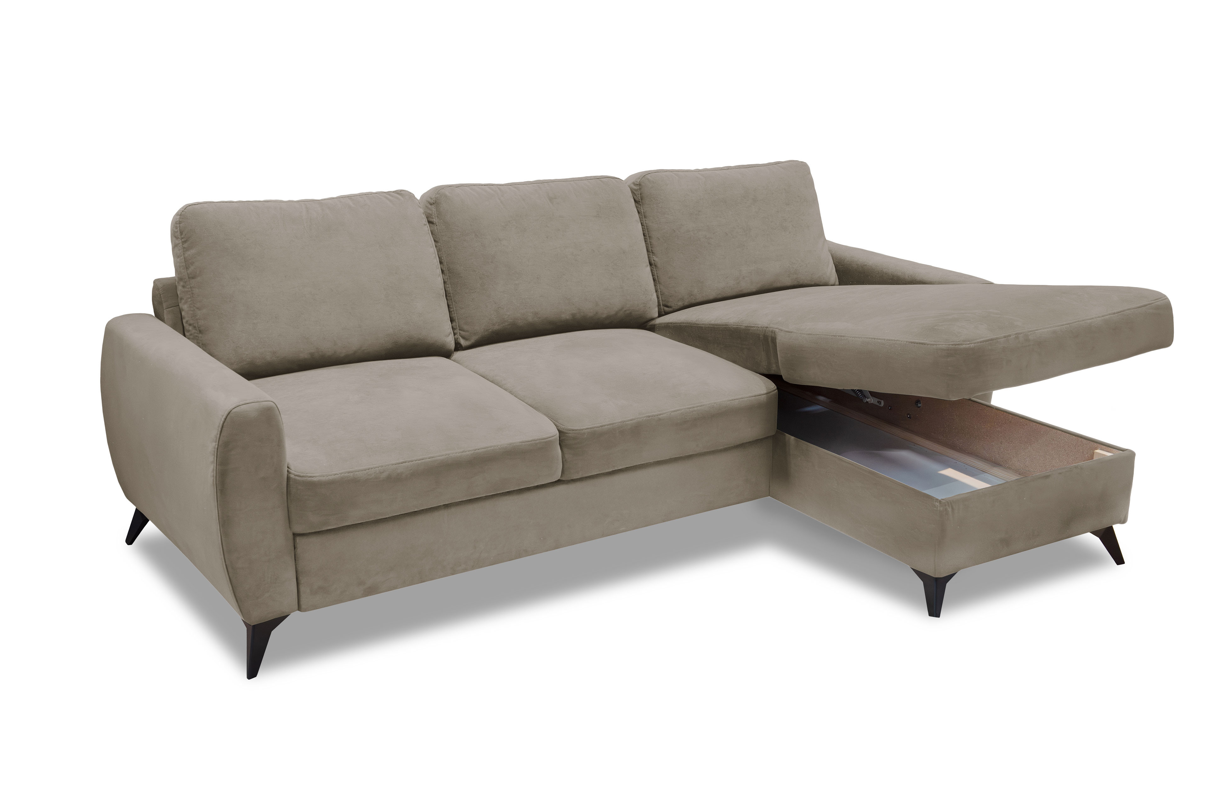 Ein Statement für Stil und Komfort - das ist das elegante Ecksofa Jeffrey von Exxpo. Mit seinem modernen Äußeren zieht es alle Blicke auf sich und verwandelt Ihr Wohnzimmer in eine stilvolle Wohlfühloase. In einen beeindruckenden taupefarbenen Bezug gehüllt, strahlt das Sofamodell Charakter, Tiefe und zeitlose Eleganz aus. Die kraftvolle Farbgebung harmoniert perfekt mit den schlanken schwarzen Kunststofffüßen, die dem Sofa eine zeitgemäße Leichtigkeit verleihen und das Design stilvoll abrunden. Neben ihrer ausdrucksstarken Optik überzeugt die Garnitur durch durchdachten Komfort auf höchstem Niveau. Die Polsterung aus PUR-Schaum auf einer Wellenunterfederung sorgt für ein besonders angenehmes Sitzgefühl mit optimaler Unterstützung. Die Kombination aus elastischer Federung sowie formstabilem Schaum schafft eine perfekte Balance zwischen sanftem Einsinken und stabiler Stützkraft - ideal für entspannte Stunden mit Familie und Freunden. Mit drei komfortablen Rückenkissen bietet die Couch ein zusätzlichen Gemütlichkeitsfaktor und lädt zum Zurücklehnen ein. Dank des im Rücken echt bezogenen Designs lässt es sich frei im Raum platzieren und wirkt aus jeder Perspektive hochwertig aber auch vollendet. Auch funktional lässt das Exxpo Ecksofa keine Wünsche offen: Der gemütliche 2-Sitzer verfügt über eine praktische Schlaffunktion, mit der sich im Handumdrehen eine komfortable Liegefläche von etwa 197 x 130 cm für Gäste schaffen lässt. Im Longchair versteckt sich zudem eine clevere Stauraumfunktion - perfekt, um Decken sowie Kissen ordentlich zu verstauen. Jeffrey von Exxpo vereint Design, Komfort und Funktionalität auf beeindruckende Weise und wird so zum Herzstück Ihres Wohnbereichs.