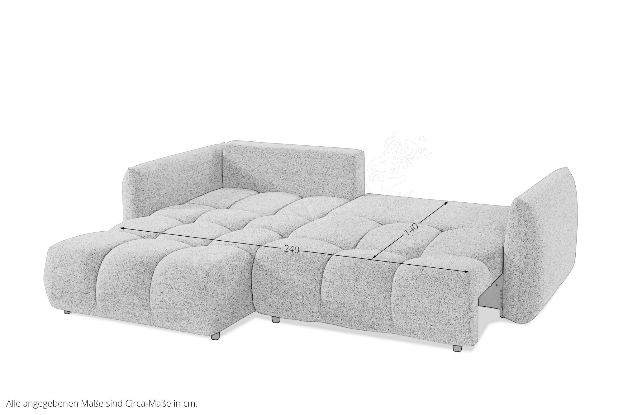 Manchmal braucht es nur ein einziges Möbelstück, um einem Raum Charakter zu verleihen - das Polstersofa Livonia von Exxpo ist so ein Statement. Mit seiner stilvollen Optik sowie modernen Erscheinung verbindet es zeitgemäßes Design mit durchdachter Funktionalität und wird damit zum Mittelpunkt jedes Wohnbereichs. Die harmonische Kombination aus einem großzügigen Longchair und einem komfortablen 2-Sitzer schafft eine einladende Wohnlandschaft, die optisch wie auch praktisch überzeugt. Klare Strukturen und sanft abgerundete Formen verleihen dem Polstermodell eine elegante, ruhige Ausstrahlung. Dank des echt bezogenen Rückens lässt sich Livonia frei im Raum platzieren, wahlweise auch als stilvoller Raumtrenner in einem offenen Wohn- und Essbereich oder mittig vor einer großen Fensterfront, wo es seine Wirkung voll entfalten kann. Mit nur wenigen Handgriffen verwandelt es sich in eine komfortable Schlaffläche von ca. 240 x 140 cm und bietet damit ausreichend Platz für Übernachtungsgäste. Der integrierte Bettkasten sorgt zusätzlich für Ordnung und bietet praktischen Stauraum für Decken, Kissen oder Bettwäsche - alles verschwindet ruckzuck und schafft eine aufgeräumte Atmosphäre. Mit einem Stellmaß von etwa 187 x 288 cm bietet die Exxpo Garnitur großflächigen Sitzkomfort, ohne dabei zu wuchtig zu wirken. Die hochwertige Polsterung aus PUR-Schaum sorgt für ein angenehmes Sitzgefühl und unterstützt entspanntes Verweilen - ob beim Lesen, beim Filmabend oder beim geselligen Beisammensein mit Familie und Freunden. Die Couch Livonia von Exxpo steht für stilvolles Wohnen, durchdachte Funktion und zeitlose Eleganz - ein Möbelstück, das Design sowie Alltag auf perfekte Weise miteinander vereint.