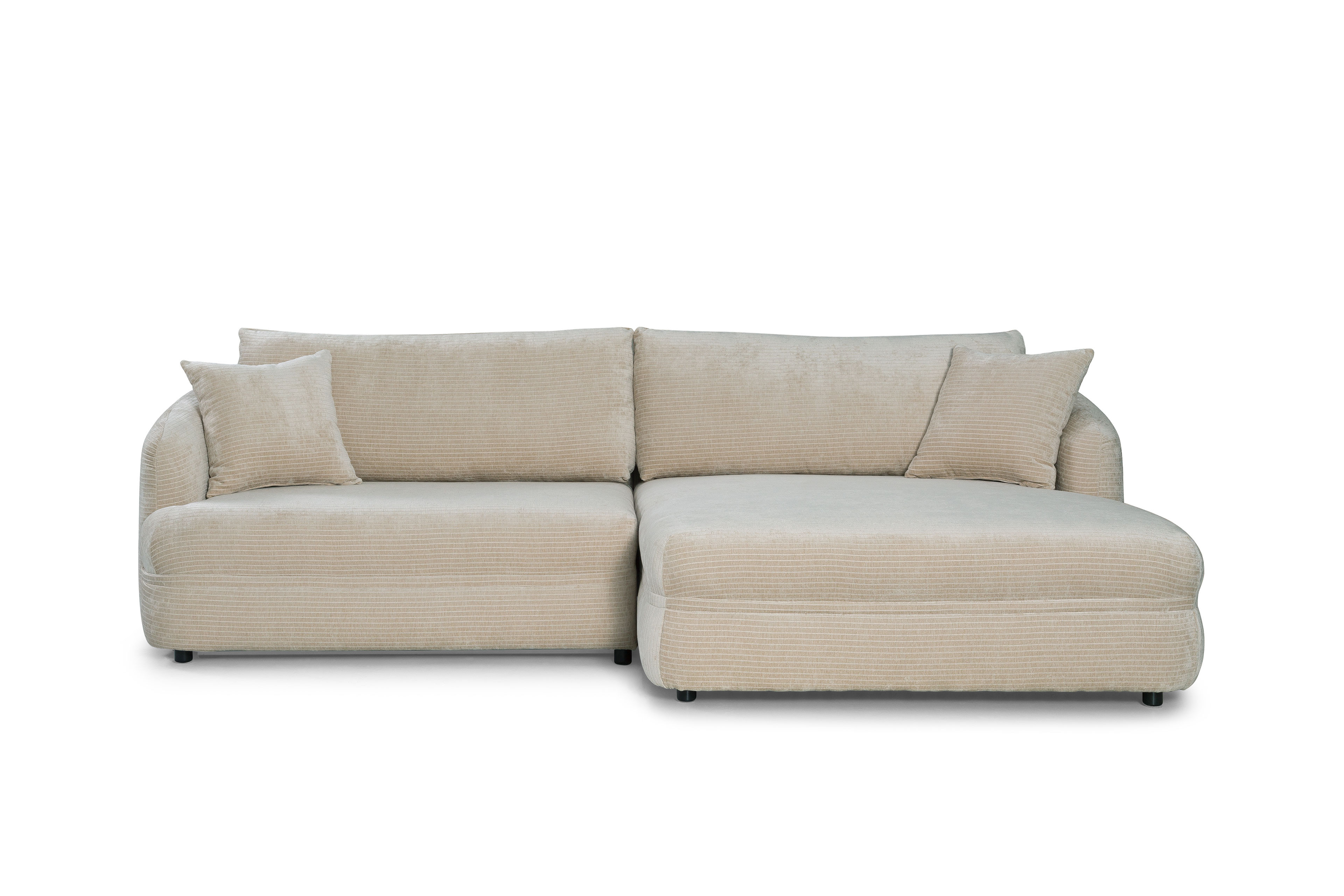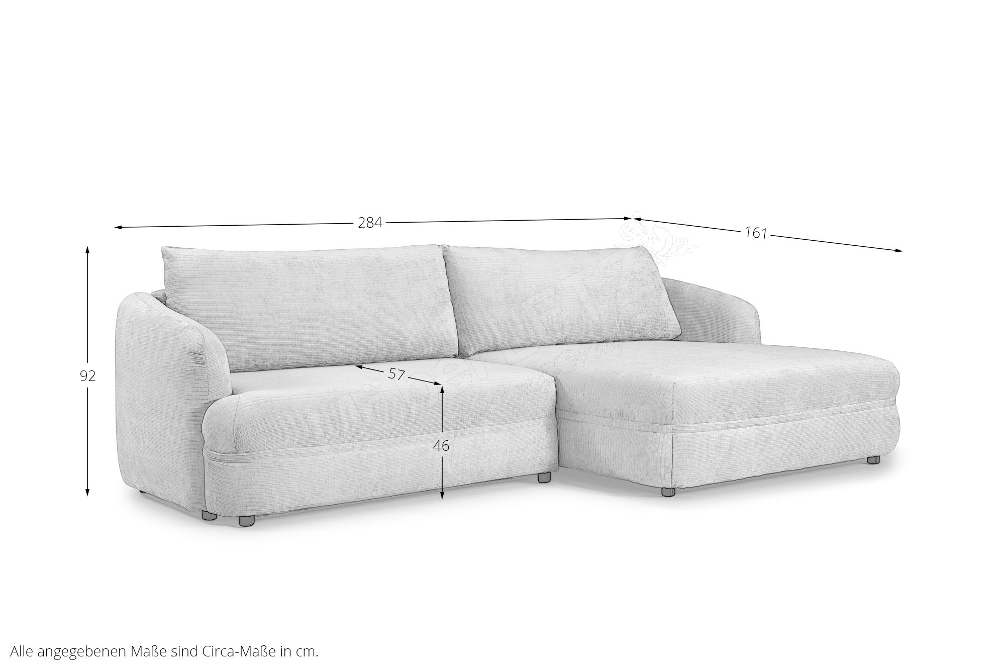 Lassen Sie sich fallen - in eine Wolke aus Komfort und Gemütlichkeit, mit der Eckcouch Lush aus dem Hause Exxpo, eine stilvolle Optik vereint mit funktionaler Raffinesse. Mit seinem weichen Chenille-Flachgewebe im Farbton Snow lädt dieses Möbelstück zum Wohlfühlen ein und sorgt für eine besondere Atmosphäre in Ihrem Zuhause. Die hochwertige sowie weiche Polsterung der Sitz- sowie Rückkissen bieten optimalen Halt und sind gleichzeitig wunderbar anschmiegsam - perfekt zum Anlehnen, Entspannen sowie Abschalten. Das Ergebnis, eine Wolke zum Sitzen, in die man sich am liebsten sofort hineinkuscheln möchte. Mit seinem Stellmaß von etwa 284 x 161 cm bietet das Sofa ausreichend Platz für gesellige Abende oder entspannte Stunden allein. Ein besonderer Höhepunkt ist die integrierte Schlaffunktion mit praktischem Stauraum. Im Handumdrehen verwandeln Sie das Sofa in eine großzügige Liegefläche von circa 241 x 133 cm - perfekt, wenn der Besuch spontan über Nacht bleiben möchte. Dabei finden Decken, Kissen und Bettwäsche diskret ihren Platz im Stauraumfach. Getragen von schwarzen Kunststofffüßen, fügt sich das Exxpo Sofa harmonisch in jede Einrichtung ein. Für ein besonders harmonisches Gesamtbild sind passende Zierkissen optional erhältlich, die das wohnliche Ambiente stilvoll unterstreichen.