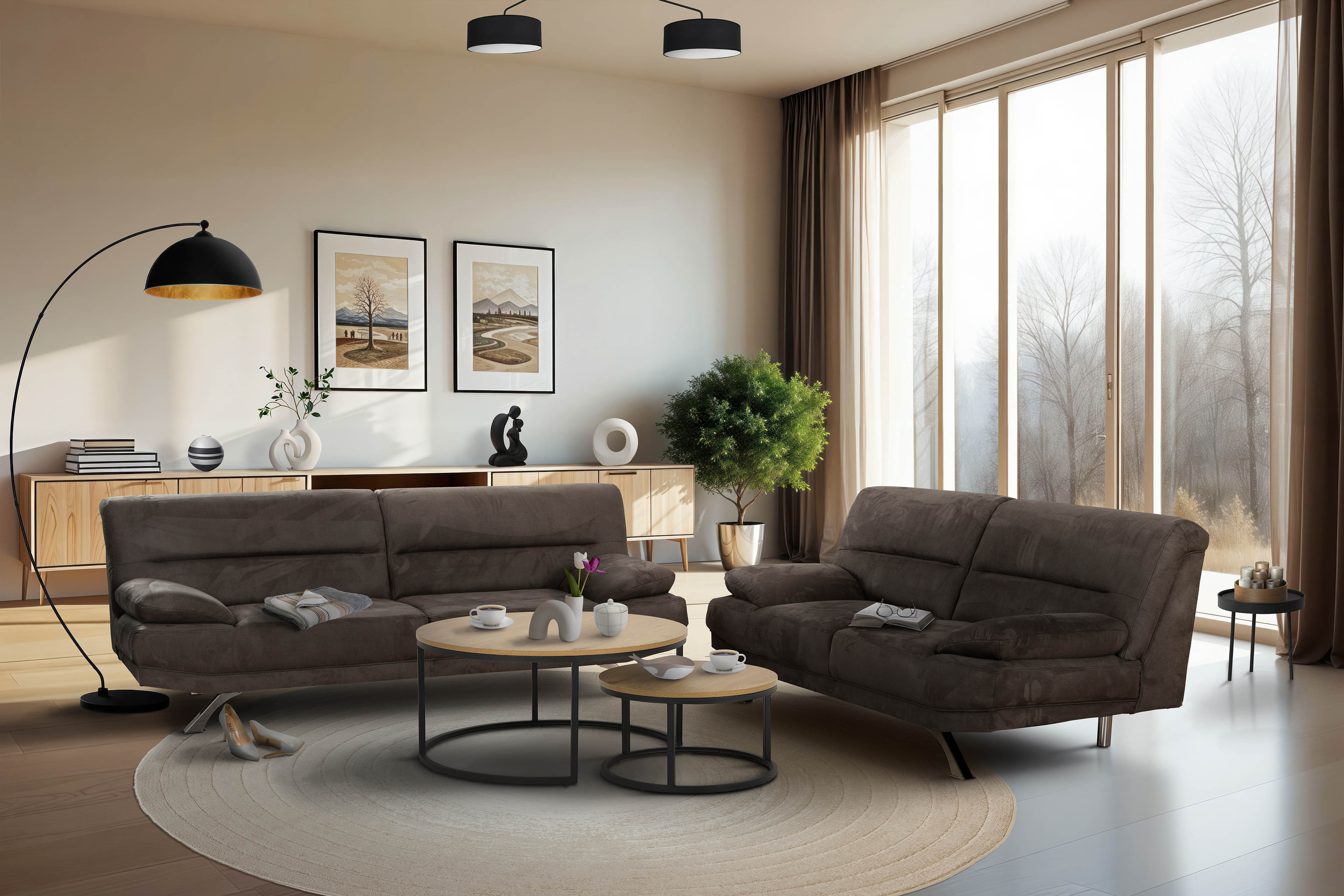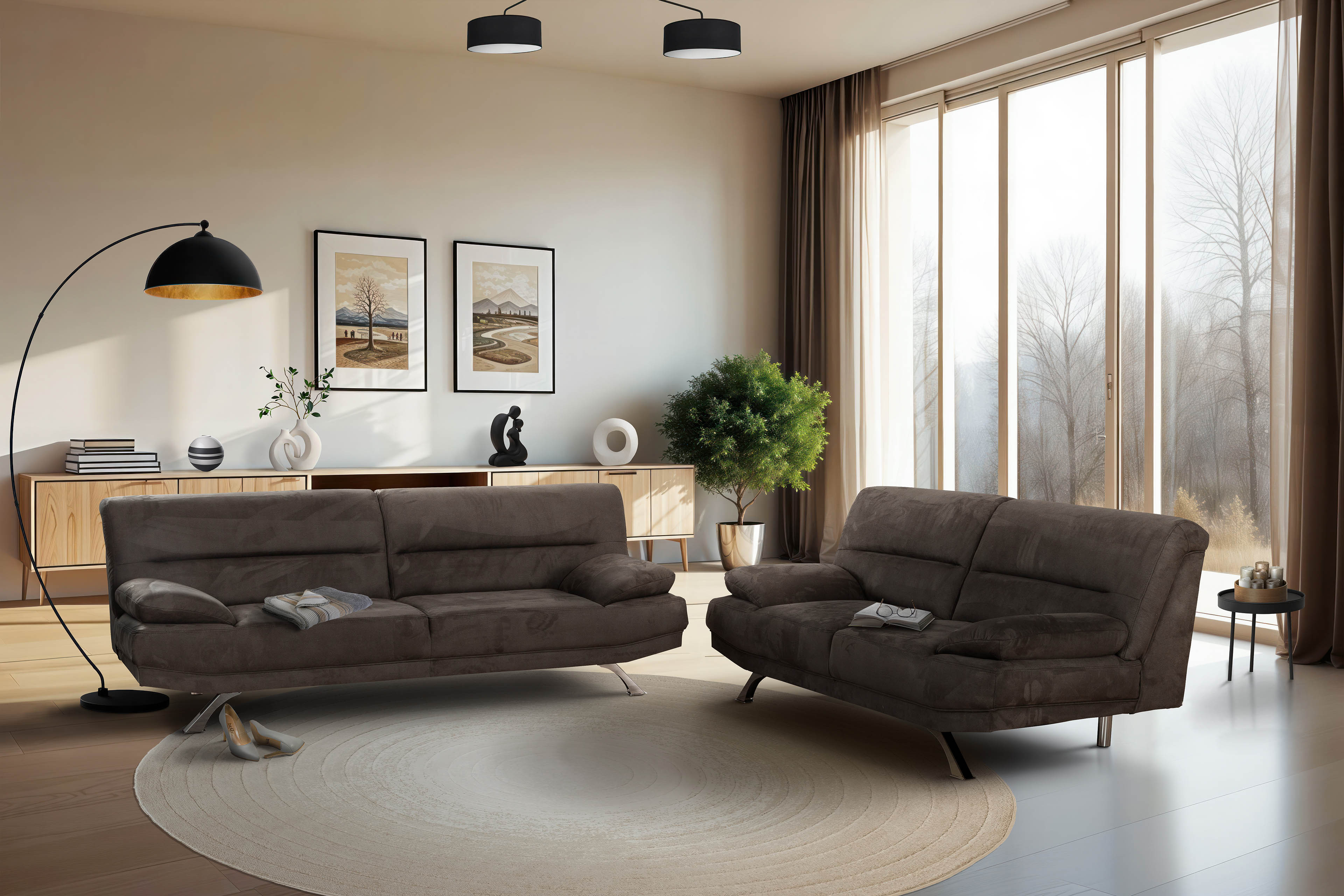 Zeitlos, elegant und zu jedem Einrichtungsambiente passend - Bruno-LE18 aus dem Hause Grant Factory. Bestehend aus einem 3-Sitzer sowie einem 2-Sitzer, ist diese Polstergarnitur der ideale Begleiter für Jung und Alt. Egal, ob als attraktive Sitzgruppe für das Büro, Jugend- oder Gästezimmer, vielleicht aber auch als charmante Sitzgelegenheit für das Wohnzimmer, Bruno-LE18 sorgt mit seinem zeitlosen Microfaserbezug in Grau sowie den verchromten Metallfüßen für den nötigen Chic und kann dank des echt bezogenen Rückens individuell im Raum platziert werden. Kommen Sie nach einem erfolgreichen Arbeitstag nach Hause, gönnen Sie sich einen leckeren Cappuccino und lassen Sie sich von Ihrer neuen Errungenschaft in den Feierabend begleiten. Eine Kaltschaumpolsterung auf einer Nosagfederung unterstützt Ihren Wohlfühlkomfort und lädt zum Verweilen, Entspannen sowie Relaxen ein. Mit einer zusätzlichen Hockerbank haben Sie weiter die Möglichkeit, Ihre müden Beine hochzulegen und sich in eine angenehme Liegeposition zu begeben. Machen Sie Bruno-LE18 zu Ihrem Lieblingsplatz und genießen Sie angenehme Stunden in Ihrer Ruhezone. Falls Ihnen der dunkle Farbton der Sitzgruppe nicht zusagt, dann steht Ihnen unter der Rubrik "Farbe ändern" eine großzügige Bezugsauswahl zur Verfügung, mit der Sie Ihre neue Grant Factory Garnitur ganz nach Ihrem Geschmack und zu Ihrem Wohnraum passend gestalten können. Stilsicherer Look, ausgezeichnete Qualität - Bruno-LE18 von Grant Factory.