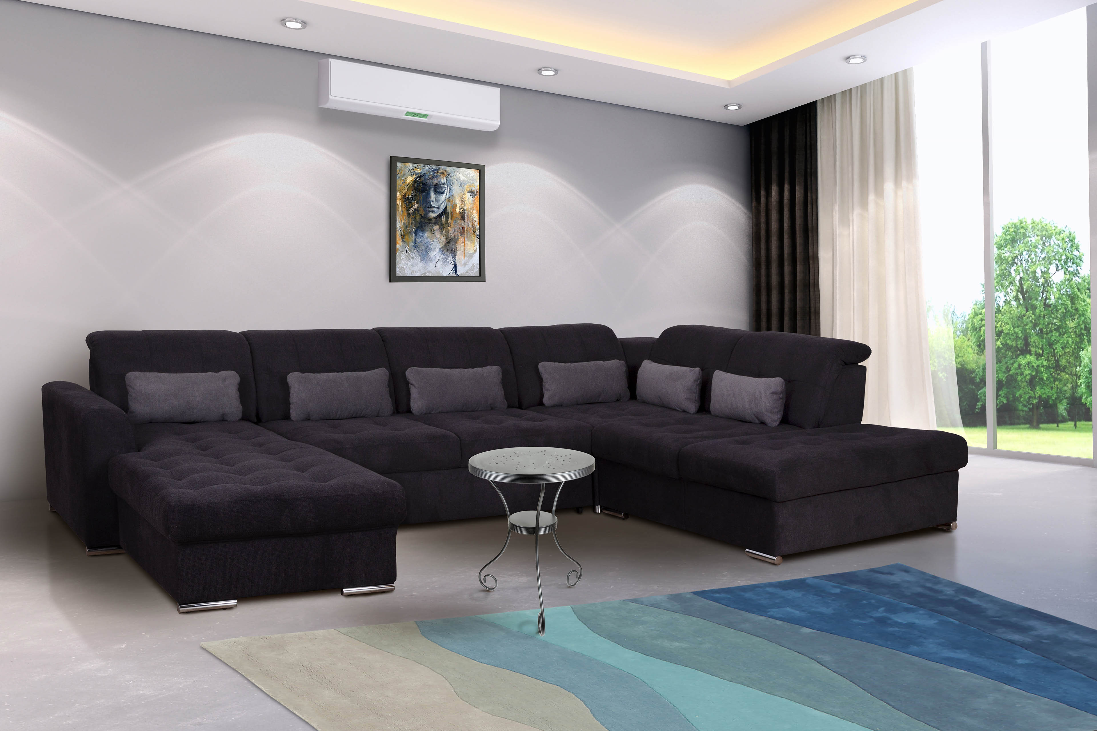 Sie sind auf der Suche nach einer bequemen Polstergarnitur, auf der Sie nach einem langen Arbeitstag wunderbar entspannen und den Alltagsstress einfach für einen Moment vergessen können? Dann entscheiden Sie sich für das Modell Delta-LE23 von Grant Factory. Ein grauer Flockstoff-Bezug kleidet diese Sofalandschaft, welche durch ihr zeitloses Design perfekt mit nahezu vielen Einrichtungsstilen kombiniert werden kann. Egal, ob Landhausstil, Wohnungen mit rustikalem Charme oder modern eingerichtete Räume - die Wohnlandschaft passt einfach zu jedem Ambiente. Das aus einer 1-sitzigen Ottomane, einem 3-Sitzer-Zwischenelement, einer Ecke sowie einer Ottomane bestehende Sofa hält Ihnen auf einem Stellmaß von etwa 208 x 348 x 245 cm nicht nur genügend Sitzgelegenheiten für Sie und Ihre Gäste bereit, sondern lässt sich dank des Rückens im Originalbezug individuell in jeden Raum integrieren. Bei einem Kaffee mit der besten Freundin, einem Drink am Wochenende mit den Kumpels oder auch bei einem gemütlichen Filmabend mit der Familie wird Ihnen stets ein ausgezeichneter Sitzkomfort, hervorgerufen durch eine Kaltschaumpolsterung mit wunderschön gesteppter Sitzfläche, geboten, der durch die integrierte Kopfteilverstellung zusätzlich verstärkt wird. Wohlfühlen wird hier groß geschrieben! Sie möchten auf funktionale Highlights nicht verzichten? Dann statten Sie doch das 3-Sitzer-Zwischenelement mit einer Schlaffunktion aus und ermöglichen Sie Ihren Gästen eine erholsame Nacht. Zwei hinzubuchbare Bettkästen stellen Ihnen genügend Stauraum für Utensilien zur Verfügung und können, neben einem passenden Hocker, direkt über unsere Zusatzoptionen gewählt werden. Weiterhin steht Ihnen eine große Auswahl an weiteren Bezugs- und Farbvarianten zur Verfügung, mit der Sie Ihre neue Grant Factory Garnitur ganz nach Ihrem Geschmack gestalten können. Warten Sie nicht lange und bestellen Sie noch heute Delta-LE23 in U-Form.