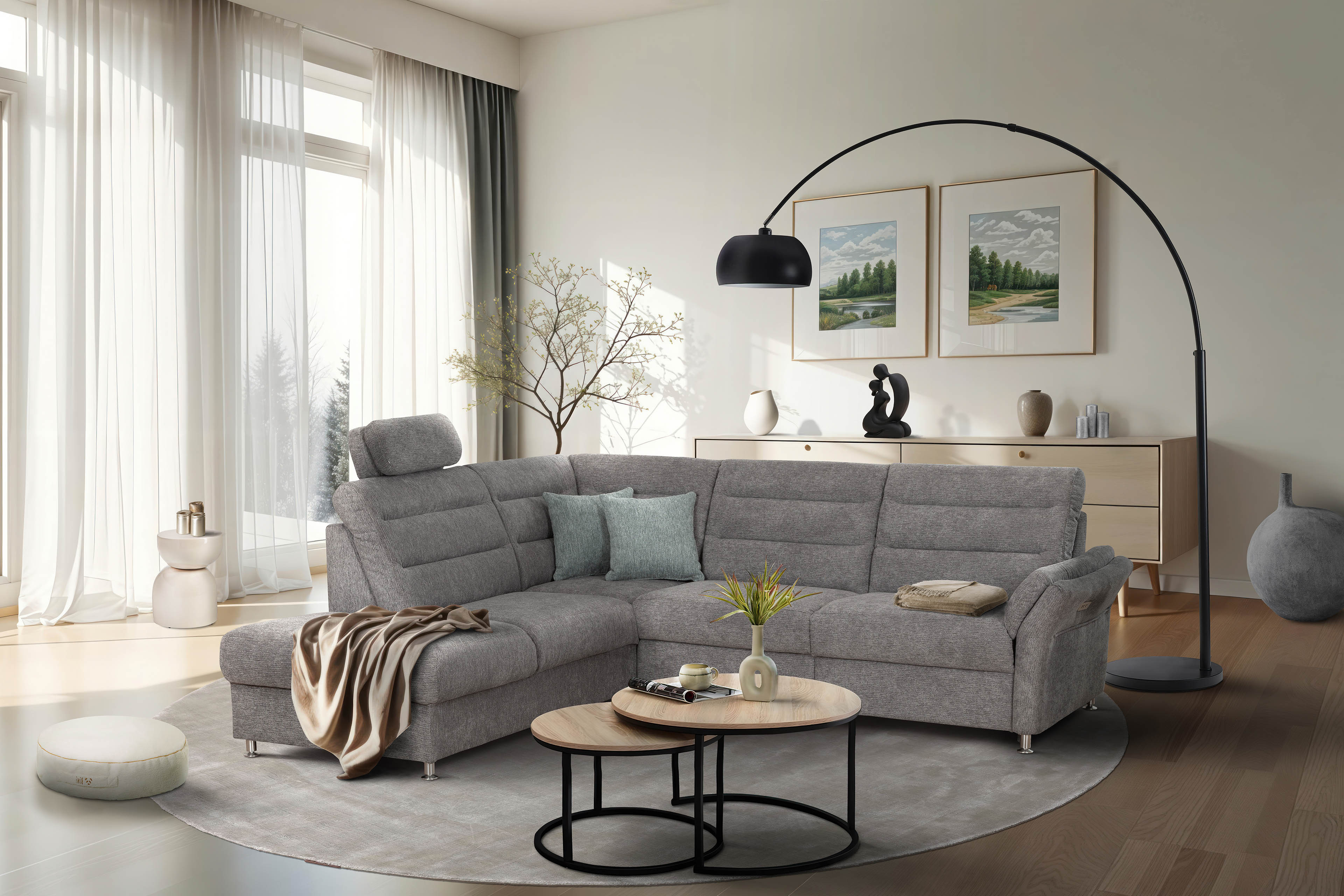 Sie wünschen sich eine Polstergarnitur, die sich nicht nur in jedes Wohnambiente perfekt einfügt, sondern auch genug Platz für alle Familienmitglieder bereithält? Dann finden Sie vielleicht in dem Grant Factory Ecksofa Foreno Ihren neuen Begleiter. Bezogen mit einem grauen Chenille-Flachgewebe, welches vor allem besonders pflegeleicht ist, sowie stehend auf alufarbigen Metallfüßen, kann das Sofa mit nahezu jedem Einrichtungsstil kombiniert werden. Mit einem Stellmaß von ca. 225 x 268 cm hält es ausreichend Fläche für gemeinsame Kuscheleinheiten mit den Kindern bereit, eignet sich aber auch besonders gut für gesellige Spieleabende mit Freunden, da hier garantiert jeder einen Sitzplatz zum Wohlfühlen findet. Erholsamen Komfort schenkt Ihnen eine Polsterung aus hochwertigem Kaltschaum, welche auf Nosagfedern ruht - einmal die Lieblingsposition eingenommen und Sie möchten nicht mehr aufstehen. Wie wäre es, am Nachmittag nach Hause zu kommen, sich auf seiner Neuanschaffung niederzulassen, gemütlich die Beine auszustrecken, dabei in Träumen zu versinken und den Stress des Alltags zu vergessen? Dann statten Sie die Eckgarnitur mit einer motorischen Relaxfunktion im äußeren Sitz des 3-Sitzers aus. Als weiteres Highlight stehen Ihnen in den Zusatzoptionen praktische Kopfstützen, ein quadratischer Hocker oder eine Hockerbank, die wahlweise mit Stauraum erhältlich ist, zur Verfügung. Foreno von Grant Factory hat Sie überzeugt? Dann bestellen Sie noch heute Ihr neues Traumsofa.