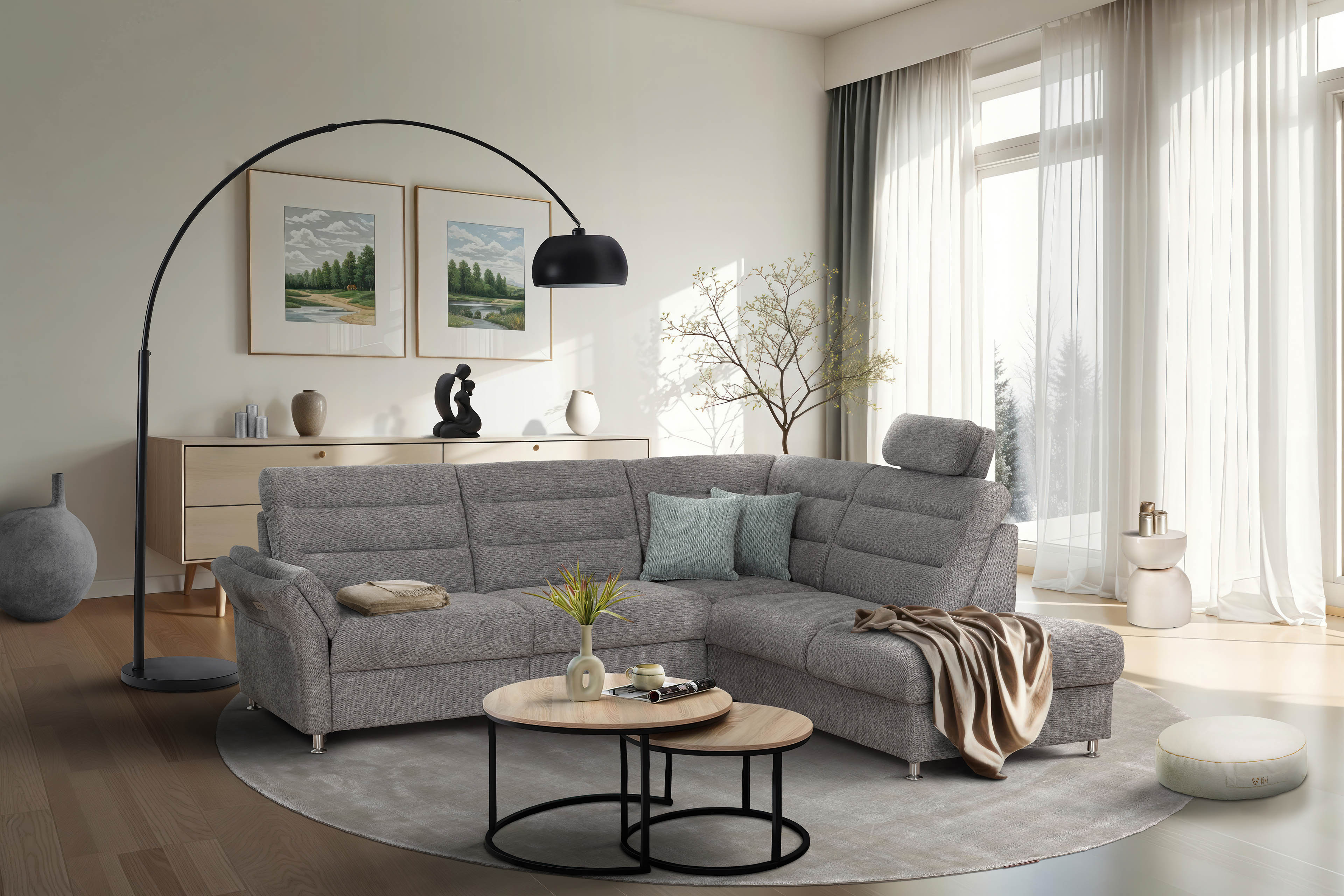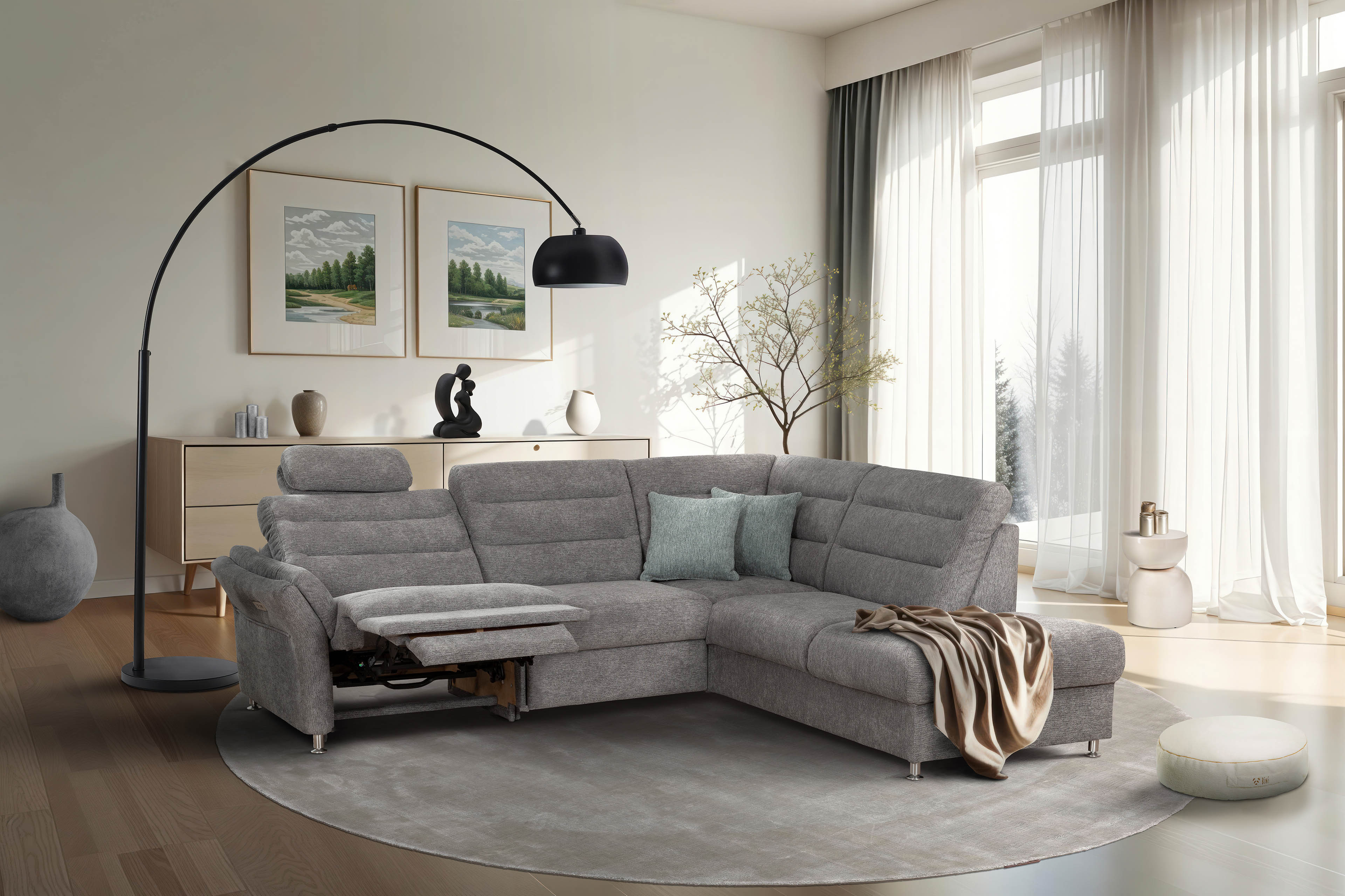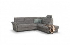 Sie wünschen sich eine Polstergarnitur, die sich nicht nur in jedes Wohnambiente perfekt einfügt, sondern auch genug Platz für alle Familienmitglieder bereithält? Dann finden Sie vielleicht in dem Grant Factory Ecksofa Foreno Ihren neuen Begleiter. Bezogen mit einem grauen Chenille-Flachgewebe, welches vor allem besonders pflegeleicht ist, sowie stehend auf alufarbigen Metallfüßen, kann das Sofa mit nahezu jedem Einrichtungsstil kombiniert werden. Mit einem Stellmaß von ca. 268 x 225 cm hält es ausreichend Fläche für gemeinsame Kuscheleinheiten mit den Kindern bereit, eignet sich aber auch besonders gut für gesellige Spieleabende mit Freunden, da hier garantiert jeder einen Sitzplatz zum Wohlfühlen findet. Erholsamen Komfort schenkt Ihnen eine Polsterung aus hochwertigem Kaltschaum, welche auf Nosagfedern ruht - einmal die Lieblingsposition eingenommen und Sie möchten nicht mehr aufstehen. Wie wäre es, am Nachmittag nach Hause zu kommen, sich auf seiner Neuanschaffung niederzulassen, gemütlich die Beine auszustrecken, dabei in Träumen zu versinken und den Stress des Alltags zu vergessen? Dann statten Sie die Eckgarnitur mit einer motorischen Relaxfunktion im äußeren Sitz des 3-Sitzers aus. Als weiteres Highlight stehen Ihnen in den Zusatzoptionen praktische Kopfstützen, ein quadratischer Hocker oder eine Hockerbank, die wahlweise mit Stauraum erhältlich ist, zur Verfügung. Foreno von Grant Factory hat Sie überzeugt? Dann bestellen Sie noch heute Ihr neues Traumsofa.