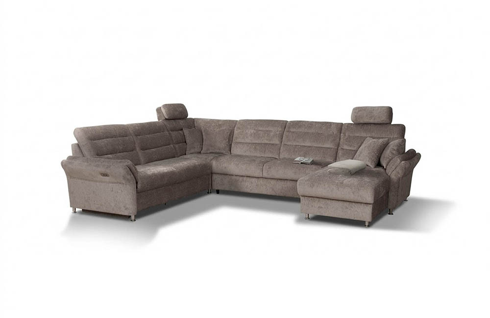 Foreno von Grant Factory - erleben Sie das Gefühl von echter Geborgenheit und Zuhause. Mit diesem besonderen Modell holen Sie sich nicht nur ein Sofa ins Haus, sondern ein Lebensgefühl, das Komfort und Stil auf beeindruckende Weise vereint. Ein außergewöhnliches Design trifft hier auf ein Versprechen von wohltuender Heimeligkeit. Mit großzügigen Maßen von etwa 268 x 350 x 165 cm bildet diese beeindruckende Komposition aus einem 3-Sitzer, einer Ecke, einem 3-sitzigen Zwischenelement und einer Ottomane den idealen Mittelpunkt für jedes Wohnzimmer. Ob gemütliche Stunden zu zweit, entspannte Zeit für sich selbst oder gesellige Abende mit Familie und Freunden - Foreno schafft Raum für unvergessliche Erlebnisse. Platz für herzhaftes Lachen, tiefsinnige Gespräche, unterhaltsame Spieleabende oder fesselnde Filmnächte ist garantiert. Hier findet jeder seinen perfekten Ort, um dem Alltag zu entfliehen, den Stress abfallen zu lassen und sich einfach zu erholen. Der Sitzkomfort sucht dabei seinesgleichen: Die hochwertige Kaltschaumpolsterung auf langlebigen Nosagfedern bietet eine unvergleichliche Bequemlichkeit, die Ihre persönlichen Ruhemomente zu etwas ganz Besonderem macht. Im Nu wird die Wohnlandschaft zur Wohlfühloase, einem Rückzugsort, um entspannte Abende bei einem Glas Wein oder einem guten Buch zu genießen. Auch visuell überzeugt Foreno auf ganzer Linie. Das samtig-weiche braune Chenille-Flachgewebe sorgt für eine moderne und dennoch behagliche Ausstrahlung. Die alufarbigen Metallfüße unterstreichen die Eleganz der Grant Factory Garnitur, geben ihr eine schwebende Leichtigkeit und setzen stilvolle Akzente im Raum. Sollte Grau nicht ganz Ihrem Geschmack entsprechen, eröffnet das Modell Ihnen grenzenlose Möglichkeiten zur Individualisierung. Unter der Rubrik "Farbe ändern" finden Sie eine breite Palette an Farben und Stoffen. Gestalten Sie Ihr persönliches Traumsofa, das perfekt zu Ihrem Wohnraum passt und Ihren individuellen Stil zum Ausdruck bringt - ganz so einzigartig wie Sie selbst. Das Highlight für Entspannungsliebhaber: Eine optionale motorisierte Relaxfunktion am äußeren Sitz des 3-Sitzers. Mit einer sanften Berührung des Touch-Feldes an der Armlehne gleiten Sie mühelos in eine komfortable Liegeposition. Genießen Sie beispiellose Wohlfühlmomente und spüren Sie, wie Körper sowie Geist zur Ruhe kommen. So starten Sie gestärkt und voller Energie in neue Abenteuer des Alltags. Foreno von Grant Factory - der neue Lieblingsplatz in Ihrem Zuhause wartet bereits auf Sie.