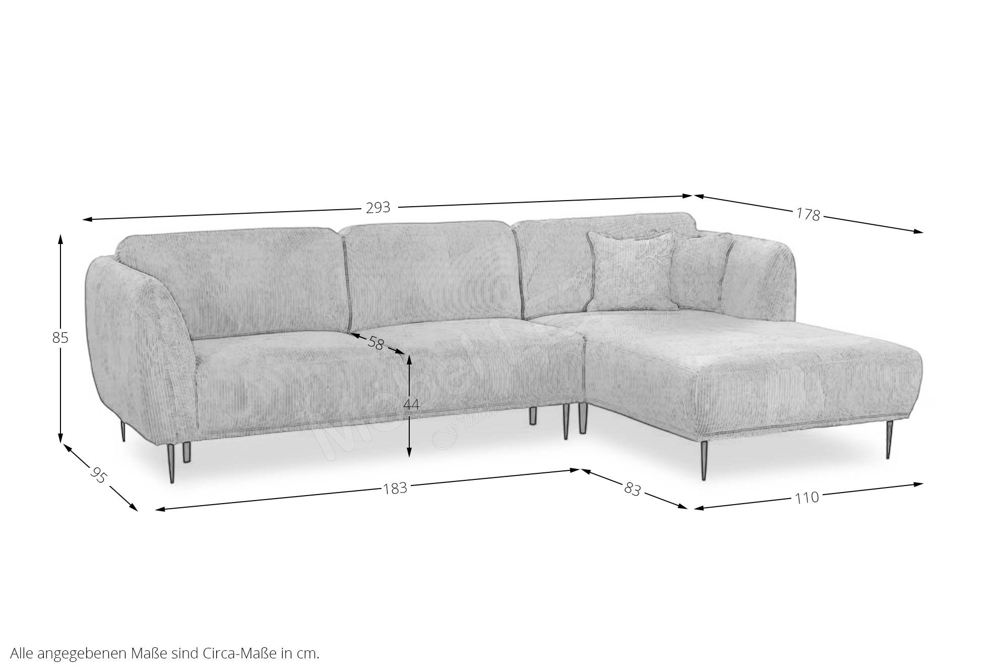 Setzen Sie farbliche Akzente in Ihren eigenen vier Wänden, gepaart mit angenehmer Behaglichkeit und absoluter Wohlfühlatmosphäre mit dem Grant Factory Polstersofa Kelmis, welches mit einer modernen Formensprache sowie elegantem Design zu überzeugen weiß. In der Kombination aus einem 2,5-Sitzer und einer Ottomane sowie dem daraus resultierenden Stellmaß von etwa 293 x 178 cm ist das Ecksofa sowohl für kleinere als auch große, lichtdurchflutete Wohnräume geeignet und kann darüber hinaus ideal als Eyecatcher eingesetzt werden. Optisch punktet die Eckcouch mit einem herrlich weichen Cord-Bezug in einem zeitlosen Grau-Ton sowie mit schwarzen Metallfüßen, die für ausreichend Bodenfreiheit sorgen. Sie lieben es, sich nach einem langen Tag entspannt zurückzulehnen und in aller Ruhe Ihre Lieblingsserie zu schauen? Dann genießen Sie auf Kelmis den traumhaften Sitz- und Anlehnkomfort, hervorgerufen durch eine hochwertige Kaltschaumpolsterung mit zusätzlicher Nosagunterfederung. Zum Angebot gehören ferner zwei Zierkissen, die entweder im gleichen Farbton oder auch, wie die Garnitur selbst, in einem anderen Outfit bestellt werden können - wagen Sie hierzu einen Blick in die Rubrik "Wunschbezug - Farbe ändern" und entscheiden Sie sich für Ihren Favoriten. Mit einem passenden Hocker, wählbar in zwei unterschiedlichen Größen, lässt sich die Polsterecke harmonisch komplettieren und um einen weiteren Sitzplatz bereichern. Kelmis von Grant Factory - gemütliche Augenblicke sind garantiert.