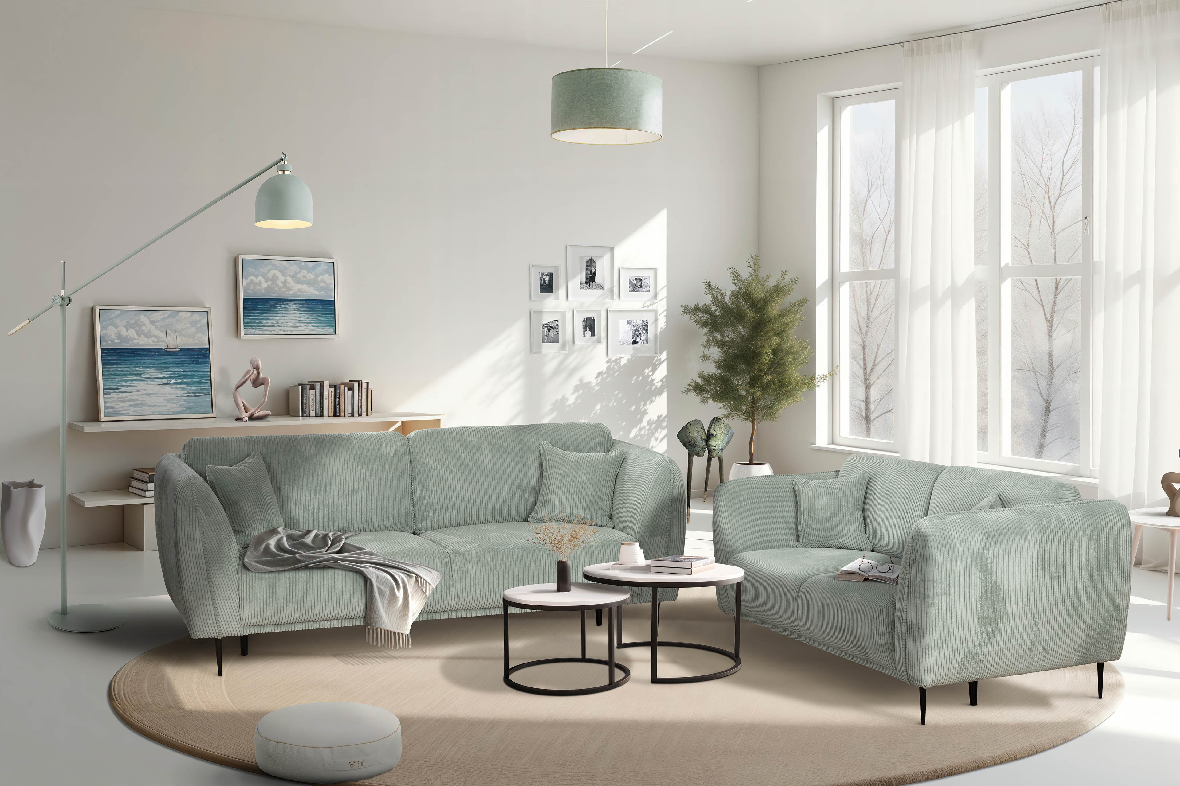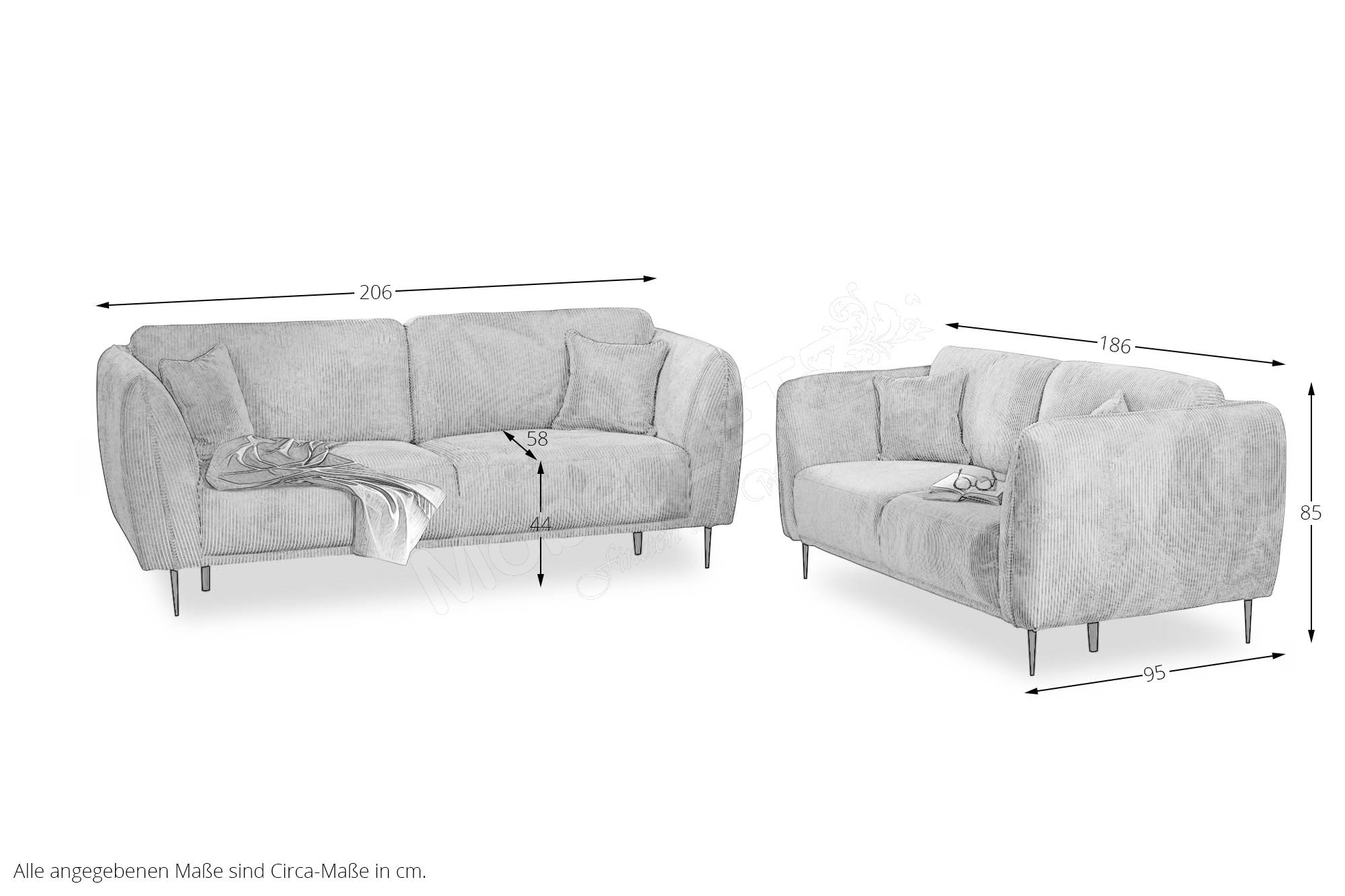 Eine charmante Sofagruppe, bestehend aus einem ca. 206 cm breiten 2,5-Sitzer sowie einem ca. 186 cm breiten 2-Sitzer, bietet Ihnen Grant Factory mit dem Modell Kelmis. Diese Kombination eignet sich wunderbar als moderne Sitzgelegenheit im stilvoll eingerichteten Wohnzimmer, Ergänzung für die TV-Ecke im Jugendzimmer oder als bequeme Ruhe-Oase im Wintergarten, um bei einem Gläschen Wein mit dem Liebsten oder in geselliger Runde mit Freunden den Abend gemütlich ausklingen zu lassen. Genussvollen Sitz- und traumhaften Anlehnkomfort bietet Ihnen dabei eine auf Nosagfedern ruhende Kaltschaumpolsterung - einmal Platz genommen und man möchte seinen Lieblingsplatz nicht mehr hergeben. Als passende Vervollständigung hält Ihnen dieses Modell einen wählbaren Hocker in zwei verschiedenen Größen, hinzubuchbar über die Zusatzoptionen, bereit, den Sie entweder als weitere Sitzgelegenheit für Gäste oder zur Ablage müder Beine nach einem anstrengenden Tag nutzen können. In der Abbildung zeigt sich Kelmis bezogen in einem modernen Cord im Farbton Mint, welchen Sie jedoch beliebig mit Hilfe der Bezugsauswahl unter "Farbe ändern" an Ihre persönlichen Bedürfnisse und Ihrem Geschmack entsprechend anpassen können. Machen Sie Ihre Einrichtungsträume wahr und holen Sie sich dieses elegante Polster-Duo Kelmis von Grant Factory in Ihr Zuhause.