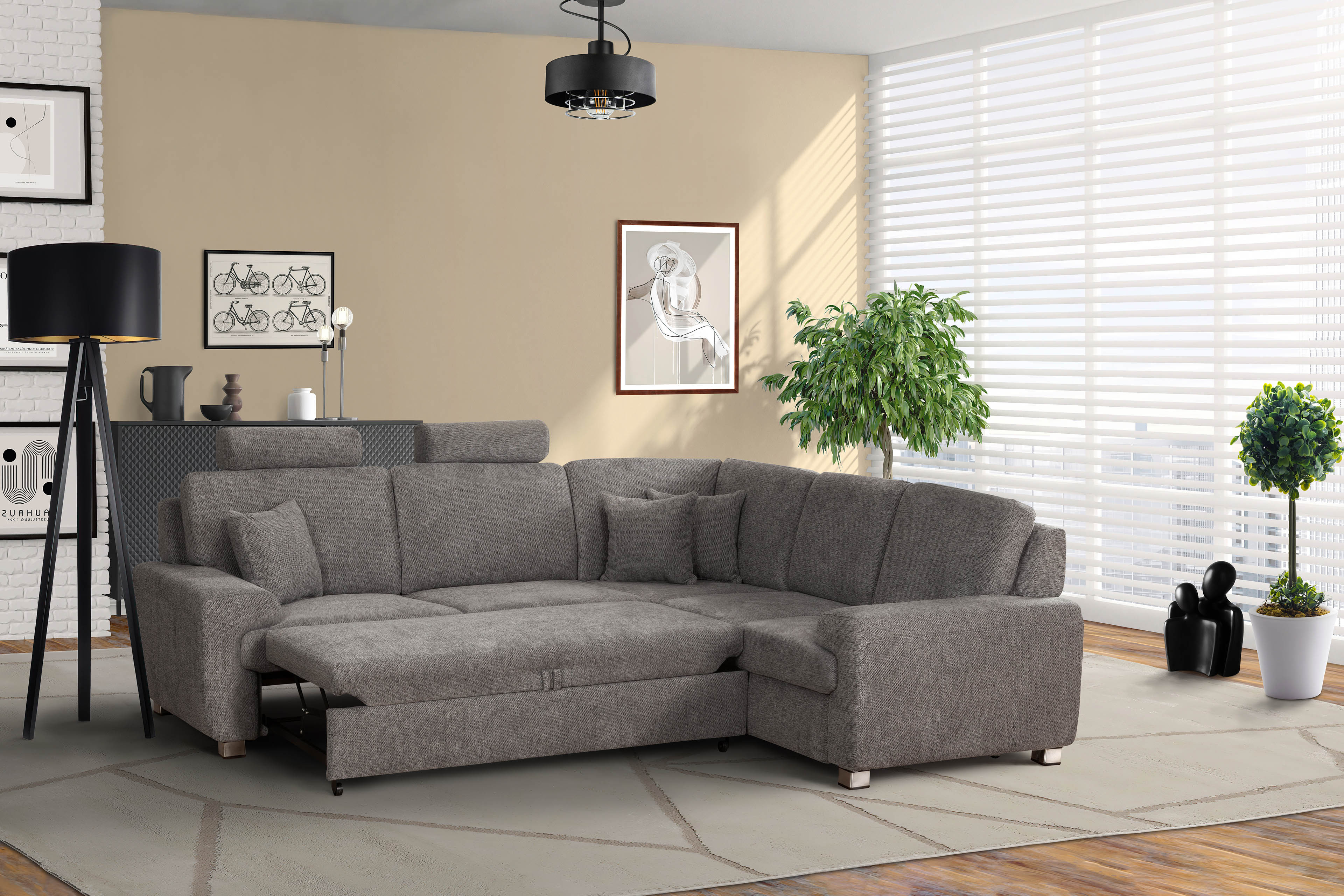 Wann haben Sie das letzte Mal so richtig entspannt, losgelassen und die pure Ruhe genossen? Die moderne Polstergarnitur Plaza von Grant Factory bietet genau dafür den idealen Rückzugsort. Doch nicht nur für ruhige Momente ist sie perfekt geeignet - auch geselliges Beisammensein mit Familie und Freunden oder wertvolle gemeinsame Zeit mit den Kindern wird auf ihr zum Genuss. Der Fokus liegt hier eindeutig auf Komfort: Die Kaltschaumpolsterung in Kombination mit der Nosagunterfederung sorgt für ein unvergleichliches Sitzerlebnis, das Sie bereits beim ersten Platznehmen spüren werden - und garantiert nicht mehr missen möchten. Für zusätzliche Entspannung und Erholung im Nackenbereich können optional praktische Kopfstützen dem Angebot hinzugefügt werden. Das Ecksofa aus der Modellreihe Plaza beeindruckt darüber hinaus mit weiteren durchdachten Funktionen: Neben einer großzügigen Schlaffunktion mit einer bequemen Liegefläche von etwa 201 x 123 cm, kann auch ein praktischer Schubkasten hinzugebucht werden, bestens geeignet zum Verstauen von Decken oder anderen Gegenständen. Ob kleiner oder großer Luxus - hier entscheiden Sie selbst, welche Extras Ihr Sofa zur persönlichen Wohlfühloase machen. Auch optisch lässt sich das Grant Factory Ecksofa anpassen: Dank der Option "Wunschbezug - Farbe ändern" können Sie das hochwertige graue Chenille-Flachgewebe auf Ihren individuellen Stil abstimmen. Gönnen Sie sich und Ihrem Zuhause diese einzigartige Ergänzung und bestellen Sie die Polstergarnitur Plaza noch heute.