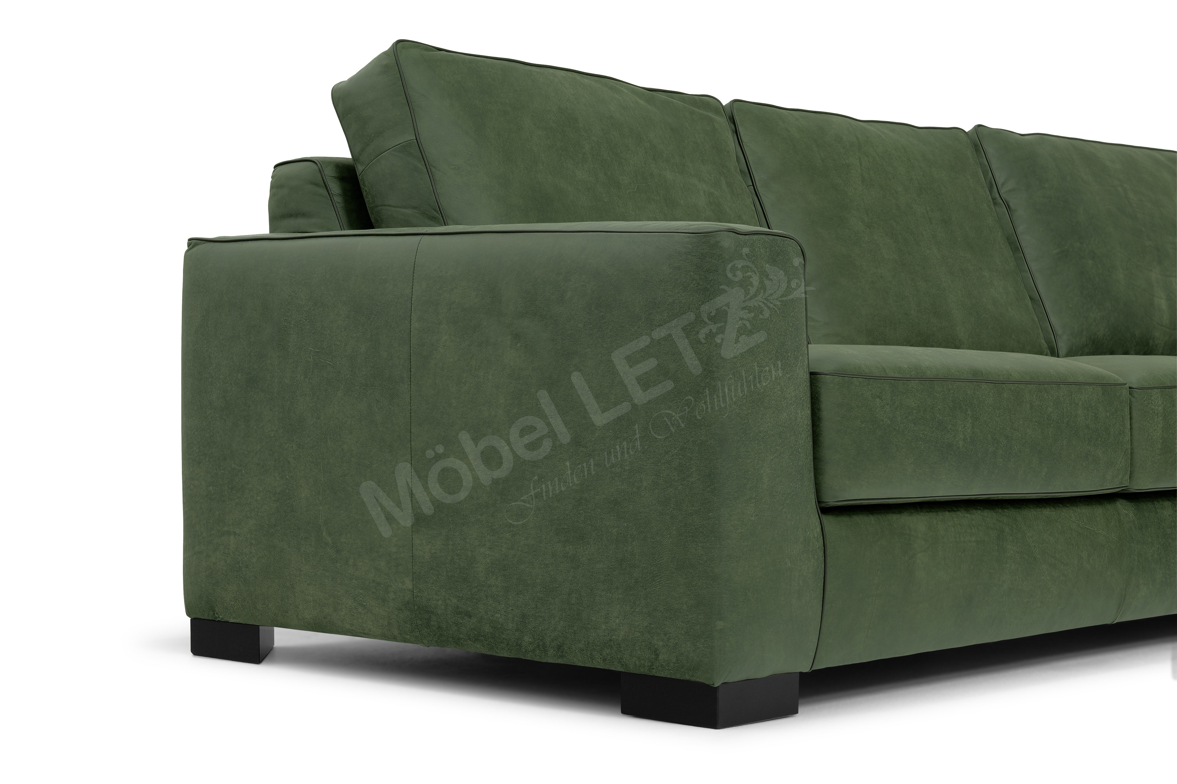 Eine wunderbare Harmonie kommt mit Rockefeller aus dem Hause Het Anker in Ihr Zuhause. Auf die wesentlichen Aufgaben eines Polstermöbels reduziert, aber dafür mit Wow-Effekt. Ein hervorragender Sitz- sowie Liegekomfort ist nahezu alles, was man benötigt, um sich entspannt zurückzulehnen und so den Tag ausklingen zu lassen. Eine wunderbare Kaltschaumpolsterung, ruhend auf Nosagfedern, sorgt dafür, dass Sie es sich bequem machen können, um der Hektik sowie dem Stress des Tages zu entkommen. Kombiniert mit großen, opulenten Elementen im Sitz und dazu passenden, kubischen Armlehnen, erstrahlt diese Garnitur mächtig, bodenständig sowie solide. Das ideale Möbelstück, um Ihren Wohnraum mit moderner sowie charmanter Gemütlichkeit zu füllen und Ihnen einen würdigen Rückzugsort für erholsame Stunden zu bieten. Bezogen in einem grünen Semianilinleder, versprüht die Het Anker Garnitur eine natürliche Ausstrahlung, welche sich in die meisten Einrichtungsstile integrieren lässt. Eine attraktive, graue Kedernaht, welche Sie auf Wunsch farblich an Ihre Vorstellungen anpassen können, rundet das moderne Design des Sofas hervorragend ab. Erleben Sie eine harmonische Symbiose aus moderner Ästhetik und maximalem Wohlfühlfaktor - Rockefeller von Het Anker.