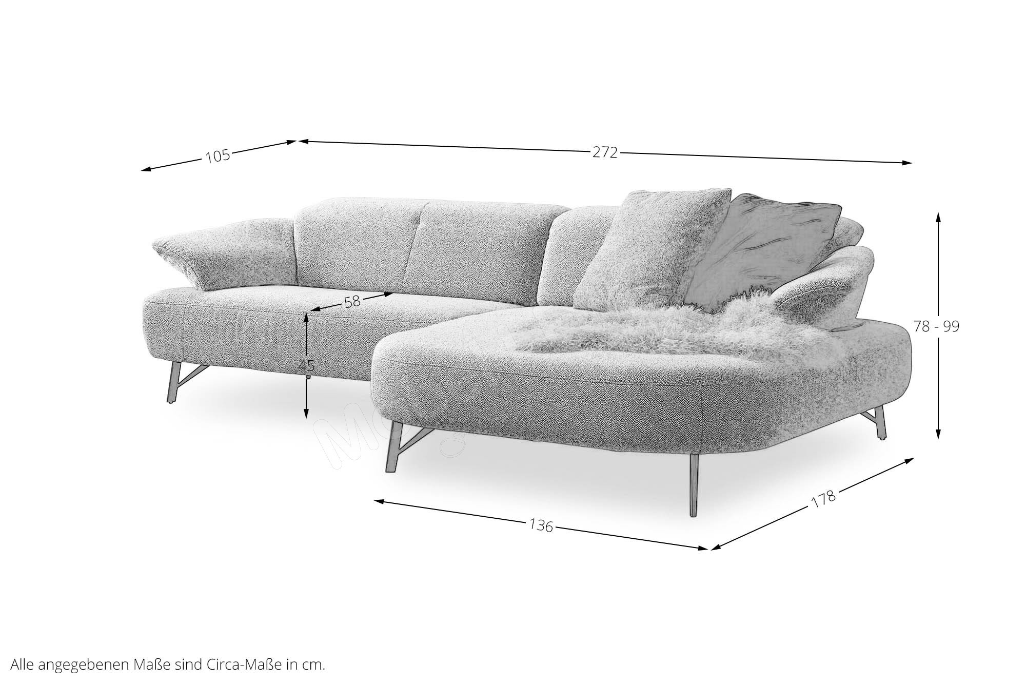 Gesamttiefe Abschlussrecamiere: ca. 178 - 204 cm