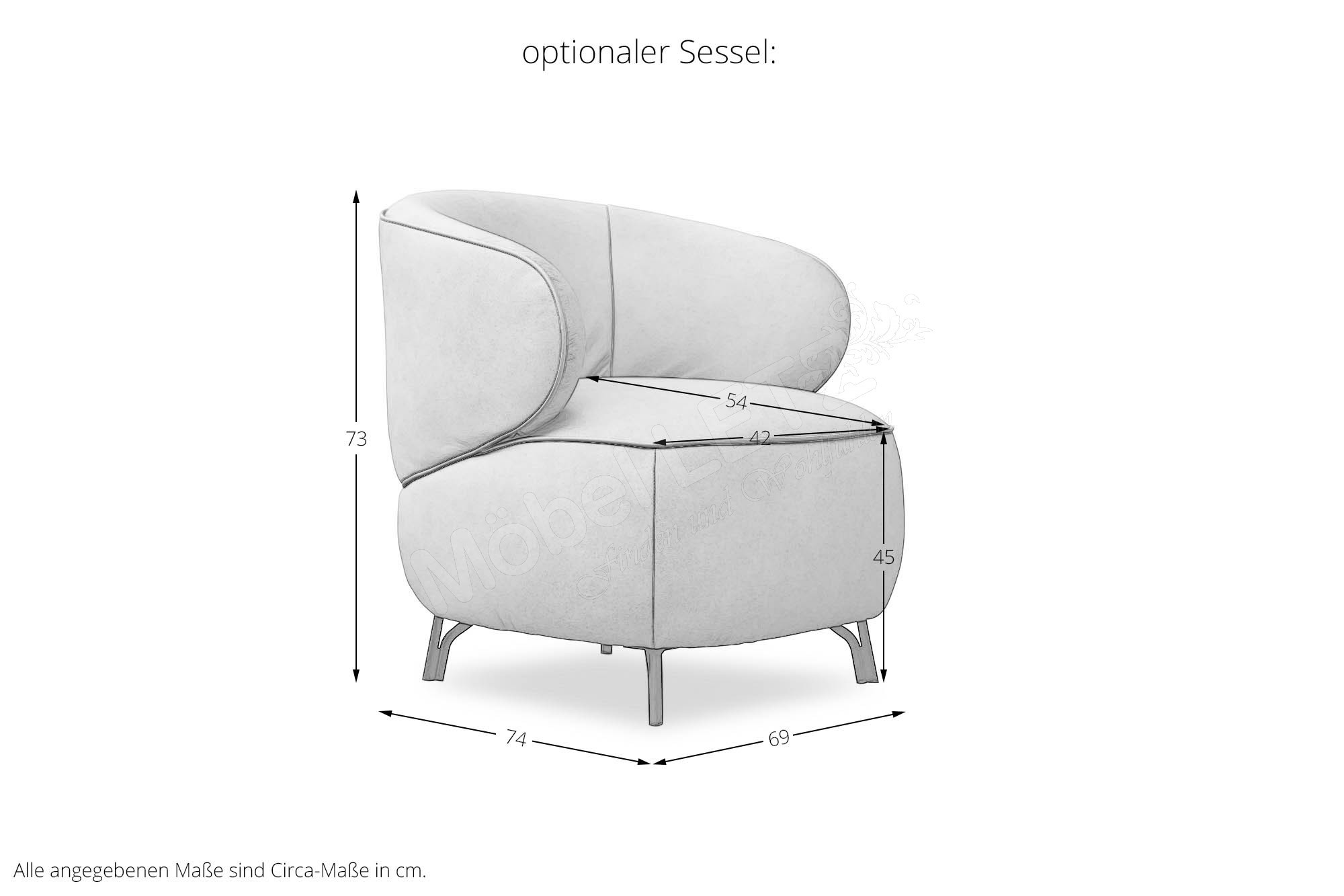 ca. BTH: 69/74/73 cm, Sitzhöhe ca. 45 cm, Sitztiefe ca. 54 cm, Sitzbreite ca. 42 cm