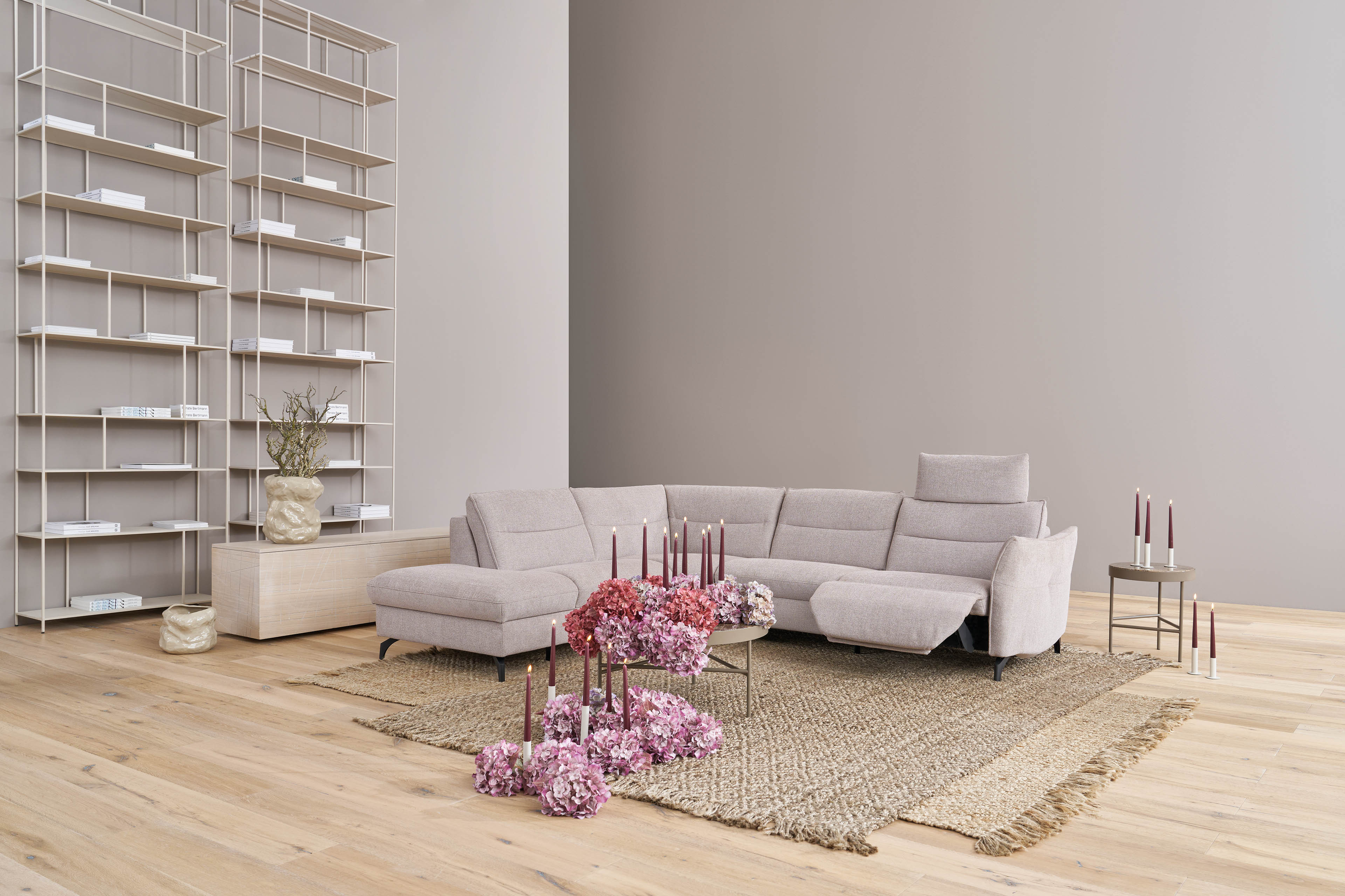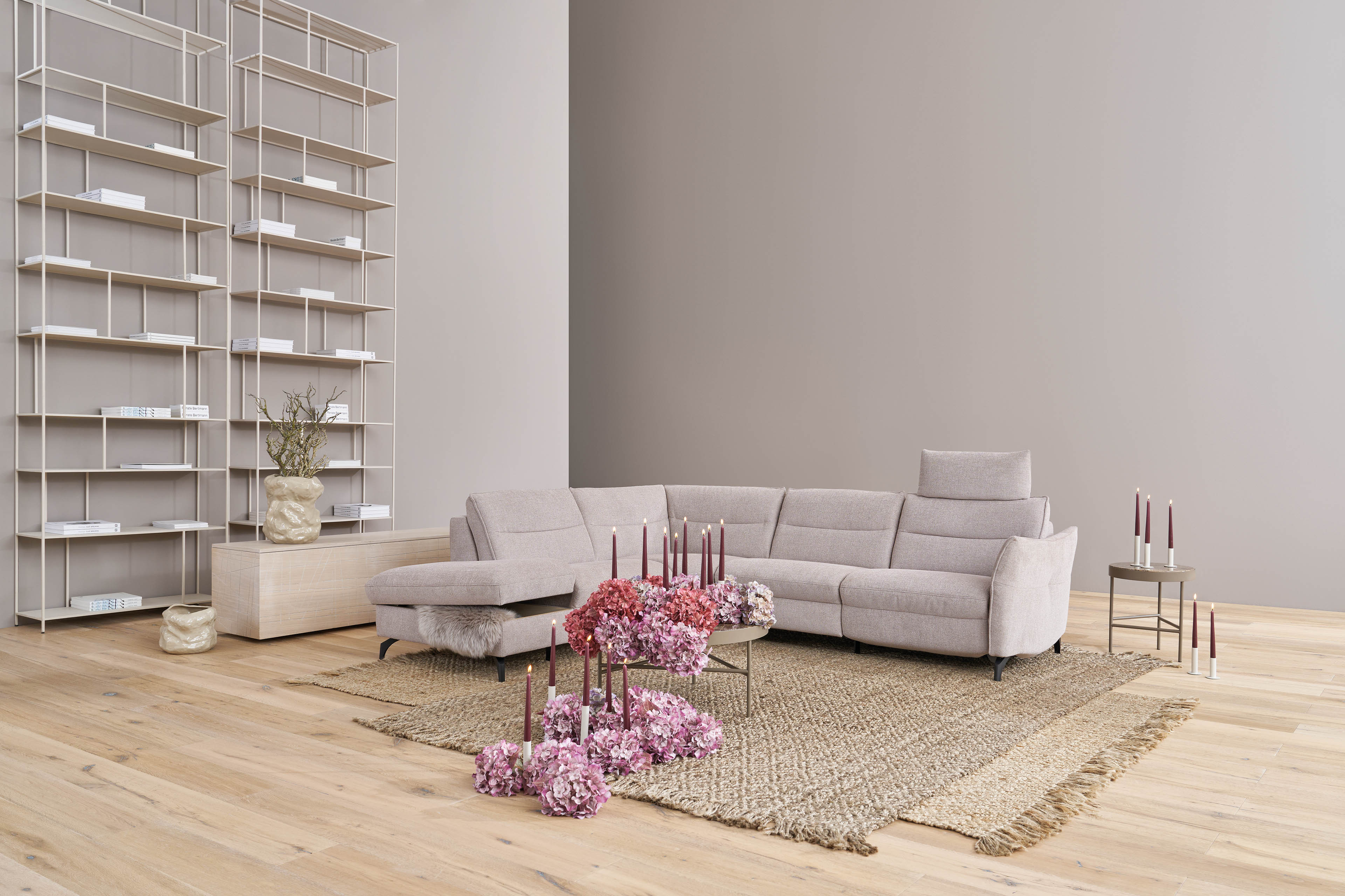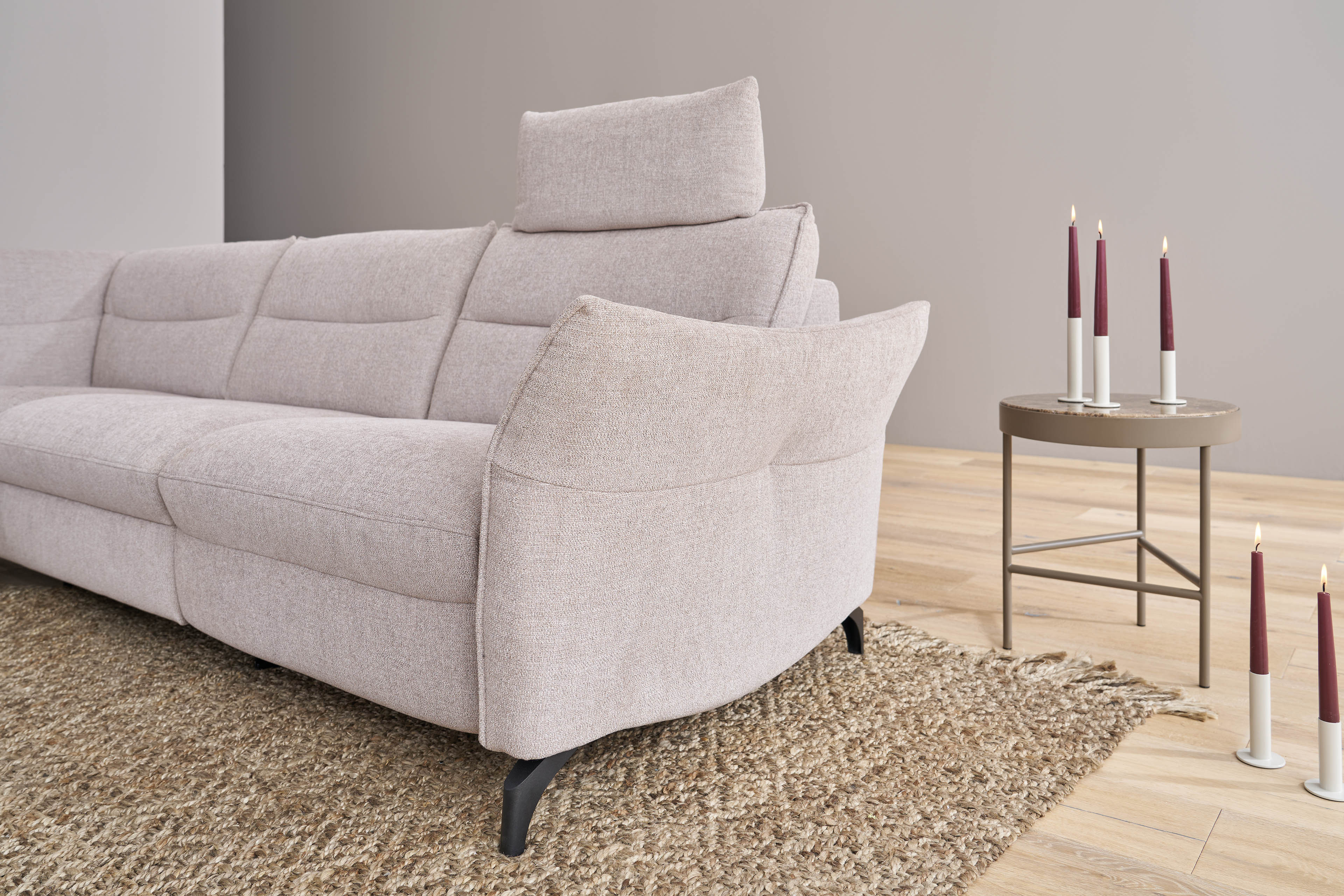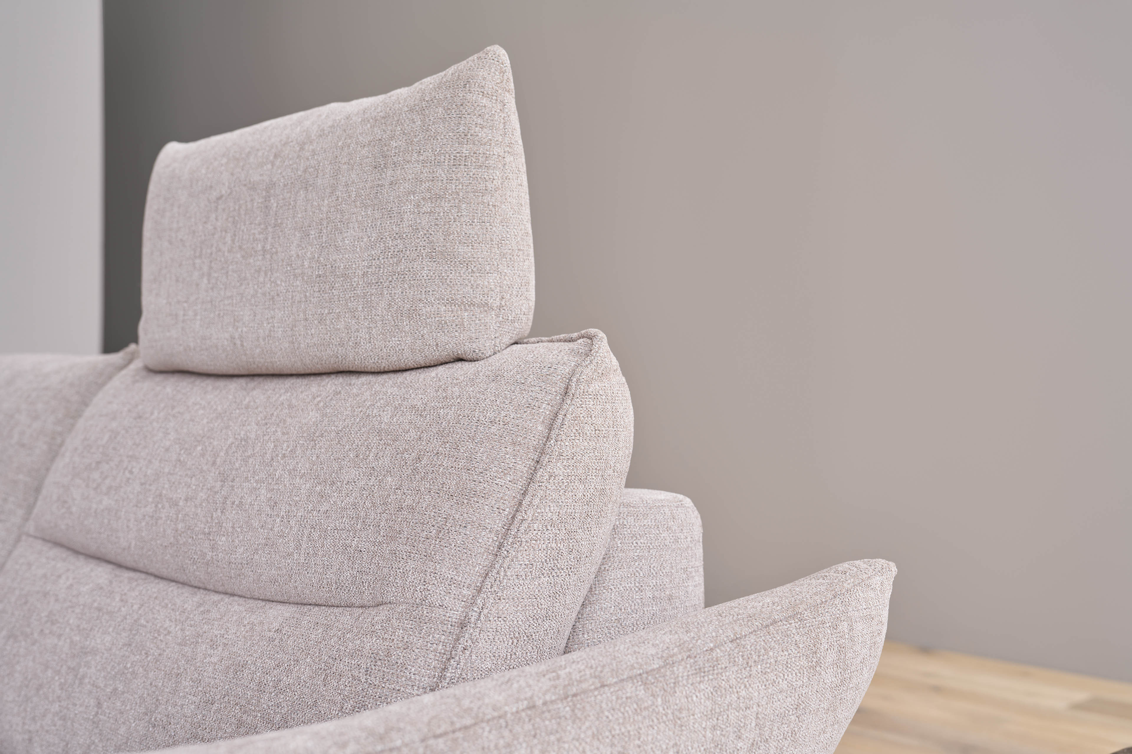 Erleben Sie Entspannung in einer völlig neuen Dimension mit dem Modell 1667 aus dem Hause Himolla, das als persönliche Ruheinsel im großen Stil weit mehr als nur eine gewöhnliche Sofagarnitur ist. Auf einem großzügigen Stellmaß von etwa 237 x 277-285 cm bietet diese Eckcouch, bestehend aus einem offenen Abschlusselement, einer Ecke und einem komfortablen 2,5-Sitzer, genau den Freiraum, den Sie nach einem stressigen Tag verdienen, sei es bei einem geselligen Spielenachmittag mit der Familie, einem kuscheligen Kinoabend zu zweit oder beim ganz privaten Rückzug mit einem spannenden Buch, welches Sie so sehr fesselt, als wären Sie inmitten der Geschichte. Damit jeder Nutzer seinen individuellen Komfort findet, steht Ihnen die hochwertige Superlastic-Formschaum-Polsterung in drei unterschiedlichen Härtegraden zur Verfügung - von angenehm weich, die softe Variante, über die Universalpolsterung "med", bis hin zum festen und aufrechten Sitzen, mit der Ausführung "plus mit Federkern", während die optional hinzubuchbare Relaxfunktion für den 2,5-Sitzer - wahlweise manuell oder motorisch steuerbar - ein stufenloses Gleiten in die perfekte Liegeposition ermöglicht. Ergänzt wird dieses Wohlfühlerlebnis durch weitere praktische Annehmlichkeiten, wie die bereits modelltypisch integrierte Armteilverstellung, die sowohl als bequeme Ablage beim Lesen als auch als stützendes Kopfpolster für ein kurzes Nickerchen fungiert, sowie durch optionalen Stauraum im Abschlusselement und ergonomische Kopfstützen, die ein erholsames Zurücklehnen möglich machen. Auch optisch lässt sich die Garnitur perfekt an Ihr Interieur anpassen, da der Hersteller neben dem abgebildeten dezenten Design aus Chenille-Flachgewebe in der Farbe "seashell" eine exklusive Palette an hochwertigen Stoff- und Lederqualitäten in verschiedensten Farbintensitäten bereithält. Lassen Sie die Hektik des Alltags hinter sich und machen Sie Ruhe sowie Behaglichkeit zum neuen Mittelpunkt Ihres Zuhauses - mit dem Himolla Polstersofa 1667.