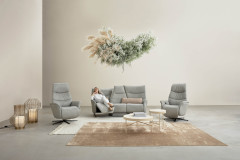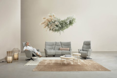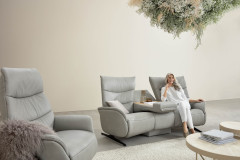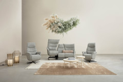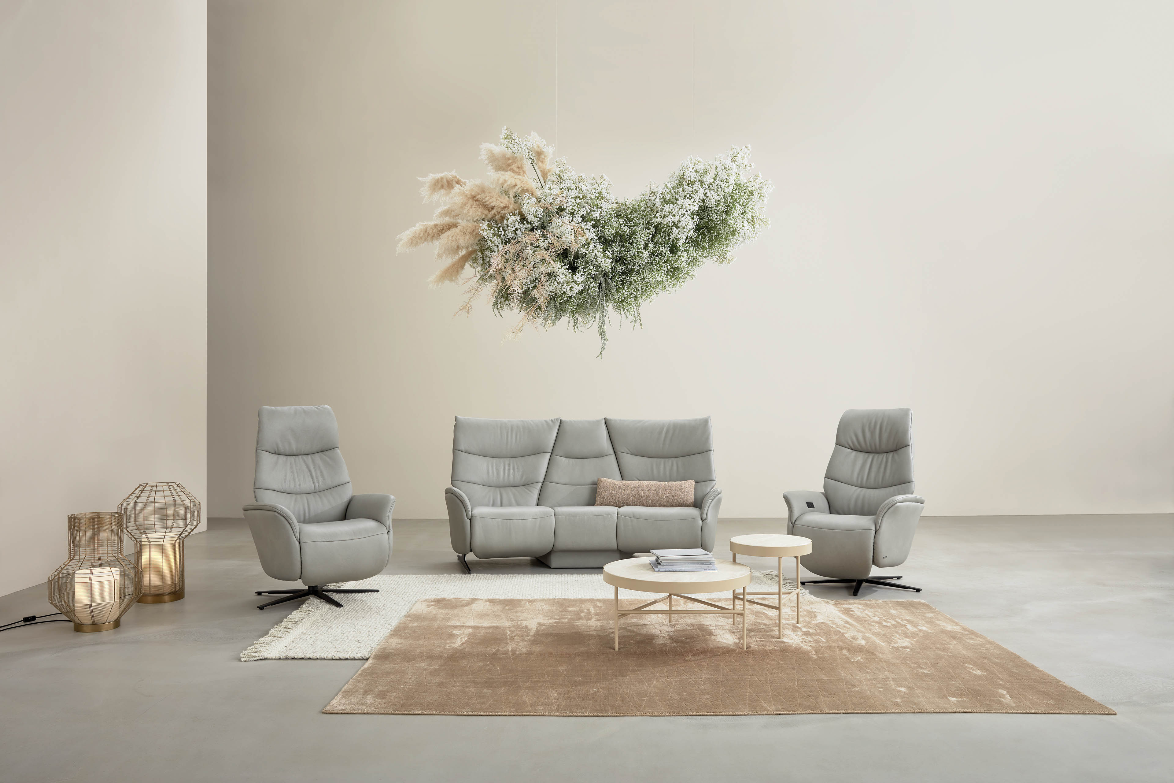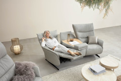 Flexibel, vielseitig und so gemütlich - das Trapezsofa 4050 von Himolla Polstermöbel. Dieser verführerische 3-Sitzer, bezogen in einem angesagten Echtledergewand im edlen Farbton "opal" sowie stehend auf einer anthrazitfarbenen Metallkufe, die zudem ausreichend Bodenfreiheit für einen Saugroboter lässt, lockt Sie nicht nur mit wohligen Formen, sondern auch mit innovativen Funktionen. Lehnen Sie sich zurück und geben Sie der Garnitur mit leichtem Körperdruck zu verstehen, was Sie wollen - Sie werden überrascht sein, wie schnell sie Ihre Wünsche erkennt sowie sich ohne Umwege in eine behagliche Komfortzone begibt. Dabei gehen Sitz, Rücken sowie Fußteil der beiden äußeren Plätze in eine entspannte Relaxposition, die Ihnen erholsame Augenblicke und die Möglichkeit verschafft, die Seele mal in aller Ruhe baumeln zu lassen - auf Wunsch auch mit motorischer Verstellung sowie mit zusätzlicher Aufstehhilfe für ein leichtes Erheben aus dem Sitz lieferbar. Ein weiteres Highlight ist der integrierte Tisch im Zwischenelement: Durch das Herunterklappen der Rückenlehne kommt eine praktische Ablage zum Vorschein, die dank der Holzfläche eine stabile Abstellmöglichkeit für Getränke oder kleine Snacks bereithält. Darüber hinaus können Sie mit einer vielfältigen Auswahl an Farben sowie Bezügen die Ledergarnitur auch optisch Ihren Vorstellungen näher bringen - Ihrer Gestaltungsfreiheit sind mit den facettenreichen Materialien und Nuancen keine Grenzen gesetzt. Ausgezeichnete Qualität und bester Komfort vereint in dem Himolla Heimkinosofa 4050.