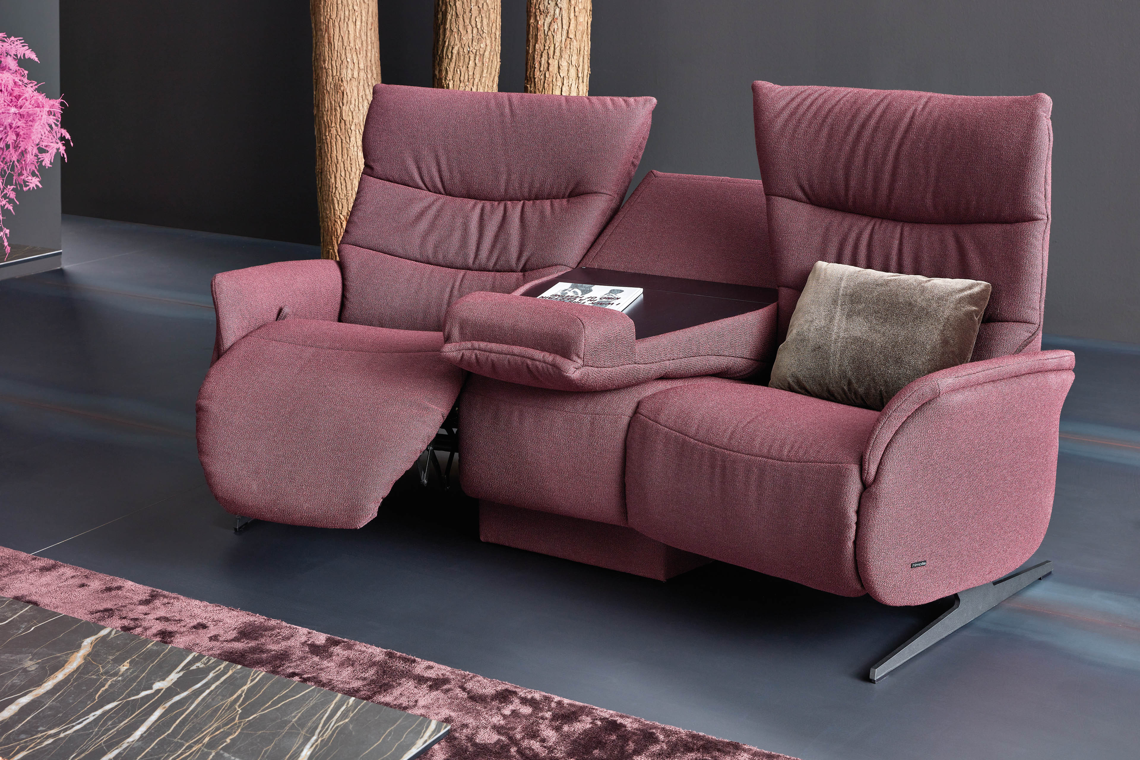 Flexibel, vielseitig und so gemütlich - das Trapezsofa 4050 von Himolla Polstermöbel. Dieser verführerische 3-Sitzer, bezogen in einem angesagten Flachgewebe im spirituellen Farbton "flieder" sowie stehend auf einer anthrazitfarbenen Metallkufe, die zudem ausreichend Bodenfreiheit für einen Saugroboter lässt, lockt Sie nicht nur mit wohligen Formen, sondern auch mit innovativen Funktionen. Lehnen Sie sich zurück und geben Sie der Garnitur mit leichtem Körperdruck zu verstehen, was Sie wollen - Sie werden überrascht sein, wie schnell sie Ihre Wünsche erkennt sowie sich ohne Umwege in eine behagliche Komfortzone begibt. Dabei gehen Sitz, Rücken sowie Fußteil der beiden äußeren Plätze in eine entspannte Relaxposition, die Ihnen erholsame Augenblicke und die Möglichkeit verschafft, die Seele mal in aller Ruhe baumeln zu lassen - auf Wunsch auch mit motorischer Verstellung sowie mit zusätzlicher Aufstehhilfe für ein leichtes Erheben aus dem Sitz lieferbar. Ein weiteres Highlight ist der integrierte Tisch im Zwischenelement: Durch das Herunterklappen der Rückenlehne kommt eine praktische Ablage zum Vorschein, die dank der Holzfläche eine stabile Abstellmöglichkeit für Getränke oder kleine Snacks bereithält. Darüber hinaus können Sie mit einer vielfältigen Auswahl an Farben sowie Bezügen die Ledergarnitur auch optisch Ihren Vorstellungen näher bringen - Ihrer Gestaltungsfreiheit sind mit den facettenreichen Materialien und Nuancen keine Grenzen gesetzt. Ausgezeichnete Qualität und bester Komfort vereint in dem Himolla Heimkinosofa 4050.
