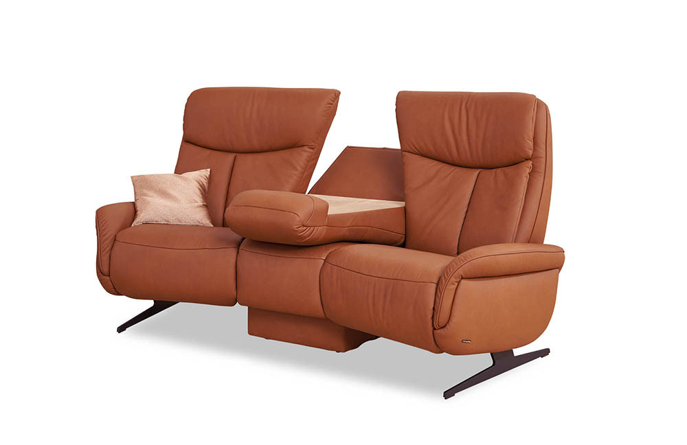 Ein elegantes Qualitätsmöbelstück mit himmlischem Komfort und luxuriösen Wohlfühleigenschaften erhalten Sie mit dem Trapezsofa 4550 aus der CUMULY COMFORT Kollektion des Herstellers Himolla. Hier lässt es sich wunderbar entspannen, die Beine hochlegen und erholsam die Zeit genießen, denn eine bereits integrierte manuelle Relaxfunktion, bei der Sie das Kopfteil, den Rücken sowie das Fußteil getrennt voneinander verstellen können, ermöglicht ein behagliches Einnehmen Ihrer Lieblingsposition. Noch annehmlicher lässt sich das Ganze durch Buchen der elektrischen Relaxausführung gestalten, die mittels Kippschalter seitlich am Sitzfeld bedient wird und zusätzlich mit einer motorischen Kopfteilverstellung sowie einer praktischen Aufstehhilfe versehen werden kann. Ein weiterer Pluspunkt der Polstergarnitur ist das mittlere Element mit einem sich öffnenden Rücken und Ablagefläche. Getränke sowie kleine Snacks finden hier ein sicheres Plätzchen, wenn Sie sich Ihren Erholungsmomenten oder der abendlichen Serie im Fernsehen widmen. Neben den funktionalen Aspekten trumpft das Trapez-Sofa ferner mit seinem modernen Erscheinungsbild auf. Bezogen in einem hochwertigen Echtleder in der Farbe "texas" strahlt es nicht nur Warmherzigkeit aus und verleiht jedem Wohnambiente ein natürliches, aber dennoch edles Flair, auch harmoniert es perfekt mit nahezu jedem Einrichtungsstil, wodurch Ihr neues Traummöbel in alle Räumlichkeiten integriert werden kann. Komplettieren Sie dieses fantastische Angebot mit dem abgebildeten 3-Sitzer aus der Modellreihe 4551 oder mit dem wunderschönen TV-Sessel 7556, der auch mit traumhaften Eigenschaften überzeugt. 4550 von Himolla Polstermöbel - für Kinoabende in Ihrem Zuhause.