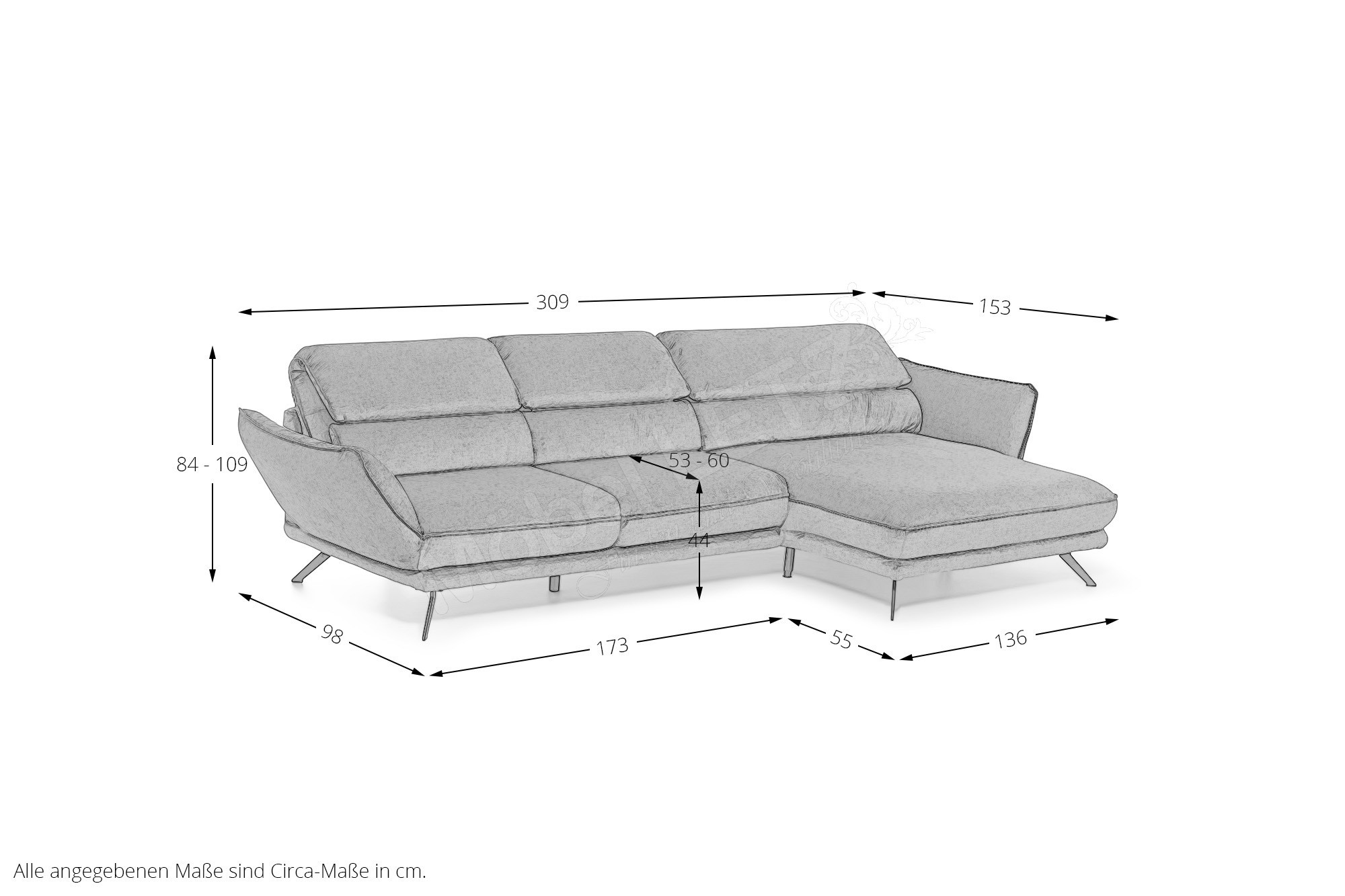 - Sitz: H2L - voll durchgeschäumter Federkern ummantelt mit Polstervlies auf dauerelastischen Wellenfedern