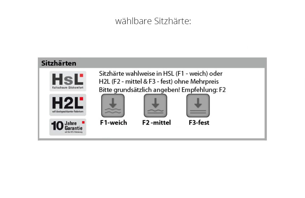 - Sitz: H2L - voll durchgeschäumter Federkern auf dauerelastischen Wellenfedern