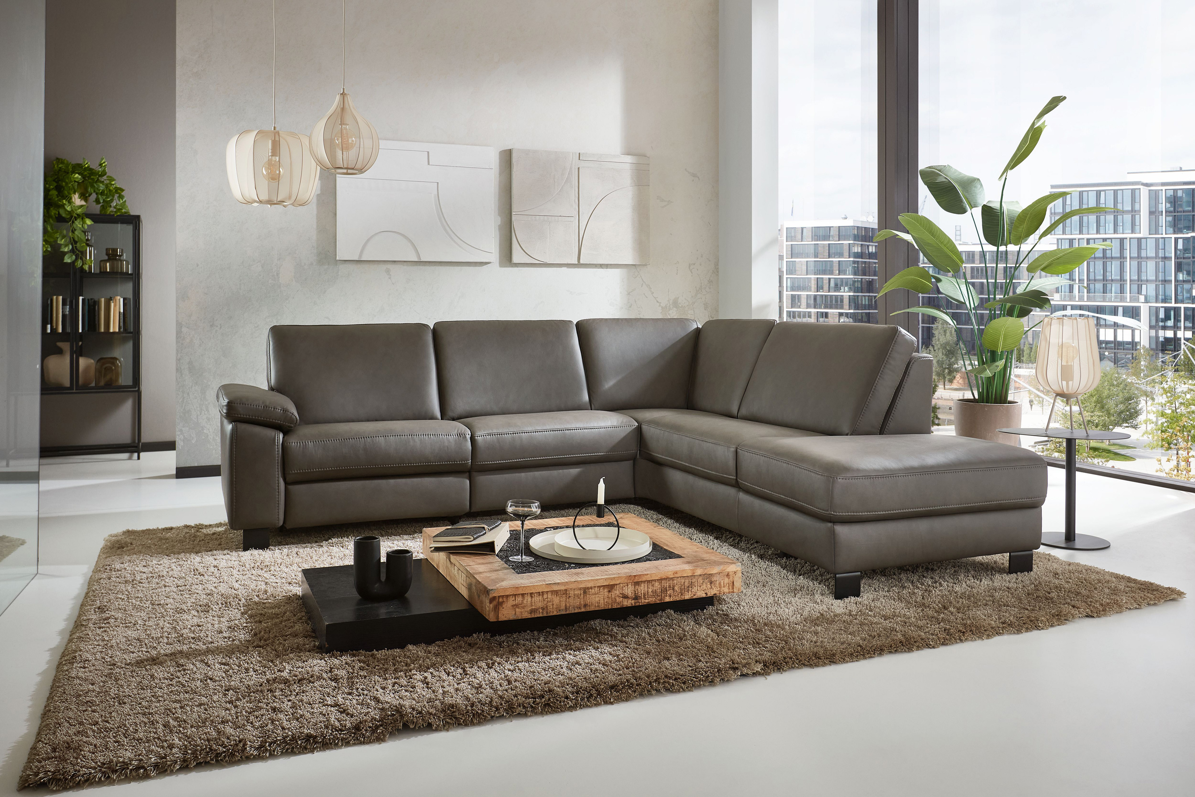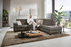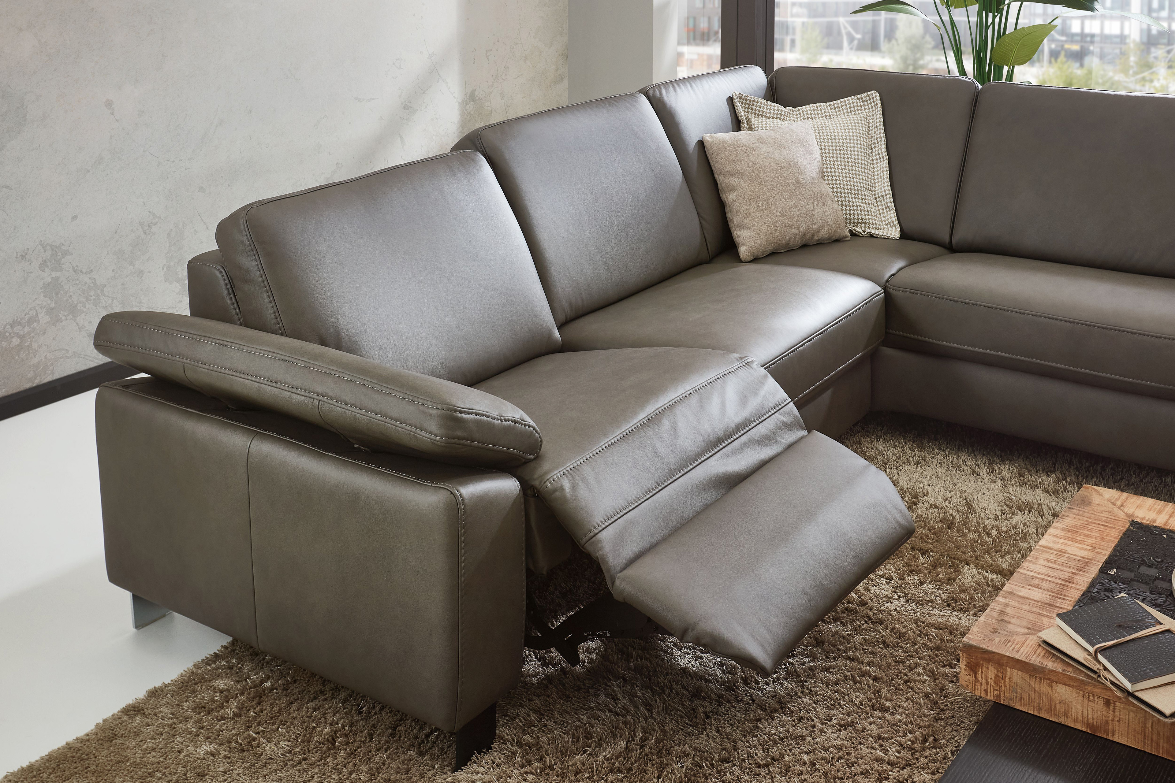 HU-SC17009 von Hukla - der ideale Begleiter im zeitlosen Grau! Hier abgebildet zeigt sich die Garnitur in einer ca. 270 x 235 cm großen Kombination, bestehend aus einem 2,5-Sitzer sowie einem Kombielement mit Anstellhocker. Im Inneren verbirgt sich eine hochwertige Federkernpolsterung, ruhend auf Wellenfedern, die maßgeblich für ein wunderbares Sitzvergnügen sorgt. Mit der optionalen Wall-Away-Funktion, links und rechts im 2,5-Sitzer buchbar, können Sie sich bequem zurücklehnen sowie entspannen. Auf Knopfdruck gleiten Sie in eine behagliche Liegeposition, in der es sich angenehm lesen oder fernsehen lässt. Durch die vielfältigen Fuß- und Armteilausführungen ist die Sitzgelegenheit ein perfekt auf Ihren Geschmack zugeschnittenes Möbelstück, das sich harmonisch ins heimische Interieur einfügt. Die dunklen Metallfüße verleihen dem Sofa einen eleganten Look, der jedes Wohnzimmer aufwertet. Falls Ihnen der Echtlederbezug zu schlicht erscheint, ist das kein Problem. Unter "Farbe ändern" stellt der Hersteller Ihnen eine ausgezeichnete Palette an unterschiedlichen Bezügen zur Verfügung. Unter unseren Zusatzoptionen sorgt ein passender Hocker für zusätzliche Bequemlichkeit und lädt zum Hochlegen der Füße ein. Kissen sowie Kopfstützen sind ebenfalls individuell wählbar und bieten eine optimale Unterstützung für Rücken sowie Nacken. Lassen Sie sich von der einzigartigen Kombination aus Design sowie Funktionalität begeistern und schaffen Sie einen Ort voller Gemütlichkeit sowie Stil, mit HU-SC17009 aus dem Hause Hukla Polstermöbel!