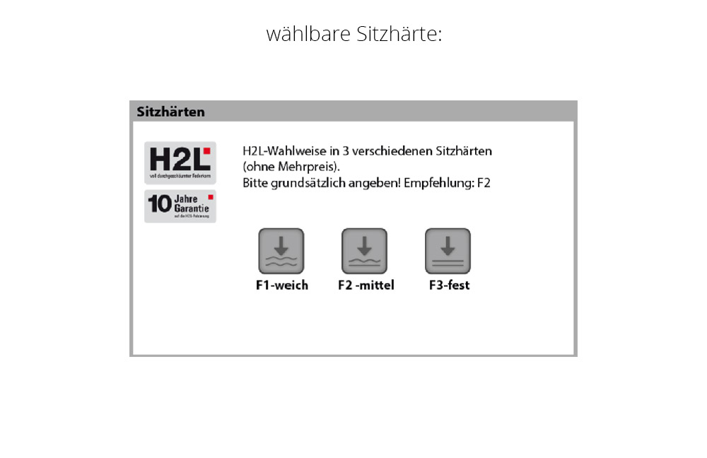 - Sitz: H2L - voll durchgeschäumter Federkern auf dauerelastischen Wellenfedern