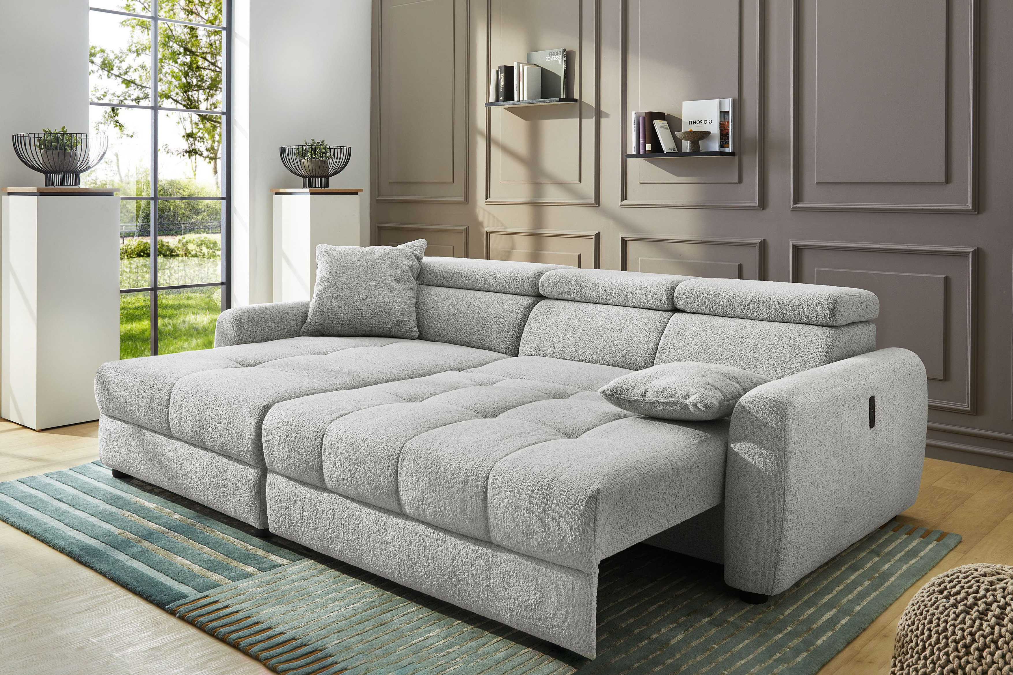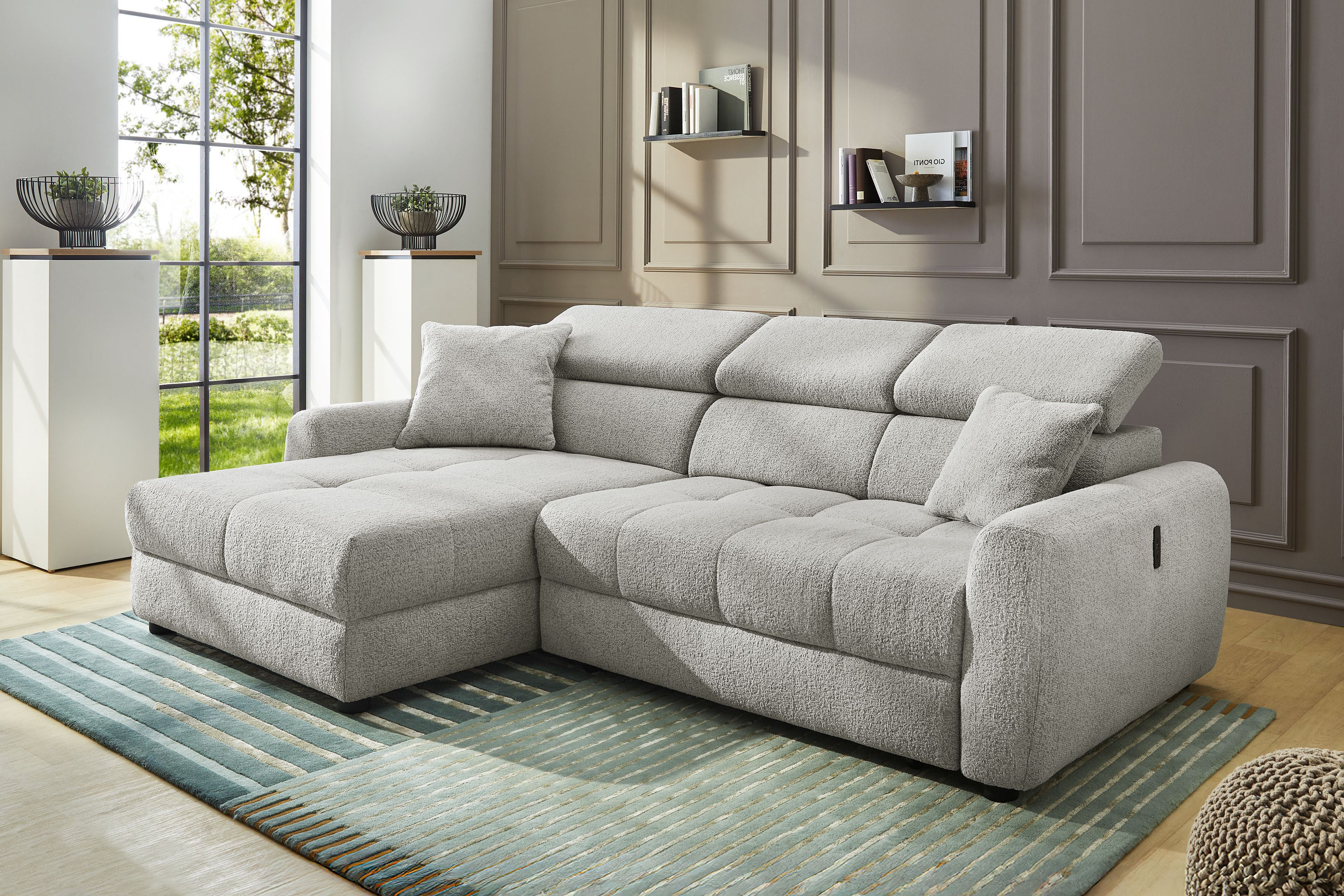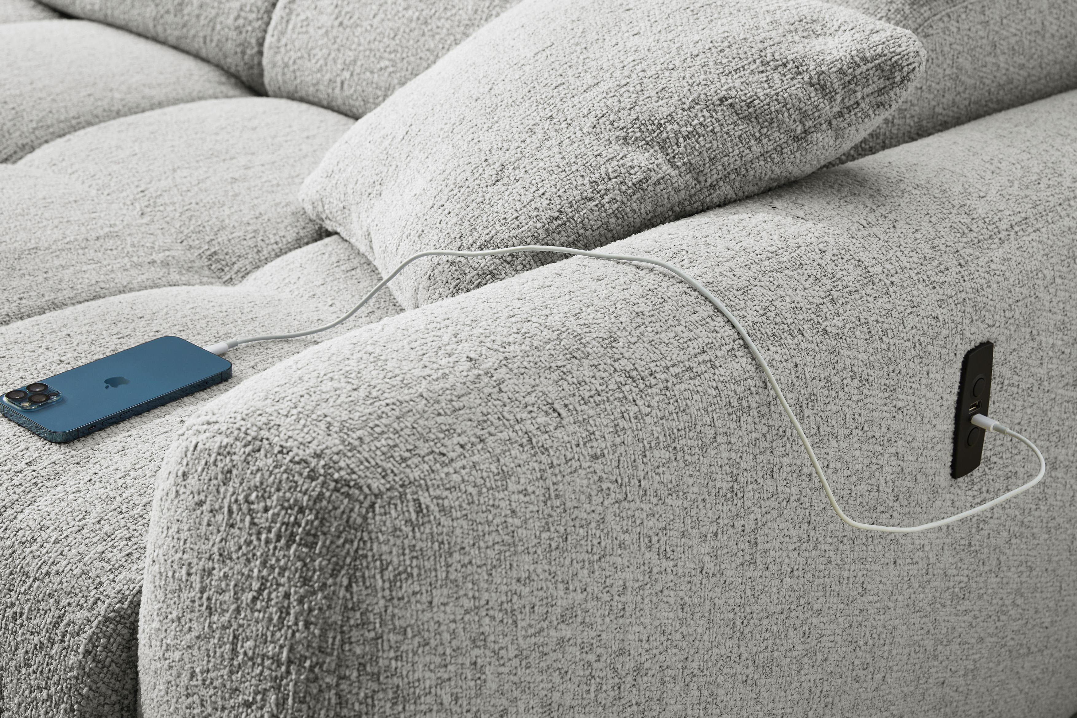 Move von Jockenhöfer Polstermöbel setzt auf zarte und dennoch gekonnte Akzente. Ein absolut im Trend liegender, angenehm weicher Flachgewebe-Bezug, kombiniert mit schwarzen Füßen und feinen Nähten, die die schöne Steppung besonders gut zur Geltung bringen, gestalten die ca. 175 x 270 cm große Eckgarnitur, neben den im Lieferumfang enthaltenen Zierkissen, zu einem absoluten Highlight. Doch das Modell, bestehend aus einer Ottomane und einem 2-sitzigen Sofateil, begeistert nicht nur durch sein schickes Äußeres. Bestimmen Sie selbst, welche Position für Sie die bequemste ist, denn die Kopfteile lassen sich getrennt voneinander nach oben stellen, bieten einen herrlichen Anlehnkomfort sowie eine individuelle Rückenhöhe ganz nach Ihren Ansprüchen. Die bequeme Schaumpolsterung auf Wellenfedern lädt dabei zum ausgiebigen Faulenzen sowie Verweilen ein und die bereits integrierte motorische Sitztiefenverstellung im 2-Sitzer schafft per Knopfdruck zu jeder Zeit eine gemütliche Liegefläche von ca. 227 x 122 cm. Zudem verfügt die Polstergarnitur über einen praktischen USB-A sowie USB-C Ladeport im Bedienelement an der Außenseite der Armlehne, mit welchem wunderbar das Smartphone oder Tablet geladen werden kann. Beine hochlegen, zurücklehnen, entspannen und es sich einfach gut gehen lassen - allein oder im Kreise Ihrer Liebsten. Auch Sie sind begeistert? Dann bestellen Sie gleich noch heute! Move aus dem Hause Job - in weiteren Farben, linker sowie rechter Ausführung lieferbar …