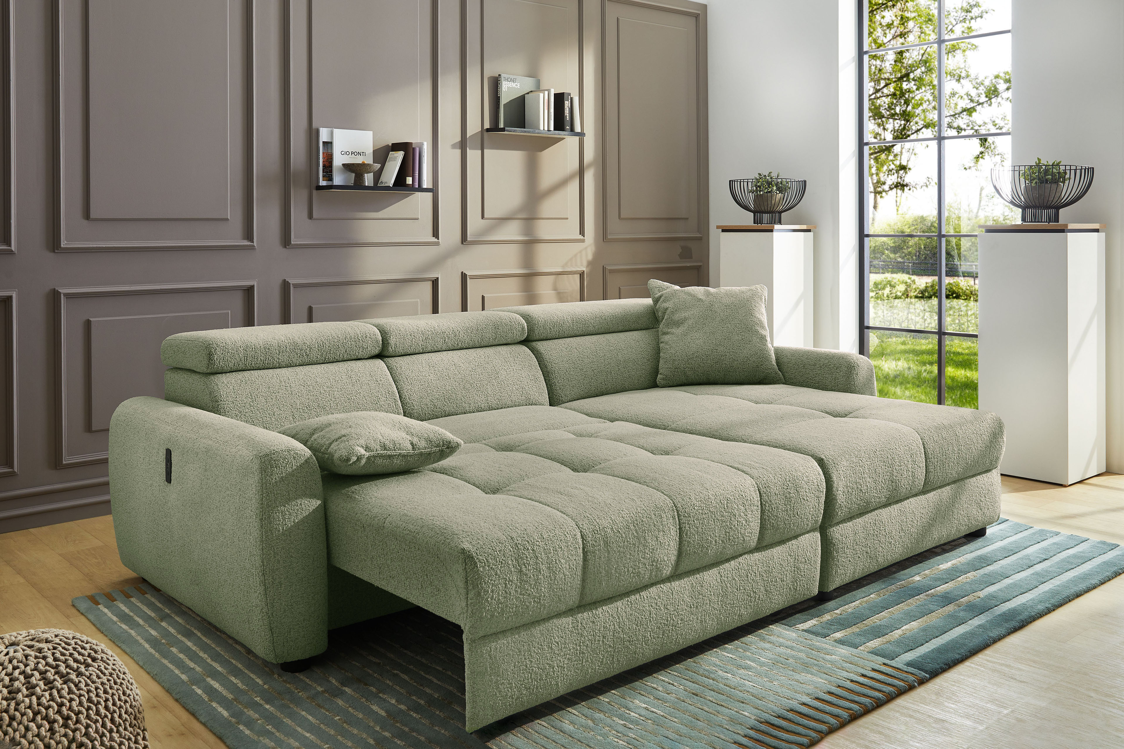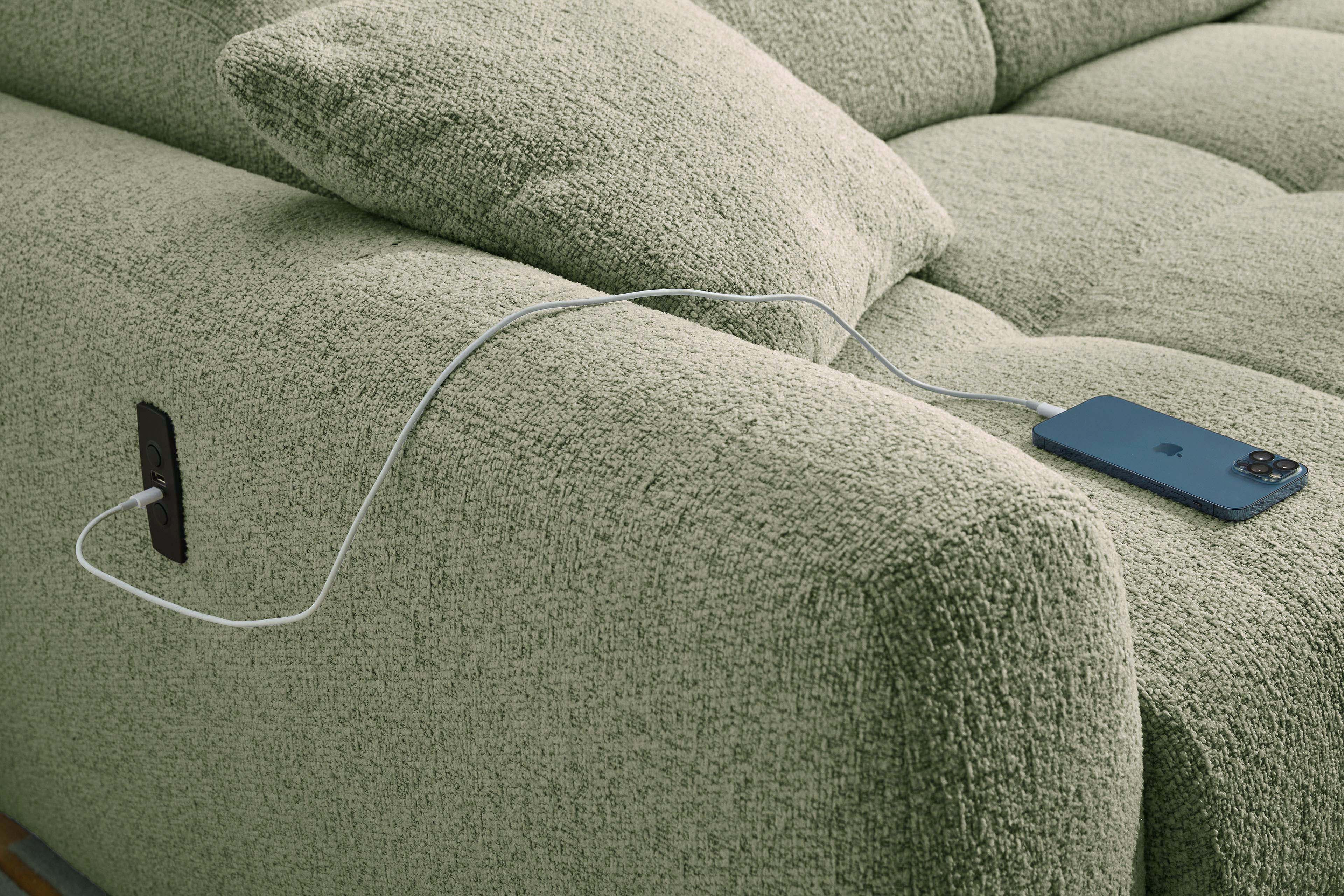 Move von Jockenhöfer Polstermöbel setzt auf zarte und dennoch gekonnte Akzente. Ein absolut im Trend liegender, angenehm weicher Flachgewebe-Bezug, kombiniert mit schwarzen Füßen und feinen Nähten, die die schöne Steppung besonders gut zur Geltung bringen, gestalten die ca. 270 x 175 cm große Eckgarnitur, neben den im Lieferumfang enthaltenen Zierkissen, zu einem absoluten Highlight. Doch das Modell, bestehend aus einem 2-sitzigen Sofateil und einer Ottomane, begeistert nicht nur durch sein schickes Äußeres. Bestimmen Sie selbst, welche Position für Sie die bequemste ist, denn die Kopfteile lassen sich getrennt voneinander nach oben stellen, bieten einen herrlichen Anlehnkomfort sowie eine individuelle Rückenhöhe ganz nach Ihren Ansprüchen. Die bequeme Schaumpolsterung auf Wellenfedern lädt dabei zum ausgiebigen Faulenzen sowie Verweilen ein und die bereits integrierte motorische Sitztiefenverstellung im 2-Sitzer schafft per Knopfdruck zu jeder Zeit eine gemütliche Liegefläche von ca. 227 x 122 cm. Zudem verfügt die Polstergarnitur über einen praktischen USB-A sowie USB-C Ladeport im Bedienelement an der Außenseite der Armlehne, mit welchem wunderbar das Smartphone oder Tablet geladen werden kann. Beine hochlegen, zurücklehnen, entspannen und es sich einfach gut gehen lassen - allein oder im Kreise Ihrer Liebsten. Auch Sie sind begeistert? Dann bestellen Sie gleich noch heute! Move aus dem Hause Job - in weiteren Farben, linker sowie rechter Ausführung lieferbar …