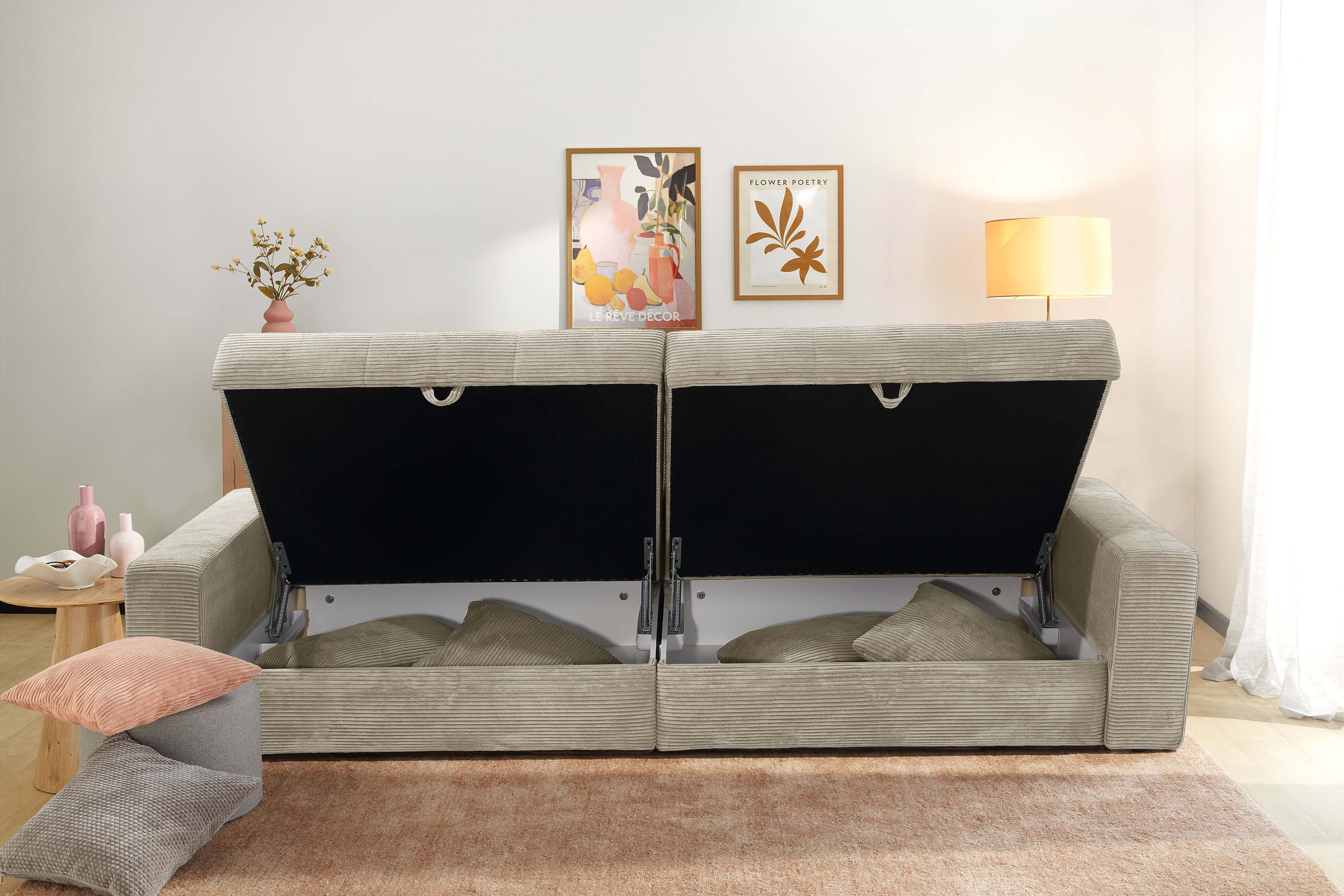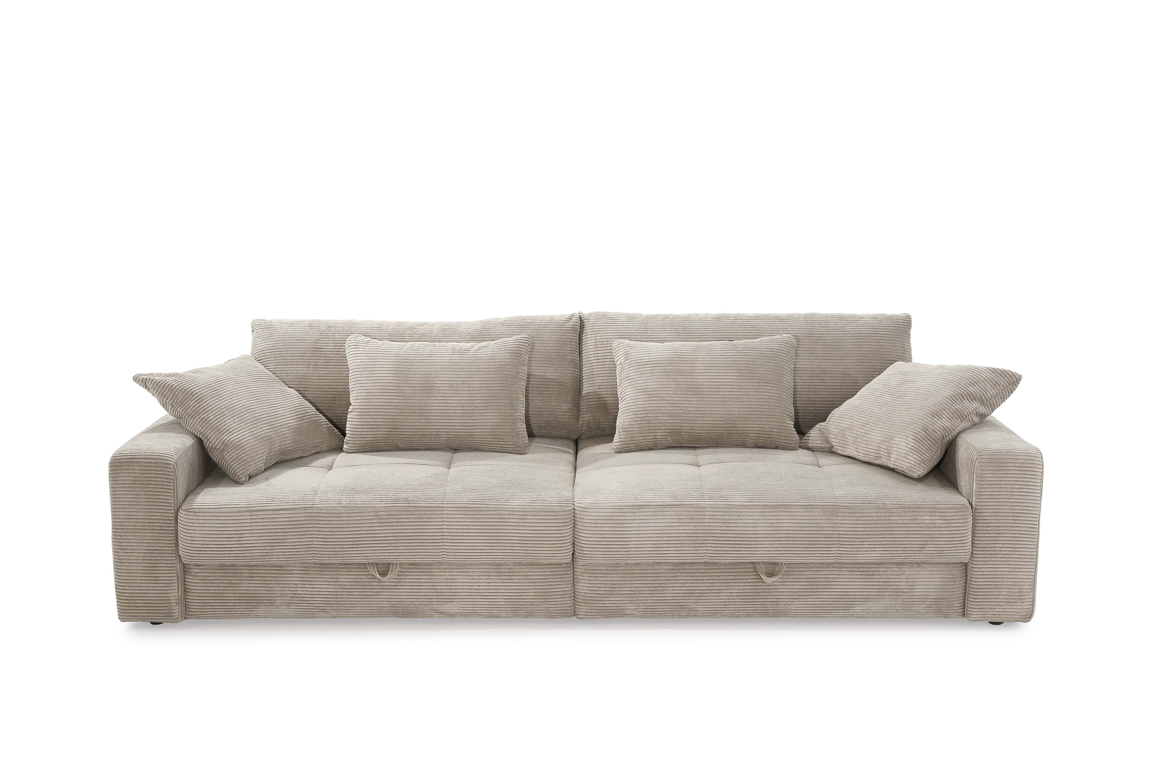 Mit dem Big-Sofa Space von Jockenhöfer Polstermöbel holen Sie sich modernes sowie gemütliches Design in Verbindung mit cleverer Funktionalität zu sich nach Hause. Bezogen in einem kuschelweichen Cordstoff, welcher in einem zarten Beigeton gehalten ist, strahlt es Ruhe und absolute Harmonie aus. Abgerundet durch die quadratische Steppung in der Sitzfläche sowie im Rücken echt bezogen, lässt es sich mit einer großzügigen Stellfläche von ca. 284 x 113 cm nicht nur vor einer Wand platzieren, sondern auch wunderbar frei in den Raum stellen. Mit der imposanten, dick gepolsterten Sitzfläche aus einem Schaumstoff mit einer Wellenunterfederung und den voluminösen Rückenkissen wird die Job Polstergarnitur zur neuen Wohlfühloase für Sie und Ihre Liebsten. Zwei integrierte, große Bettkästen unterhalb der Sitzfläche, in welchen Decken, Kissen oder auch andere Wohnaccessoires stets ihren geordneten Platz finden, sowie vier zusätzliche Kissen in zwei verschiedenen Größen sind im Lieferumfang enthalten und verleihen dem XXL-Sofa seinen unverwechselbaren Charme, dem niemand widerstehen kann. Lassen Sie sich fallen, schließen Sie die Augen und fangen Sie an zu träumen. Vielleicht von Ihrem nächsten Urlaub oder lauen Sommernächten, blühenden Feldern, duftenden Wiesen! Spüren auch Sie die Anziehungskraft dieses bezaubernden Sofas? Dann zögern Sie nicht und bestellen Sie gleich noch heute dieses imposante Mega-Sofa, welches Großzügigkeit, Ordnung und Gemütlichkeit perfekt miteinander verbindet - Space aus dem Hause Job.