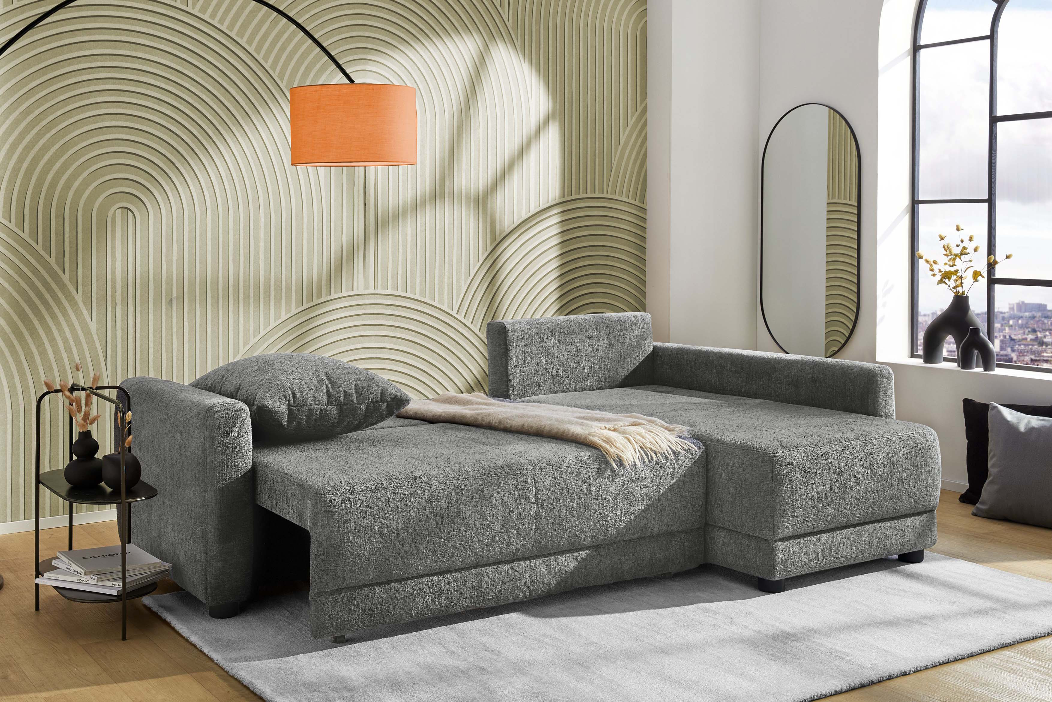 Venezia von Jockenhöfer Polstermöbel - ein modernes Ecksofa mit zeitlosem Charme. Die ca. 232 x 154 cm große Eckgarnitur vereint elegantes Design mit erstklassigem Komfort und wird so zum neuen Highlight in Ihrem Wohnzimmer. Der stilvolle Bezug aus dunkelgrauem Chenille-Flachgewebe besticht durch seine zurückhaltende Farbgebung, die sowohl klassische als auch moderne Einrichtungskonzepte harmonisch ergänzt. So fügt sich die Job Polstergarnitur mühelos in unterschiedlichste Wohnstile ein und bleibt dabei stets ein Blickfang. Für ein unvergleichliches Sitzgefühl sorgt die hochwertige Schaumpolsterung, die Ihnen und Ihren Gästen einen langanhaltenden Komfort garantiert. Die drei großen, losen Rückenkissen sowie ein dekoratives Zierkissen sind inklusive und laden zum entspannten Kuscheln sowie Wohlfühlen ein. Doch das Sofa kann noch mehr: Eine clevere Schlaffunktion verwandelt Venezia im Handumdrehen in ein bequemes Nachtlager mit einer großzügigen Liegefläche von ca. 201 x 136 cm - perfekt für Übernachtungsbesuch. Der integrierte Bettkasten bietet zudem praktischen Stauraum, der durch einfaches Vorziehen der Sitzfläche des 2-sitzigen Elements sichtbar wird. Ob in linker oder rechter Ausführung, ob in Beige oder weiteren Farben - Venezia von Job ist die perfekte Kombination aus Stil und Funktionalität. Machen Sie diese vielseitige Polsterecke zum gemütlichen Mittelpunkt Ihres Zuhauses und genießen Sie höchsten Sitz- sowie Schlafkomfort in modernem Design!
