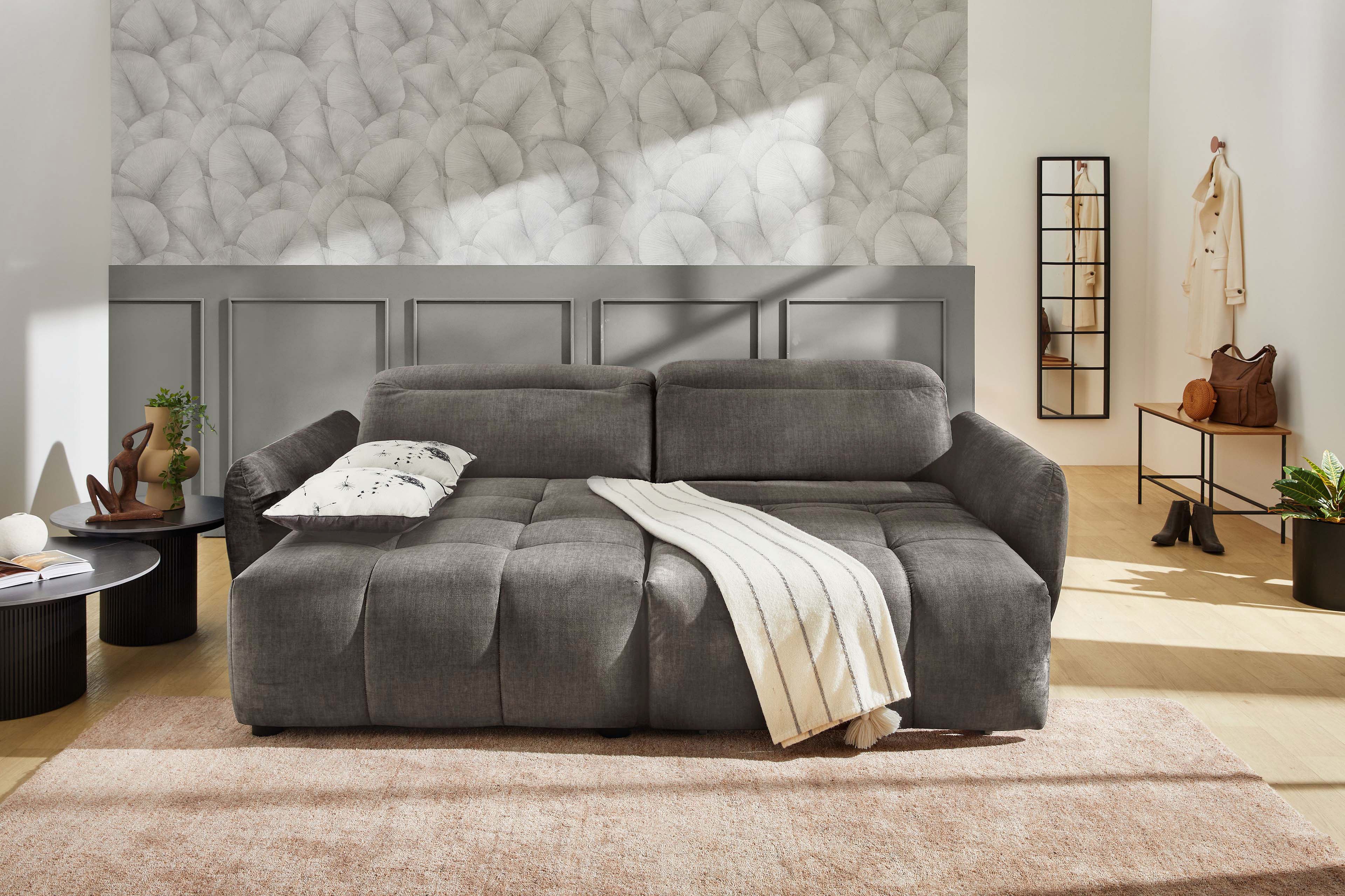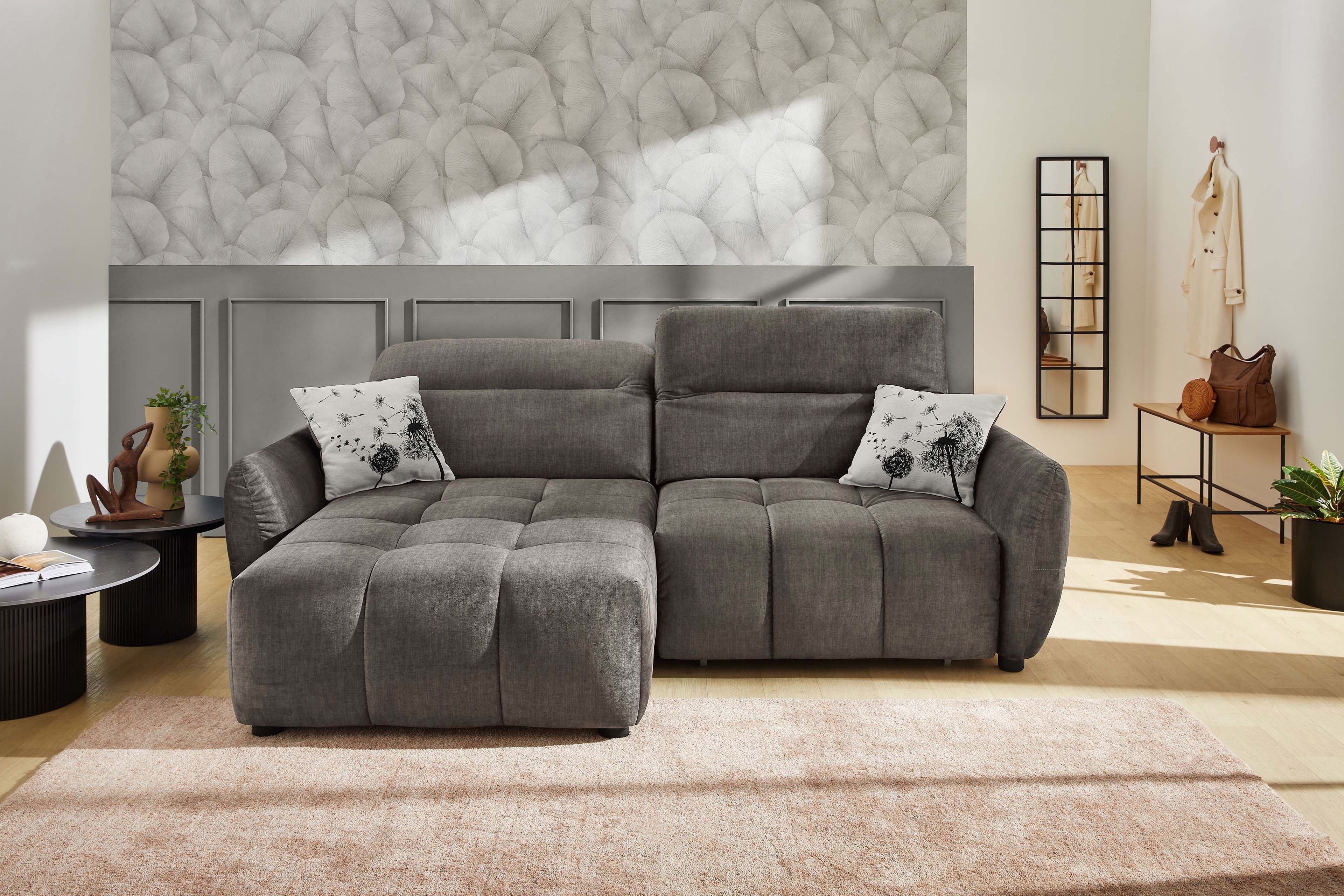 Dieses attraktive Ecksofa aus dem Hause Jockenhöfer vereint Stil, Komfort und Bequemlichkeit auf höchstem Niveau. Die schön geformte Polstergarnitur präsentiert sich im eleganten Grauton mit schwarzen Kunststofffüßen und ist zudem mit vielerlei Details, wie den sofort ins Auge fallenden, quadratisch angeordneten Einzügen in der Sitzfläche, versehen, welche zusammen mit der stylishen Blocksitzausführung sowie dem voluminös runden Design ein äußerst charmantes Gesamtbild erzeugen. Zoom ist umlaufend mit einem weichen Velours bezogen, sodass die Garnitur mit einem Stellmaß von ca. 191 x 260 cm auch beliebig frei im Raum platziert werden kann. Eine bequeme Polyätherschaumpolsterung auf einer stabilen Wellenunterfederung sorgt für einen hervorragenden Sitz- sowie Liegekomfort und die hochwertige Verarbeitung der Materialien garantiert eine lange Lebensdauer sowie eine hohe Strapazierfähigkeit. Ebenso verfügt diese Polsterecke über zwei unabhängig voneinander verstellbare Kopfteile und ist zudem mit einer praktischen, motorischen Sitztiefenverstellung sowie einem USB-A und USB-C Ladeport ausgestattet. Durch den elektromotorischen Auszug erhalten Sie per Knopfdruck ca. 60 cm mehr Sitztiefe und können es sich auf einer ca. 214 x 130 cm großen Relax- sowie Liegefläche so richtig gemütlich machen. Zwei Wende-Zierkissen im modischen Dessin komplettieren den Lieferumfang dieser tollen Polstergarnitur. Zoom von Job - in linker und rechter Ausführung lieferbar.