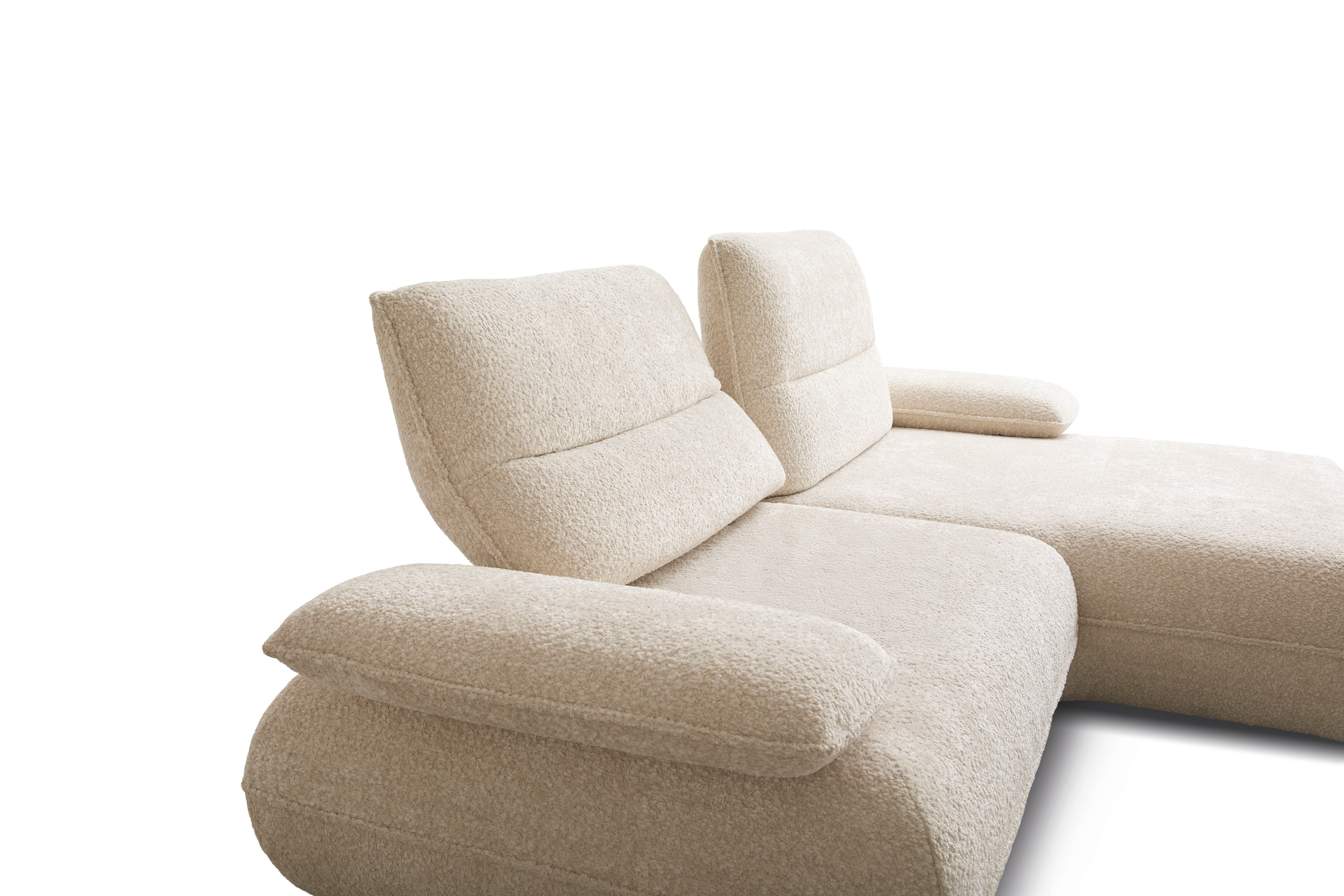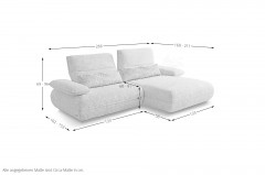 Wohlfühlmomente länger genießen – mit dem kompakten Ecksofa Amy aus dem Hause KOINOR Polstermöbel werden Wohnträume wahr. Die Zusammenstellung aus einem großen 1-Sitzer sowie einer großen Liege eröffnet ein Stellmaß von etwa 266 x 160-211 cm und lässt sich somit hervorragend in kleinere Wohnzimmer integrieren. Zudem lässt sich das Modell, dank seines echt bezogenen Rückens, auch als Raumteiler zwischen Wohn- und Essbereich platzieren. Das bodentiefe Volumen gepaart mit einer üppigen Formensprache lässt das Sofa kraftvoll und zugleich anziehend wirken, wohingegen sanfte Rundungen sowie das angenehm weiche Chenille-Flachgewebe in Creme das Äußere der Eckcouch charmant abrunden. Für den nötigen Komfort sorgt eine besonders legere Polsterung aus einem hochwertigen Polyschaum, welcher auf einer Wellenunterfederung ruht. Zudem ist das Modell von Haus aus mit zahlreichen Komfortfunktionen ausgestattet, um das Sitzerlebnis stets an Ihre individuellen Bedürfnisse anpassen zu können. So lässt sich die Sitztiefe durch das Zurücksetzen des Rückens auf großzügige ca. 91 cm erweitern, um eine behagliche Relaxposition einnehmen zu können. Der manuell verstellbare Rücken sowie die Armteile sorgen darüber hinaus für ein ergonomisch anschmiegsames Wohlbefinden in jeder Position. Aufrecht sitzen oder relaxt liegen – mit der Polstergarnitur Amy von KOINOR bleiben keine Wünsche offen.