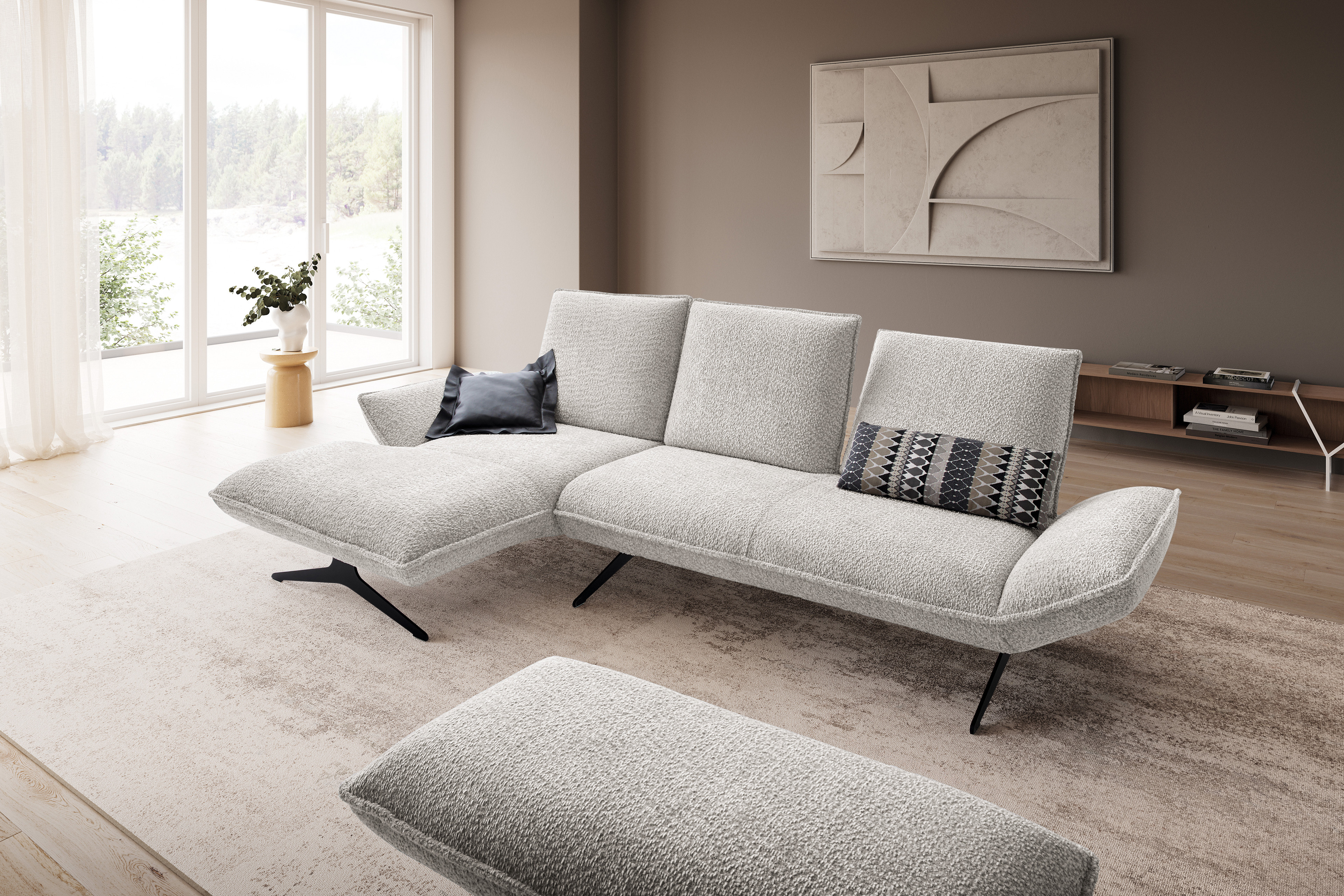 Sie haben Ihre neue Wohnung mit viel Liebe zum Detail eingerichtet und jetzt fehlt nur noch ein Möbelstück, das kompromisslosen Luxus mit vollendeter Entspannung vereint? Entdecken Sie Buddy - die Design-Ikone aus dem Hause KOINOR. Hier trifft meisterhafte Handwerkskunst auf urbane Ästhetik. Buddy fasziniert durch sein spannendes Spiel der Gegensätze: Klare, kubische Formen verschmelzen mit einladend voluminösen Polstern zu einem optischen Highlight. Gehüllt in ein attraktives Chenille-Flachgewebe im zeitlosen Grau strahlt dieses Ecksofa eine zeitlose Eleganz aus, die sich nahtlos in Ihr Interieur einfügt. Da auch der Rücken im gleichen Material bezogen ist, genießen Sie absolute architektonische Freiheit bei der Raumgestaltung. Aber das KOINOR Sofa sieht nicht nur fantastisch aus, es fühlt sich auch, dank einer weichen Polsterung aus einem Polyschaum, so an. Der Rücken lässt sich manuell nach hinten verstellen, wodurch sich die Sitztiefe auf großzügige ca. 61 cm erweitert. Das ist kein einfaches Sitzen mehr - das ist Entspannung auf höchstem Niveau. Machen Sie keine Kompromisse, wenn es um Ihren Komfort geht. Kontaktieren Sie noch heute unsere Experten per Telefon, Mail oder Live-Chat für Ihre persönliche Wunschkonfiguration. Erleben Sie Design und Qualität Made in Germany - Buddy von KOINOR.