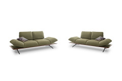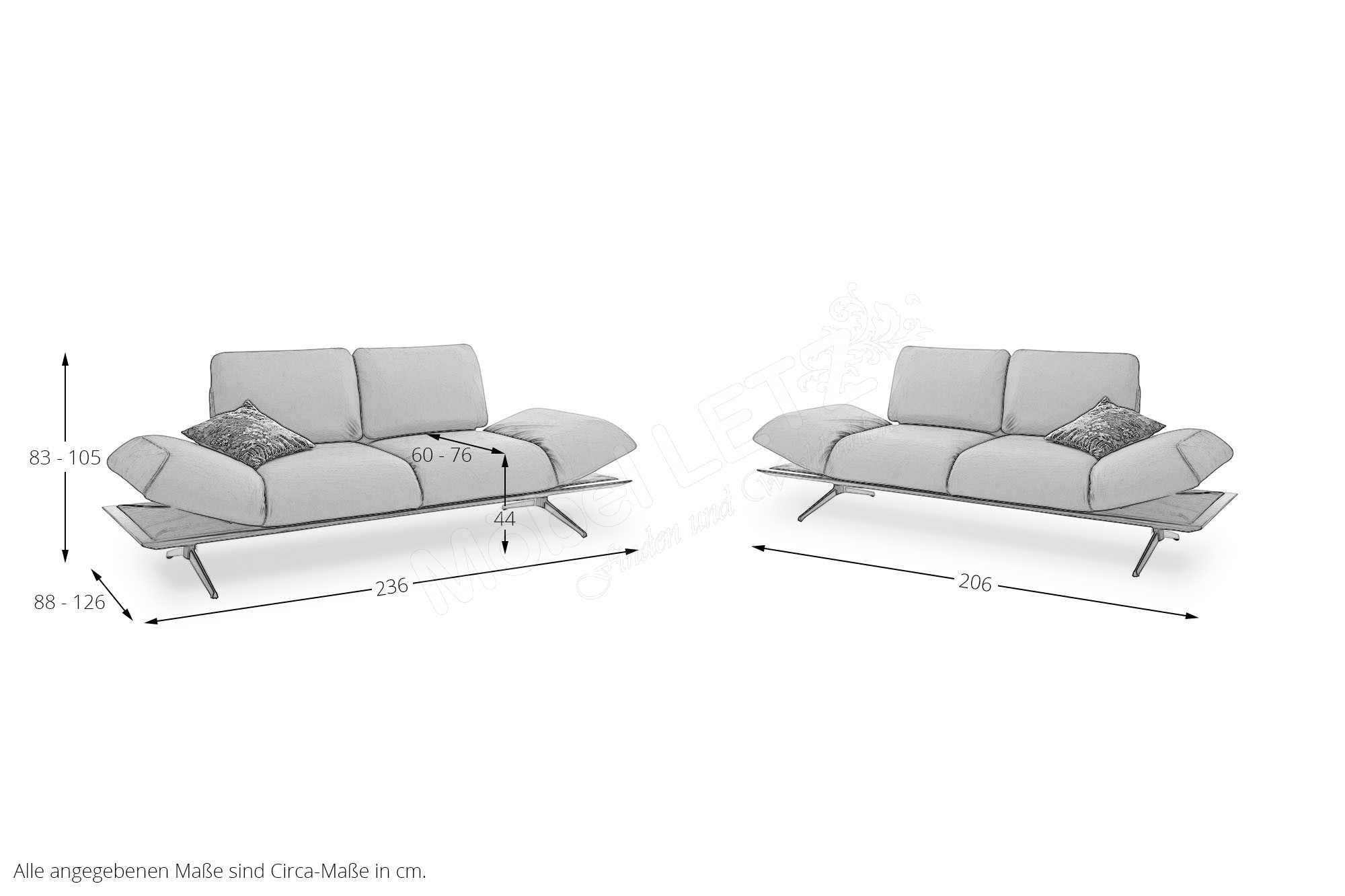 Ein attraktives Polsterduo, bestehend aus einem 2,5-Sitzer und einem 2-Sitzer, präsentiert der Hersteller KOINOR mit dem hier abgebildeten Modell Fieno vor. Die kubisch anmutenden Formen des Sitz- sowie Rückenbereiches wurden mit viel Liebe zum Detail abgerundet, wodurch die Garnitur einen modernen, aber auch wohnlichen Charakter erhält. Hervorgehoben wird das edle Design durch einen schmalen Rahmen, welcher hier in der Ausführung Nussbaum abgebildet ist, unter unseren Zusatzoptionen aber gegen einen komplett bezogenen Rahmen ausgetauscht werden kann. Auch die Fußausführung sowie die Nahtfarbe können an Ihre individuellen Vorstellungen angepasst werden, um ein einzigartiges Sitzmöbel zu kreieren. Für den nötigen Komfort sorgt eine angenehm weiche Polsterung aus einem Polyschaum - nehmen Sie Platz und kosten Sie Ihre freie Zeit in vollen Zügen aus. Dank der ausgeklügelten Funktionen lässt sich der Rücken aufklappen und nach hinten stellen sowie die Armlehnen in ihrer Position verstellen - somit unterstützt Sie das Lederduo sowohl beim aufrechten Sitzen als auch beim gemütlichen Zurücklehnen. Damit Sie auch mal alle Viere von sich strecken können, lässt sich der 2,5-Sitzer mit einem beidseitigen Schwenksitz erweitern - hier lässt sich die Sitzfläche inklusive des Armteils um 90° nach vorn drehen, um die Sitztiefe auf ca. 116 cm zu erweitern. Heute bestellen und morgen nicht mehr hergeben wollen - Fieneo aus dem Hause KOINOR Polstermöbel.