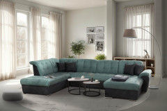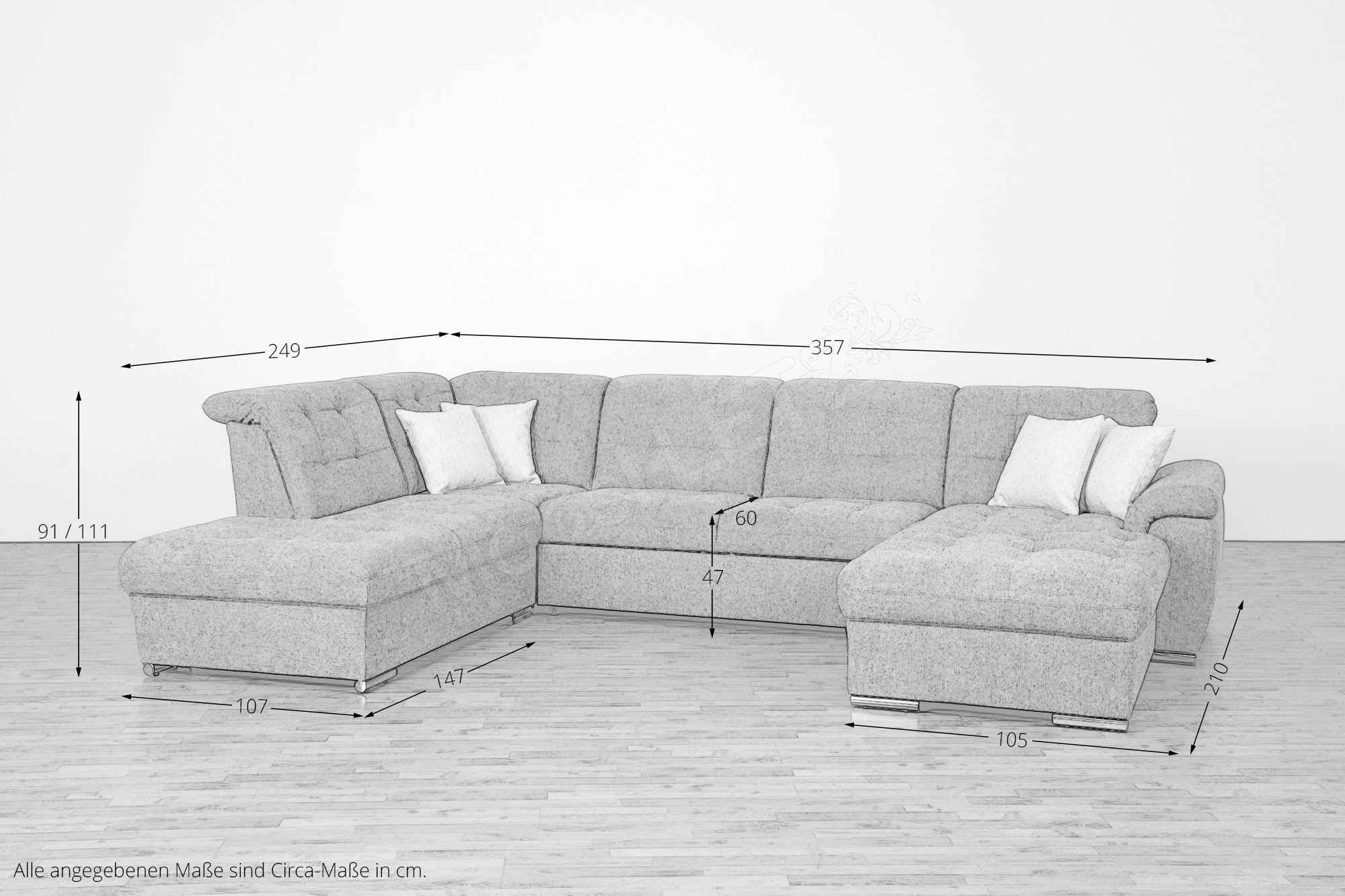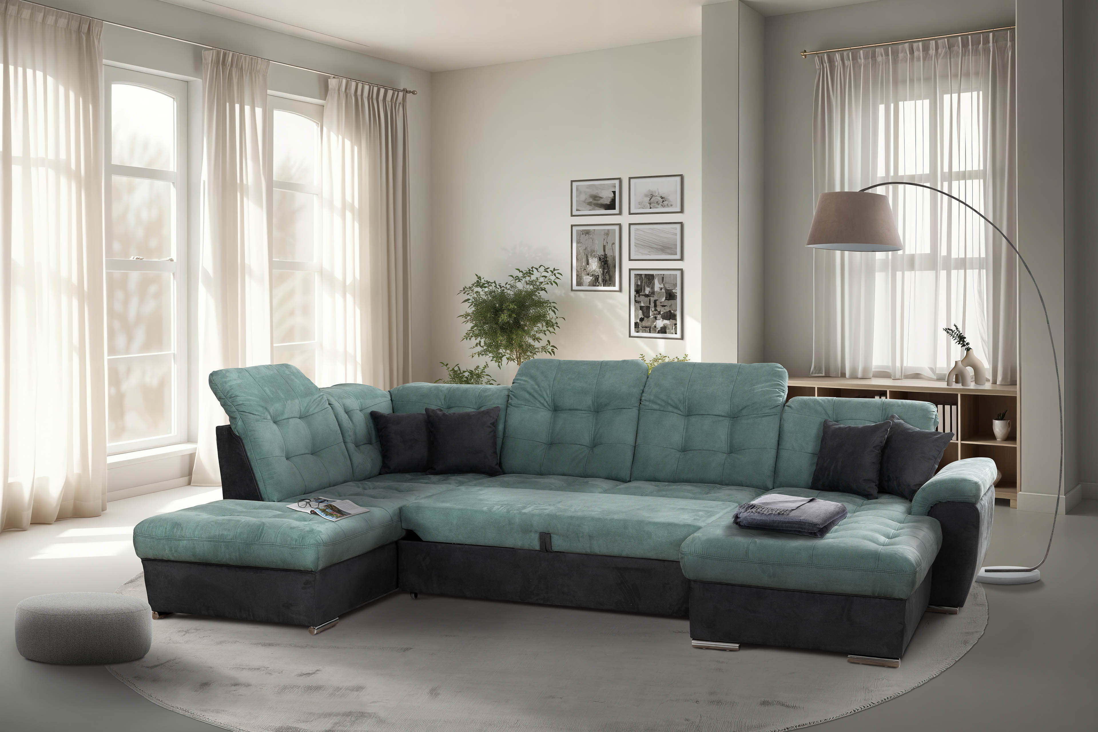 Die charmante Wohnlandschaft Bilbao aus dem Hause Matex ist eine gemütliche und kuschelige Ruhe-Oase mit einem wahnsinnig großen Platzangebot auf einem Stellmaß von etwa 249 x 357 x 210 cm - Wohlfühlfläche für die ganze Familie, Freunde sowie Bekannte. Mit diesem XXL-Sofa finden Sie den perfekten Ort, um abends in friedvoller Atmosphäre mit dem Partner und den Kindern den Tag zu besprechen oder glückliche Momente ganz für sich allein zu genießen. Ein angenehmes Komfortgefühl bietet die Kaltschaumpolsterung, die auf Nosagfedern ruht und einen hervorragenden Sitzkomfort garantiert. Zusätzlich sorgt die bereits integrierte Kopfteilverstellung für eine entspannende Wirkung und erholsame Entlastung des Nackenbereichs beim Anlehnen. Finden Sie Ihre Lieblingsposition, in der Sie bequem ausspannen sowie die Seele baumeln lassen können, tanken Sie Energie für neue Aufgaben und genießen Sie das Leben in vollen Zügen. Aber Matex steht nicht nur für fantastische Behaglichkeit, die charmanten Polstergarnituren sind sowohl funktional als auch optisch ansprechend. So auch bei diesem Modell: Mit der optionalen Schlaffunktion bietet das Sofa eine Liegefläche von ca. 264 x 126 cm, auf der Sie abends die Beine bei der Lieblingsserie langmachen können und immer auf spontane Übernachtungsgäste vorbereitet sind. Darüber hinaus trumpft das Möbelstück mit einem Microfaserbezug in den Farben Petrol sowie Anthrazit auf, wodurch Ihr Wohnbereich ein traumhaftes Gesamtbild erhält. Verwirklichen Sie Ihren Traum von einem perfekt eingerichteten Zuhause und bestellen Sie noch heute Ihre Matex Polstergarnitur.