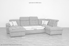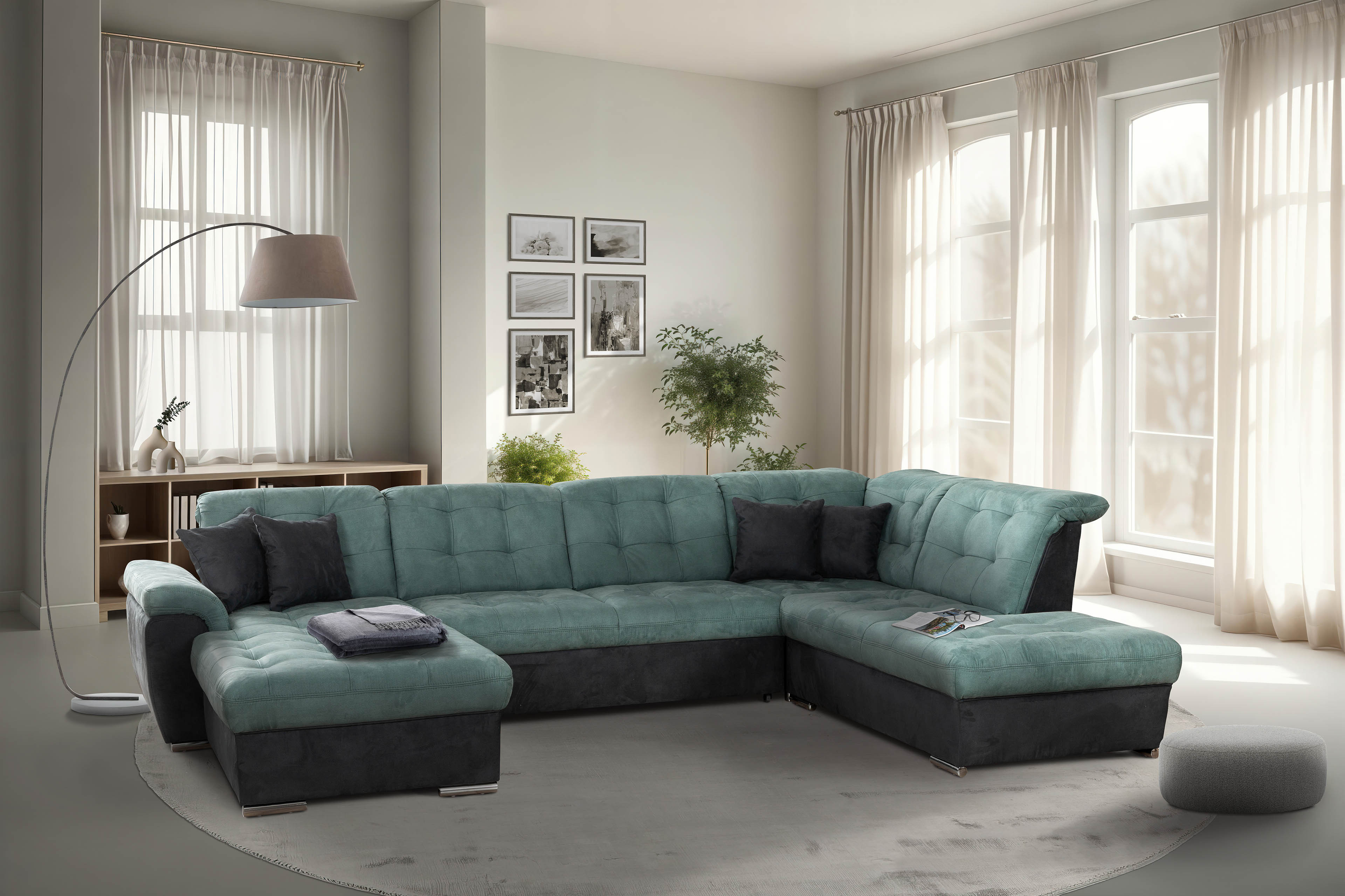 Die charmante Wohnlandschaft Bilbao aus dem Hause Matex ist eine gemütliche und kuschelige Ruhe-Oase mit einem wahnsinnig großen Platzangebot auf einem Stellmaß von etwa 210 x 357 x 249 cm - Wohlfühlfläche für die ganze Familie, Freunde sowie Bekannte. Mit diesem XXL-Sofa finden Sie den perfekten Ort, um abends in friedvoller Atmosphäre mit dem Partner und den Kindern den Tag zu besprechen oder glückliche Momente ganz für sich allein zu genießen. Ein angenehmes Komfortgefühl bietet die Kaltschaumpolsterung, die auf Nosagfedern ruht und einen hervorragenden Sitzkomfort garantiert. Zusätzlich sorgt die bereits integrierte Kopfteilverstellung für eine entspannende Wirkung und erholsame Entlastung des Nackenbereichs beim Anlehnen. Finden Sie Ihre Lieblingsposition, in der Sie bequem ausspannen sowie die Seele baumeln lassen können, tanken Sie Energie für neue Aufgaben und genießen Sie das Leben in vollen Zügen. Aber Matex steht nicht nur für fantastische Behaglichkeit, die charmanten Polstergarnituren sind sowohl funktional als auch optisch ansprechend. So auch bei diesem Modell: Mit der optionalen Schlaffunktion bietet das Sofa eine Liegefläche von ca. 264 x 126 cm, auf der Sie abends die Beine bei der Lieblingsserie langmachen können und immer auf spontane Übernachtungsgäste vorbereitet sind. Darüber hinaus trumpft das Möbelstück mit einem Microfaserbezug in den Farben Petrol sowie Anthrazit auf, wodurch Ihr Wohnbereich ein traumhaftes Gesamtbild erhält. Verwirklichen Sie Ihren Traum von einem perfekt eingerichteten Zuhause und bestellen Sie noch heute Ihre Matex Polstergarnitur.