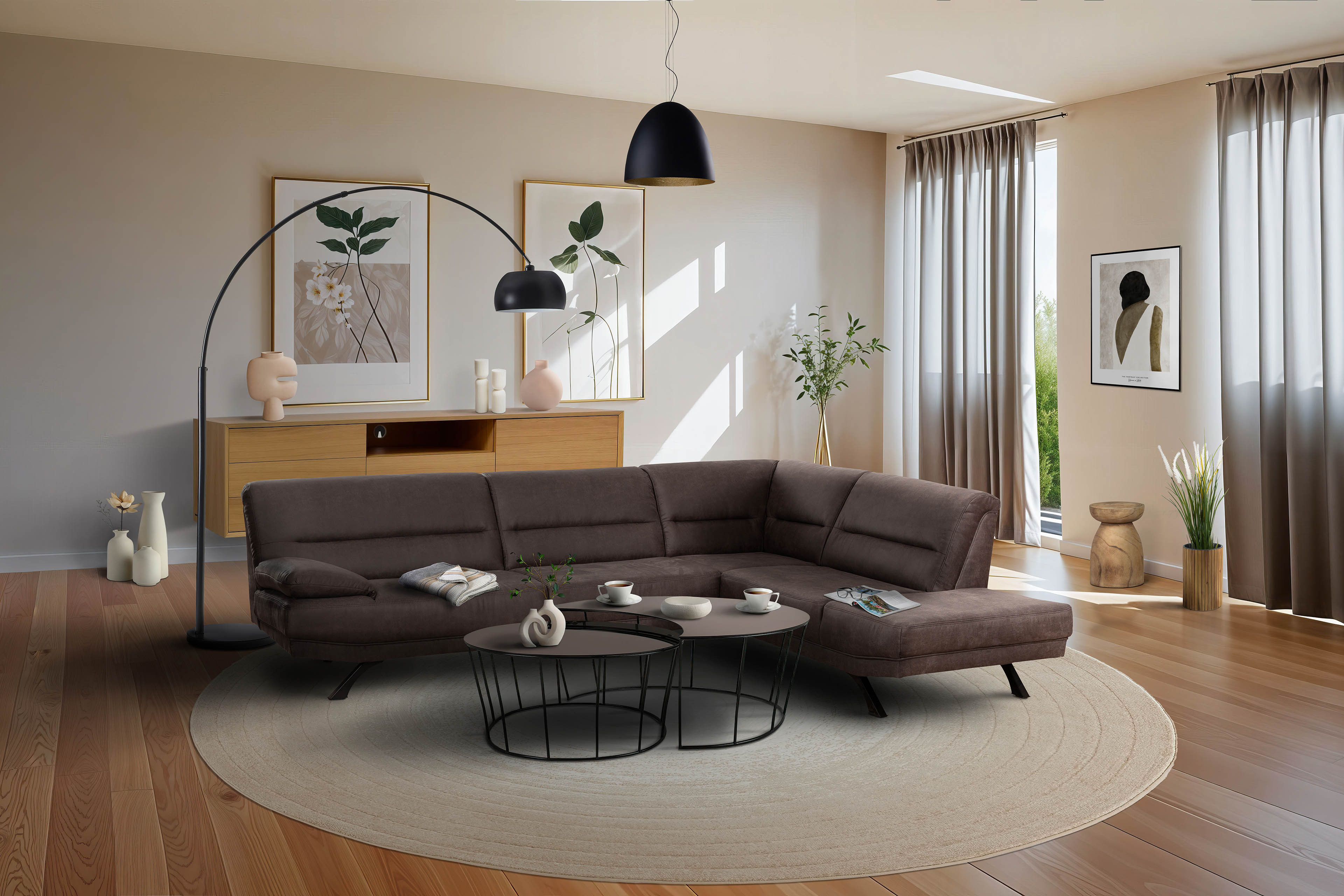 Die Eckgarnitur Bruno-LE18 aus der modernen Kollektion von Matex strahlt durch ihr braunes Microfasergewand zeitlose Eleganz aus. Dank der dezenten Farbgestaltung fügt sich das Möbelstück nahtlos in bestehende Einrichtungskonzepte ein und harmoniert ebenso gut mit neuen Designideen. Die Garnitur besteht aus einem komfortablen 3-Sitzer mit Armlehne sowie einer praktischen 2-sitzigen Ottomane. Mit einem großzügigen Stellmaß von etwa 293 x 228 cm bietet sie viel Raum für entspannte Momente mit der Familie, gesellige Treffen mit Freunden oder berufliche Gespräche. Besonders einladend ist sie für gemeinsame Heimkinoabende, begleitet von köstlichem Finger-Food und erfrischenden Getränken. Der Sitzkomfort wird durch eine hochwertige Kaltschaum-Polsterung auf Nosagfedern garantiert, die optimale Unterstützung und Bequemlichkeit bietet. Damit die Garnitur individuell im Raum positioniert werden kann, ist der Rücken vollständig bezogen - so lässt sie sich sowohl klassisch vor der Wand als auch kreativ als Raumtrenner platzieren. Ihren Gestaltungsideen sind keine Grenzen gesetzt, insbesondere durch zusätzliche Optionen, wie eine passende Hockerbank, alternative Fußvarianten oder die vielfältige Bezugskollektion unter "Farbe ändern". Bereichern Sie Ihr Zuhause mit der stilvollen Eckcouch Bruno-LE18 von Matex und lassen Sie sich von ihrer Vielseitigkeit und Qualität überzeugen. Ein weiterer Schritt zu mehr Wohnkomfort und zeitgemäßem Design wartet darauf, Teil Ihrer Einrichtung zu werden.