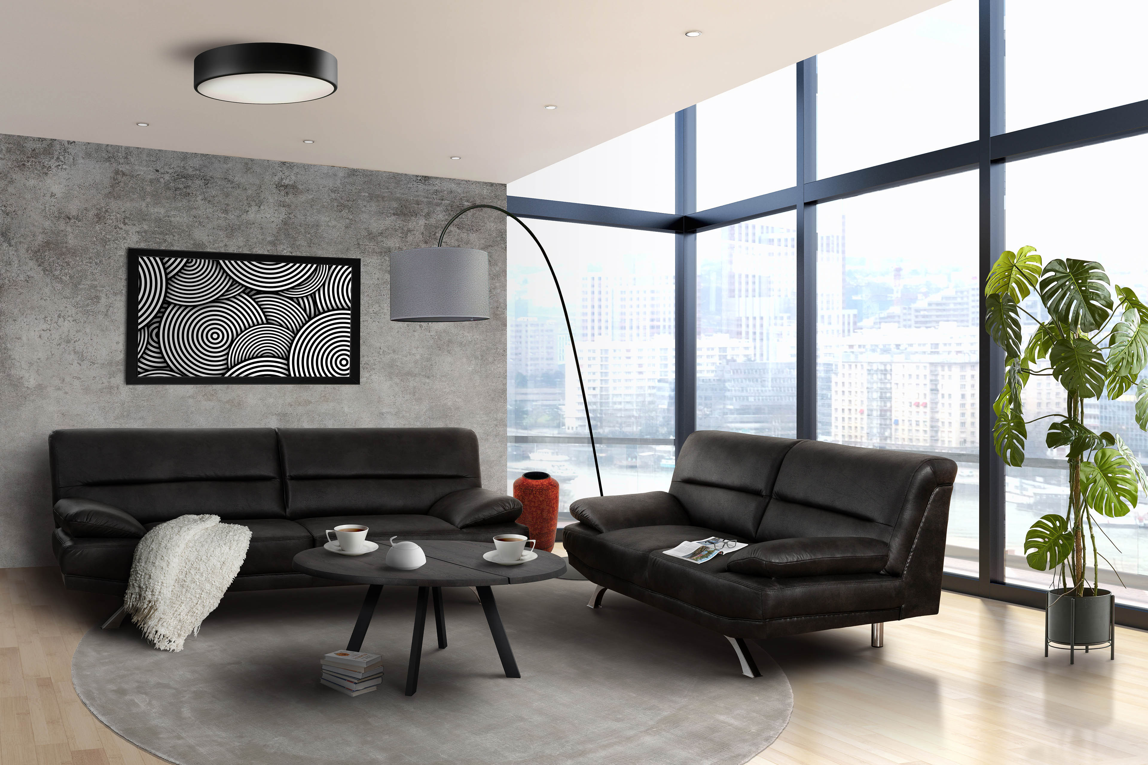 Zeitlos, elegant und für jedes Interieur geeignet - Bruno-LE18 von Matex. Bestehend aus einem 3er-Sofa sowie einem 2er-Sofa ist dieses Polsterset der ideale Begleiter für Jung und Alt. Ob als attraktive Sitzgruppe für Büros und Warteräume oder als glamouröse Sitzgelegenheit für das Wohnzimmer, die Garnitur sorgt mit ihrem zeitlosen anthrazitfarbenen Microfaserbezug sowie den dazu passenden verchromten Metallfüßen für die nötige Eleganz und lässt sich dank der echt bezogenen Rücken individuell sowie ganz nach Ihrem Belieben frei im Raum platzieren. Kommen Sie nach einem erfolgreichen Arbeitstag nach Hause, gönnen Sie sich einen leckeren Cappuccino und lassen Sie sich von Ihrer neuen Errungenschaft nach der Arbeit begleiten. Die Kaltschaumpolsterung mit Nosagunterfederung unterstützt Ihren Wohlfühlkomfort und lädt zum Verweilen, Entspannen sowie Abschalten ein. Mit einem zusätzlichen Hocker haben Sie jederzeit die Möglichkeit, Ihre müden Beine hochzulegen und eine ganz bequeme, zurückgelehnte Position einzunehmen. Machen Sie Bruno-LE18 zu Ihrem Lieblingsplatz und genießen Sie stundenlange Erholungsmomente in Ihrer Ruhezone. Wem die dunkle Farbe der Matex Sitzgruppe nicht zusagt, der kann in der Rubrik "Wunschbezug - Farbe ändern" aus einer großen Auswahl an Materialien wählen, um sein neues Ensemble ganz nach seinem Geschmack und Lebensstil zu gestalten. Stylisches Design, tolle Qualität - Bruno-LE18 von Matex.