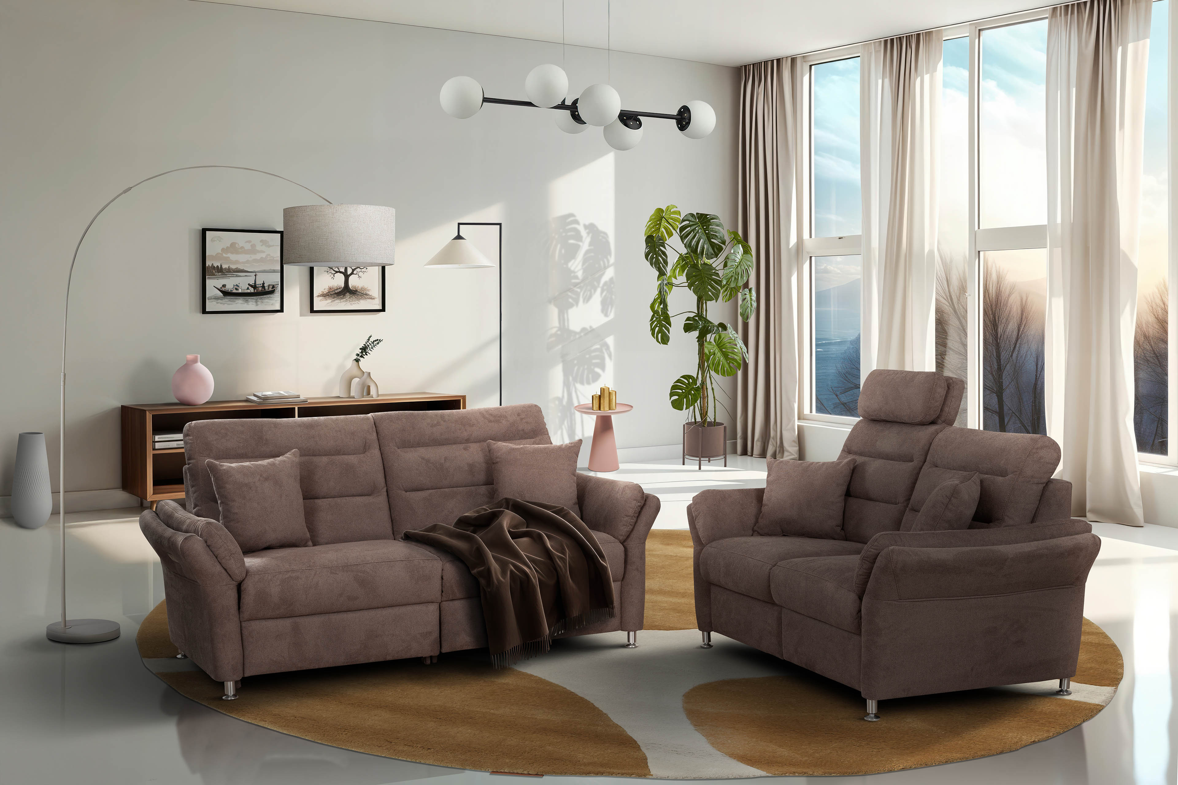 Zeitlose Eleganz trifft auf puren Komfort - mit dem Modell Foreno aus dem Hause Matex. Verwandeln Sie Ihr Wohnzimmer in eine wahre Wohlfühloase mit dieser exklusiven Polstergarnitur, bestehend aus einem großzügigen 3-Sitzer und einem gemütlichen 2-Sitzer. Der pflegefreundliche Flockstoffbezug in einem warmen Braun-Ton verleiht Ihrem Raum nicht nur eine edle Optik, sondern überzeugt auch durch seine angenehme Haptik und Langlebigkeit. Neben dem wunderbaren Aussehen der Polstergruppe garantiert Ihnen die Kombination aus einer hochwertigen Kaltschaumpolsterung und der stabilen Nosagunterfederung ein ergonomisches Sitzen sowie langanhaltende Formstabilität - bestens geeignet für einen Serienmarathon am Abend oder dem Lesen einer spannenden Lektüre am Nachmittag. Für die maximale Entspannung steht Ihnen in den Zusatzoptionen ein besonderes Highlight zur Verfügung: eine motorische Relaxfunktion für beide Elemente, die Sie mittels Touch-Bedienung in eine erholsame Liegeposition befördert. Gönnen Sie sich eine Auszeit aus dem hektischen Alltag und tanken Sie die Energiereserven wieder auf! Ferner lässt sich der Look dieser Matex Polstergarnitur ganz an Ihren persönlichen Geschmack anpassen: Wählen Sie zwischen eleganten alufarbigen Metallfüßen für einen modernen Akzent oder schlichten schwarzen Zylinderfüßen für zeitlose Souveränität und nutzen Sie die Rubrik "Farbe ändern", wo Ihnen verschiedene Bezugsmaterialien sowie Nuancen zur Verfügung stehen, um Ihren Favoriten zu finden und Foreno schon bald zum festend Bestandteil Ihres trauten Heimes werden zu lassen. Diese Garnitur ist die perfekte Symbiose aus Funktionalität sowie stilvollem Design - der ideale Ort für gemütliche Abende und entspannte Stunden.