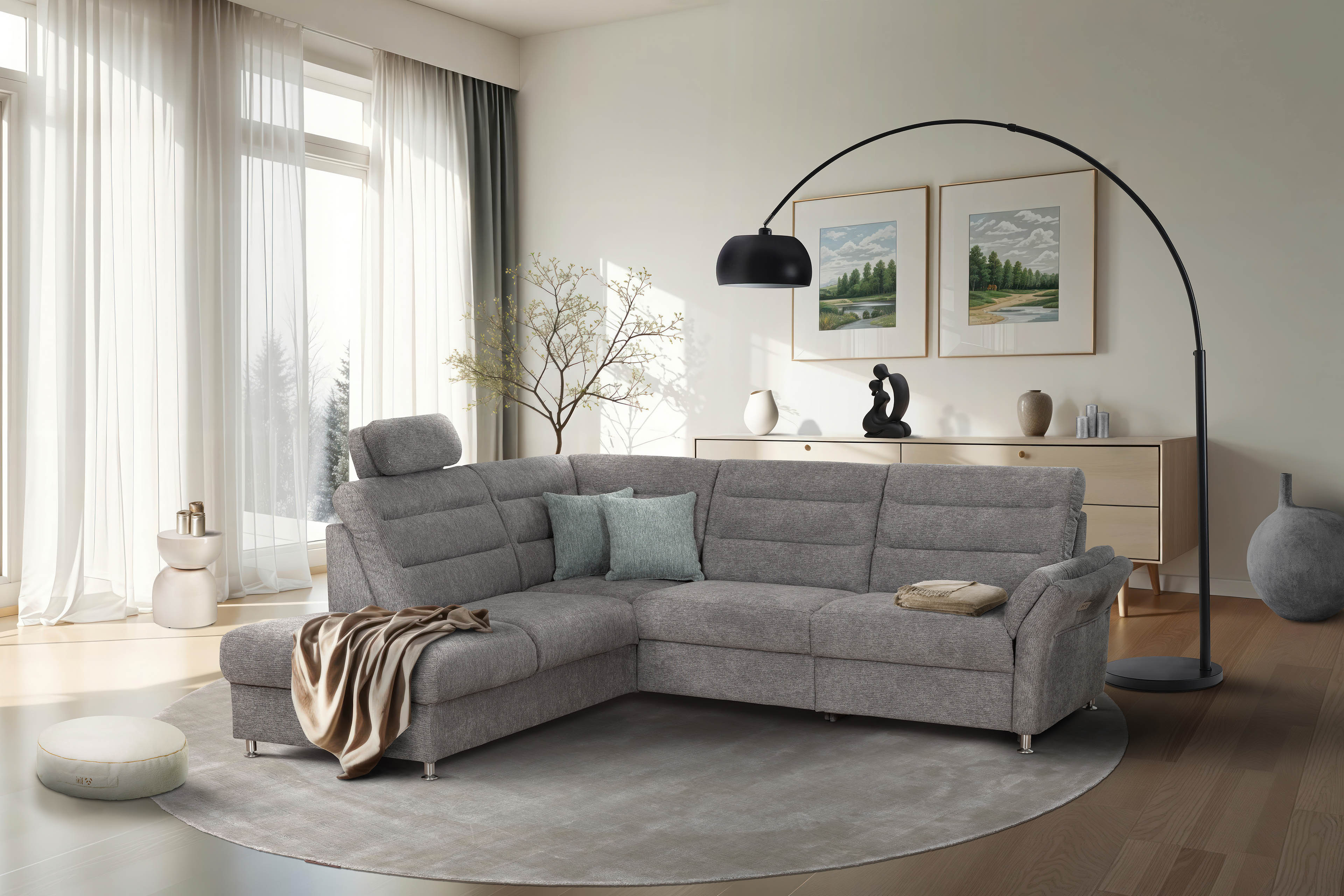 Sie wünschen sich eine Polstergarnitur, die nicht nur genügend Platz für die ganze Familie bietet, sondern sich gleichzeitig auch noch perfekt in jedes Wohnambiente einfügt? Dann finden Sie vielleicht mit dem Matex Ecksofa Foreno Ihren neuen Begleiter. Mit grauem Chenille-Flachgewebe bezogen, das für seine pflegeleichten Eigenschaften bekannt ist, sowie auf alufarbenen Metallfüßen stehend, lässt sich dieses Modell mit nahezu jedem Möbelstil kombinieren. Mit einer Grundfläche von ca. 225 x 268 cm bietet es viel Fläche zum Kuscheln mit den Kindern, eignet sich aber auch besonders gut für gesellige Gesprächsrunden mit Freunden, da hier jeder einen gemütlichen Sitzplatz findet. Die auf Nosagfedern ruhende Polsterung aus hochwertigem Kaltschaum schenkt jedem Familienmitglied sowie allen anderen Gästen einen erholsamen Komfort - wenn Sie einmal Ihre Lieblingsposition eingenommen haben, möchten Sie nie wieder aufstehen. Wie wäre es, wenn Sie nachmittags nach Hause kommen, sich in eine behagliche Wohlfühlposition gleiten lassen können und den Stress des Alltags vergessen? Dann statten Sie die Eckgarnitur mit der motorischen Relaxfunktion im äußeren Sitz des 3-Sitzers aus. Als weiteres Highlight sind über die Zusatzoptionen praktische Kopfstützen, ein quadratischer Hocker oder eine Hockerbank mit optionalem Stauraum erhältlich. Foreno von Matex konnte Sie überzeugen? Bestellen Sie jetzt Ihr neues Traumsofa.