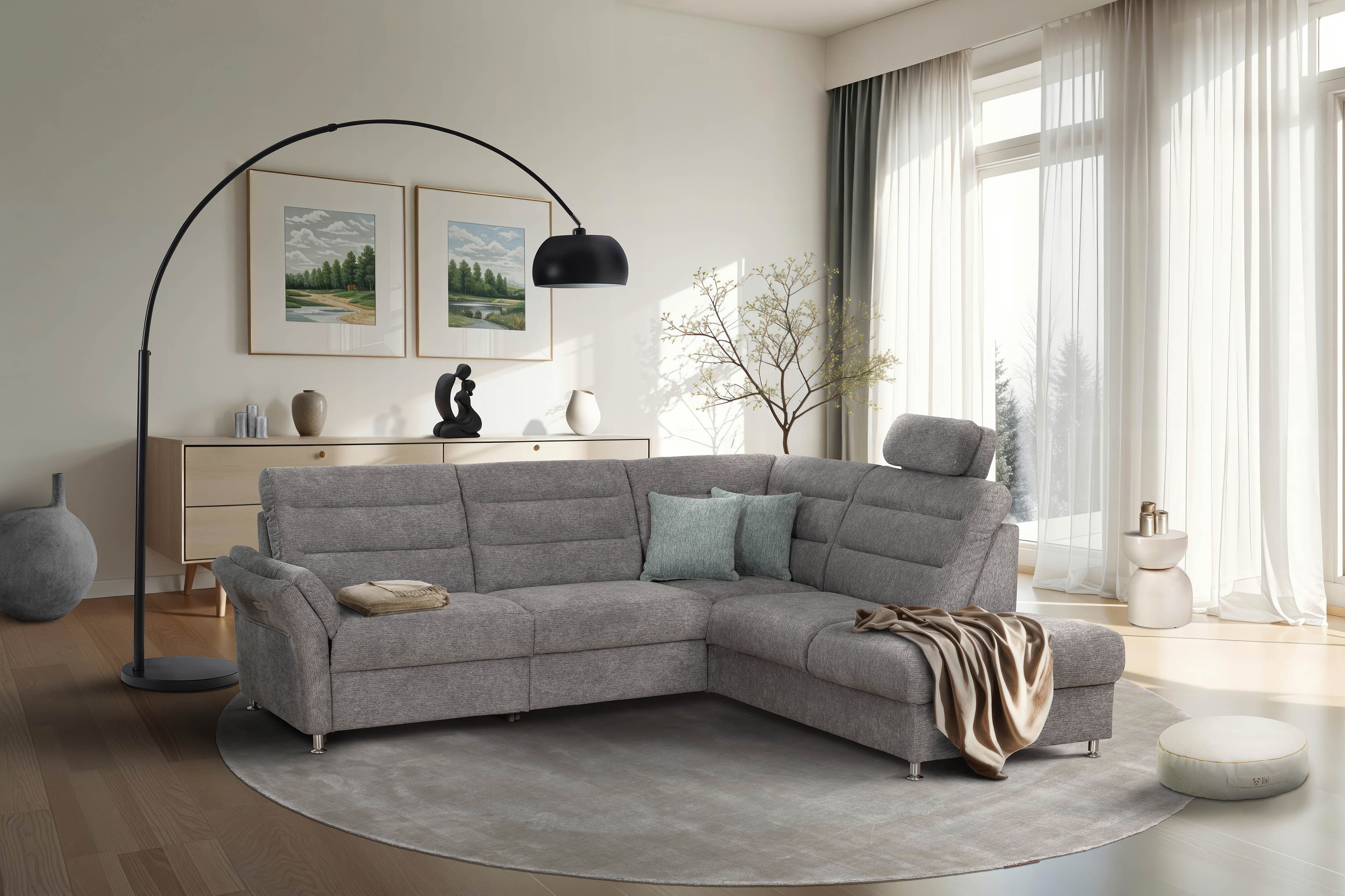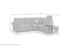 Sie wünschen sich eine Polstergarnitur, die nicht nur genügend Platz für die ganze Familie bietet, sondern sich gleichzeitig auch noch perfekt in jedes Wohnambiente einfügt? Dann finden Sie vielleicht mit dem Matex Ecksofa Foreno Ihren neuen Begleiter. Mit grauem Chenille-Flachgewebe bezogen, das für seine pflegeleichten Eigenschaften bekannt ist, sowie auf alufarbenen Metallfüßen stehend, lässt sich dieses Modell mit nahezu jedem Möbelstil kombinieren. Mit einer Grundfläche von ca. 268 x 225 cm bietet es viel Fläche zum Kuscheln mit den Kindern, eignet sich aber auch besonders gut für gesellige Gesprächsrunden mit Freunden, da hier jeder einen gemütlichen Sitzplatz findet. Die auf Nosagfedern ruhende Polsterung aus hochwertigem Kaltschaum schenkt jedem Familienmitglied sowie allen anderen Gästen einen erholsamen Komfort - wenn Sie einmal Ihre Lieblingsposition eingenommen haben, möchten Sie nie wieder aufstehen. Wie wäre es, wenn Sie nachmittags nach Hause kommen, sich in eine behagliche Wohlfühlposition gleiten lassen können und den Stress des Alltags vergessen? Dann statten Sie die Eckgarnitur mit der motorischen Relaxfunktion im äußeren Sitz des 3-Sitzers aus. Als weiteres Highlight sind über die Zusatzoptionen praktische Kopfstützen, ein quadratischer Hocker oder eine Hockerbank mit optionalem Stauraum erhältlich. Foreno von Matex konnte Sie überzeugen? Bestellen Sie jetzt Ihr neues Traumsofa.