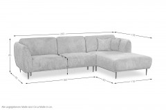 Kombinieren Sie kuschelige Behaglichkeit mit absolut gemütlichem Ambiente mit dem Matex Polstersofa Kelmis, das es versteht, trendige Akzente in jeder Räumlichkeit zu setzen und mit modernen Formen sowie elegantem Design zu überzeugen. Mit Maßen von ca. 293 x 178 cm eignet sich das Ecksofa, welches sich in unserem Angebot aus einem 2,5-Sitzer sowie einer 1-sitzigen Ottomane zusammensetzt, sowohl für große als auch für kleine Wohnräume und kann zudem als idealer Blickfang eingesetzt werden. Optisch punktet die Eckcouch mit einem wunderbar weichen Cord-Bezug in zeitlosem Grau, kombiniert mit schwarzen Metallfüßen, die für reichlich Bodenfreiheit sorgen und den eleganten Charme des Modells unterstreichen. Wenn Sie sich nach einem langen Tag gerne entspannt zurücklehnen und in Ruhe Ihre Lieblingsserie schauen, dann bietet Kelmis durch seine hochwertige Kaltschaumpolsterung mit zusätzlicher Nosagunterfederung einen herrlich angenehmen Sitzkomfort. Darüber hinaus umfasst das Angebot auch zwei dekorative Zierkissen, die im gleichen Farbton daherkommen, jedoch auch andersfarbig bestellt werden können. Mit einem passenden Hocker, erhältlich in zwei verschiedenen Größen, können Sie dieses Schmuckstück ideal ergänzen und um zusätzliche Sitzgelegenheiten bereichern. Kelmis von Matex - fühlen Sie sich zuhause!