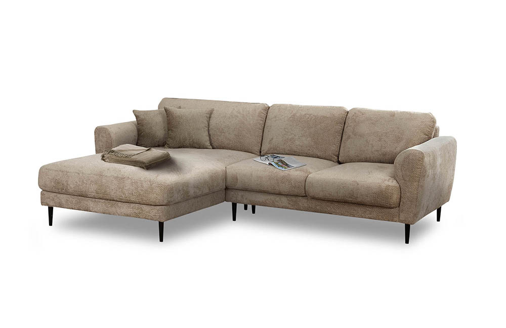 Erleben Sie das "Zuhause-Gefühl" auf eine völlig neue Art und Weise. Die Polstergarnitur Malibu-LE24 von Matex ist mehr als nur ein Sofa - sie ist Ihr individueller Wohlfühlort. Mit ihrem sanften Beige-Ton und dem pflegeleichten Chenille-Flachgewebe-Bezug, der optisch sowie haptisch gleichermaßen überzeugt, setzt sie stilvolle Akzente in Ihrem Zuhause. Die filigranen schwarzen Holzfüße verleihen dem Ecksofa eine elegante, schwebende Ausstrahlung sowie eine moderne Leichtigkeit. Dank der großzügigen Bodenfreiheit ist sie obendrein perfekt geeignet für den Einsatz eines Saugroboters. Das wahre Highlight dieser Polstergarnitur offenbart sich jedoch beim Sitzen: Die Kombination aus hochwertiger Kaltschaumpolsterung und Nosagunterfederung sorgt für ein unvergleichlich komfortables Sitzgefühl, das an das Schweben auf Wolken erinnert. Mit Sicherheit wird sie schnell zu Ihrem neuen Lieblingsplatz. Die beiliegenden Zierkissen erhöhen zusätzlich den Gemütlichkeitsfaktor - sei es beim entspannten Serienabend, beim Planen des nächsten Urlaubs oder einem wohlverdienten Powernap. Darüber hinaus können Sie Ihren Rückzugsort individuell optimieren: Entscheiden Sie sich optional für komfortable Kopfstützen, die Ihren Kopf- und Nackenbereich bei jeder Sitzposition wunderbar stützen. Falls Sie sich eine andere Farbe wünschen, bietet die Rubrik "Farbe ändern" zahlreiche Stoffvarianten und Farbnuancen, aus denen Sie Ihren persönlichen Favoriten auswählen können. Malibu-LE24 von Matex vereint Tradition sowie Moderne auf perfekte Weise und bietet Ihnen ein Sofa, das Komfort, Stil sowie Wohlgefühl harmonisch miteinander verbindet.