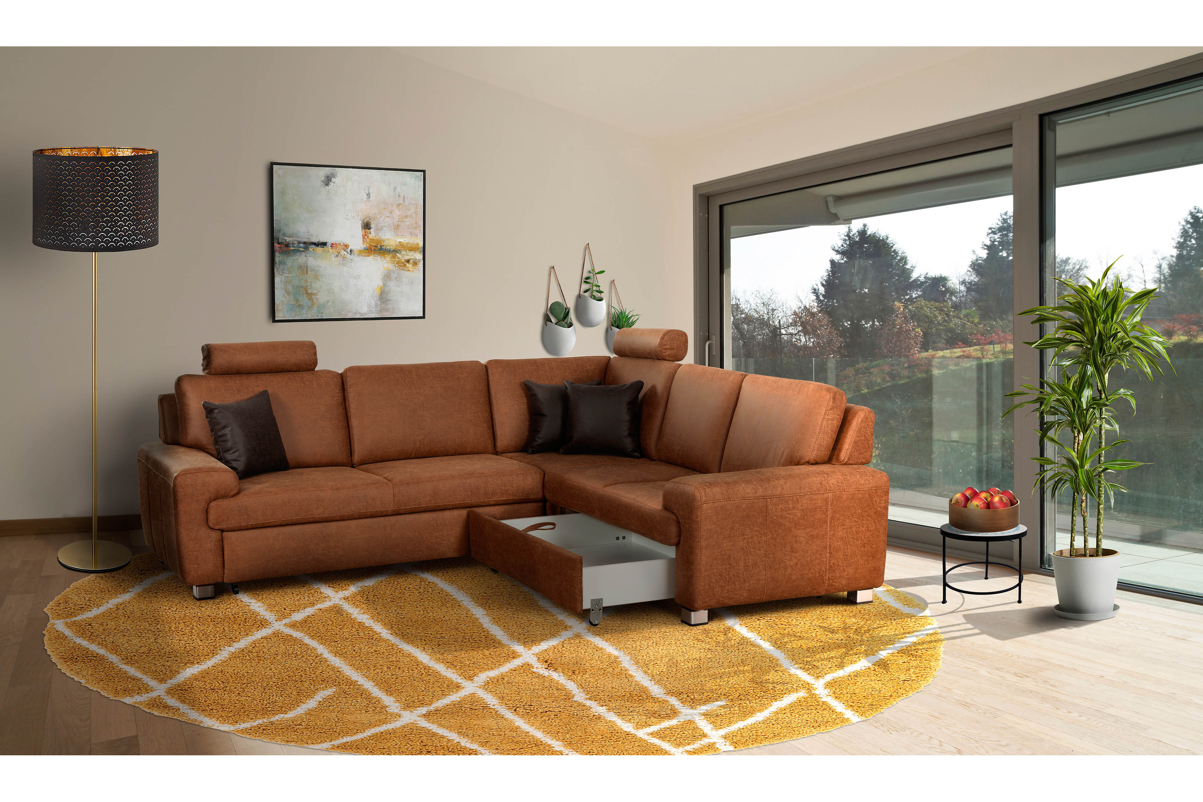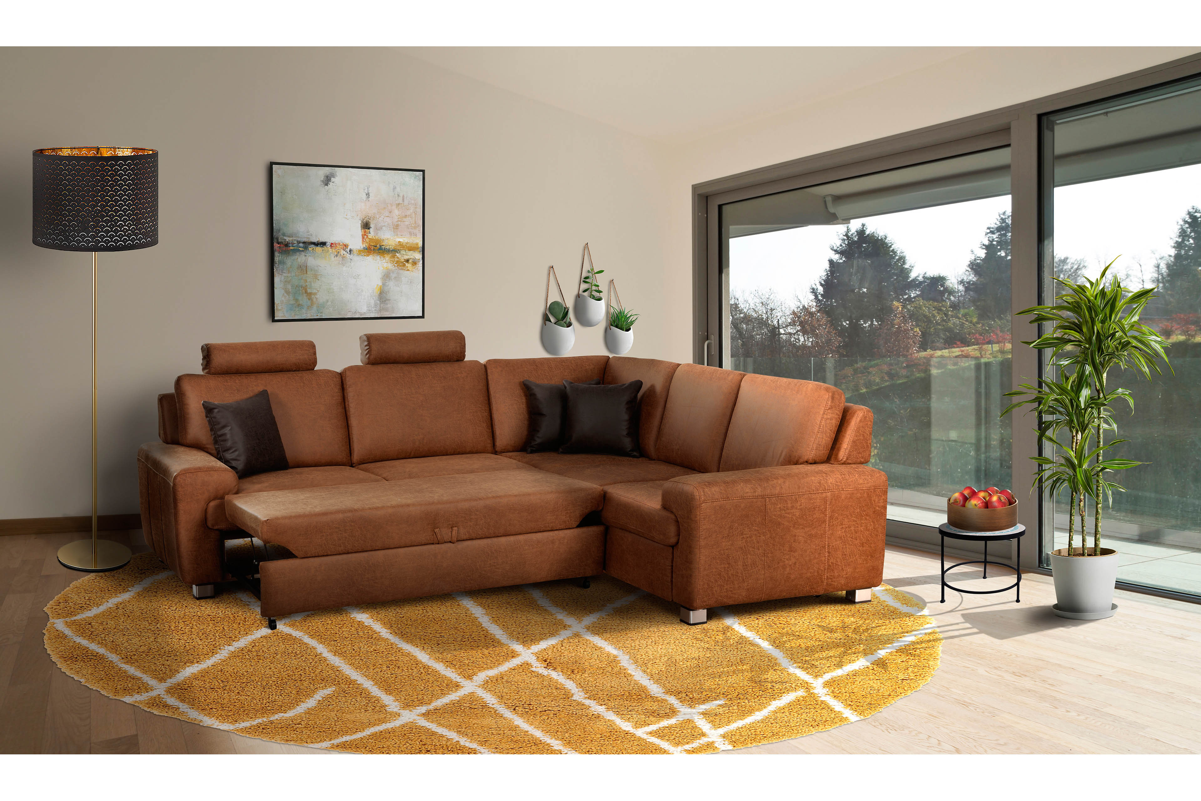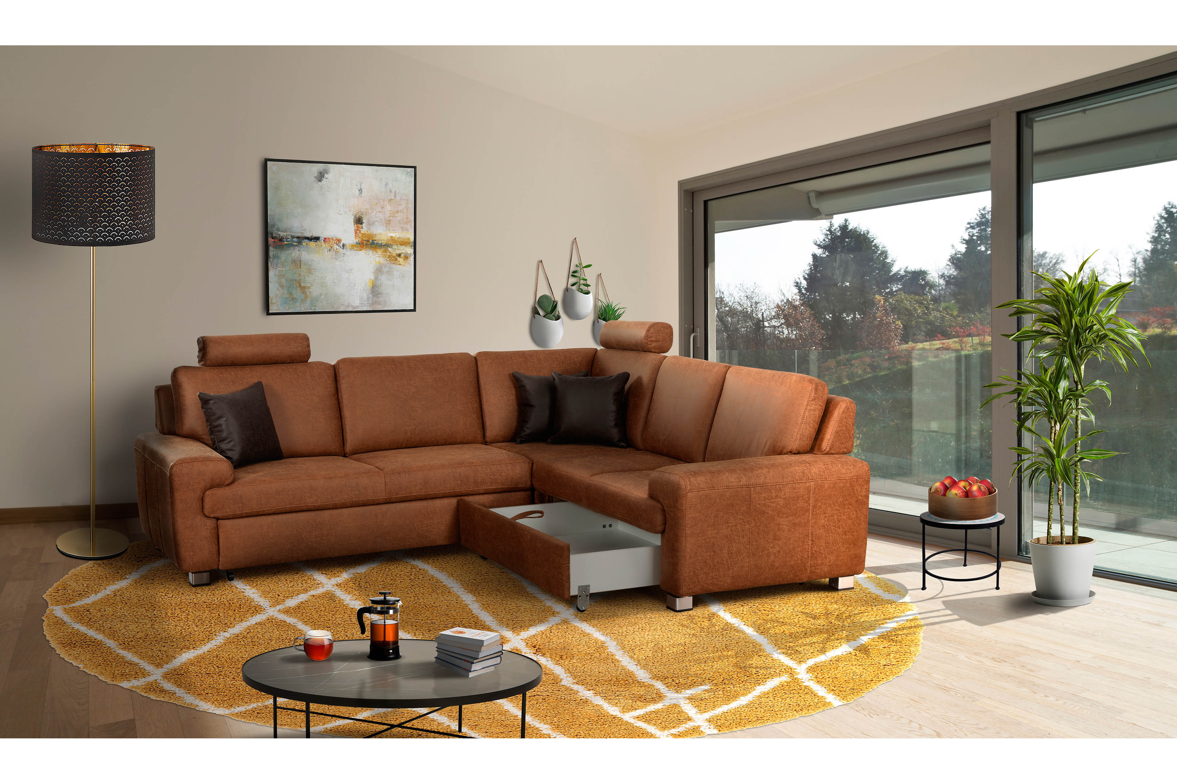 Wann haben Sie sich das letzte Mal so richtig entspannt, die Seele baumeln lassen und die Ruhe des Nichtstuns genossen? Wie wäre es mit der modernen Polstergarnitur Plaza von Matex, die ein treuer Begleiter für genau diese Augenblicke ist, jedoch auch als Wohlfühloase zum geselligen Beisammensein mit Freunden, der Familie oder für glückliche Momente mit den Kindern bestens geschaffen ist. Der Fokus liegt hier vor allem auf dem hervorragenden Komfort, hervorgerufen durch eine Kaltschaumpolsterung mit Nosagunterfederung, den Sie beim ersten Hinsetzen sofort spüren werden und so schnell nicht mehr aufstehen möchten. Zusätzlich schenken die optional erhältlichen Kopfstützen Ihrem Nackenbereich wunderbare Erholung und Entlastung beim Zurücklehnen. Das Ecksofa aus der Modellreihe Plaza hat aber noch weitere tolle Funktionen, mit denen es überzeugen kann: Neben der Schlaffunktion mit einer bequemen Liegefläche von ca. 201 x 123 cm, kann ein praktischer Schubkasten zum Verstauen all Ihrer Utensilien oder Tagesdecken über die Zusatzoptionen hinzugebucht werden. Entscheiden Sie selbst, welchen Luxus Sie zum Wohlfühlen brauchen und welche Annehmlichkeiten das Matex Sofa in Ihre eigene Traumoase verwandeln. Auf Wunsch lässt sich auch das braune Microfaser-Gewand mit der Rubrik "Wunschbezug - Farbe ändern" an Ihren persönlichen Geschmack anpassen. Bestellen Sie Ihre neue Polstergarnitur jetzt und bereichern Sie Ihr Zuhause.