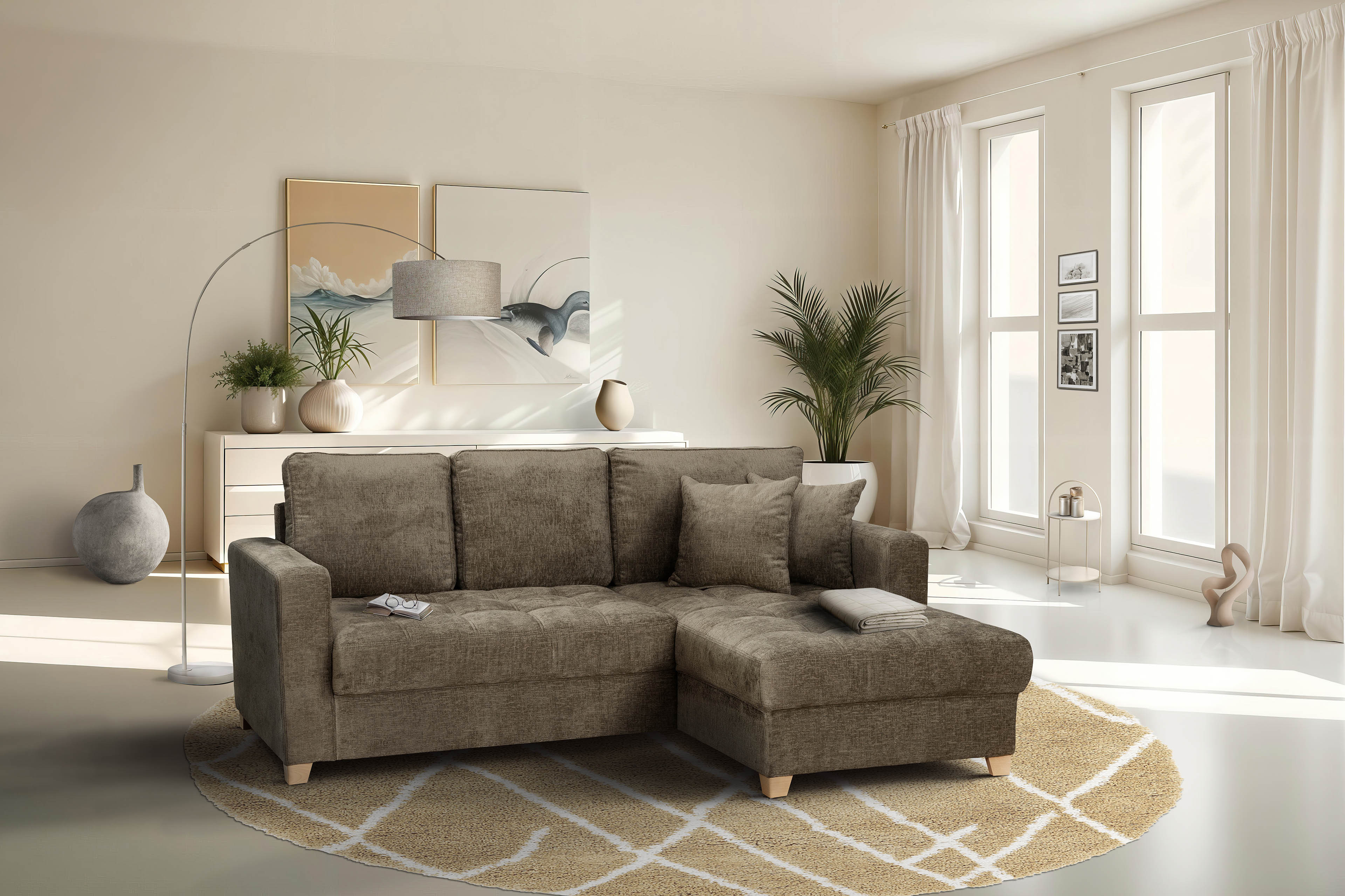 Das Matex Sofa Split-LE23 bietet viel Platz zum Kuscheln mit einem geliebten Menschen oder auch für einen geselligen DVD-Abend mit Freunden dank seiner komfortablen Stellfläche von ca. 224 x 168 cm. Gekleidet in grünem, angenehm weichen Chenille-Flachgewebe sowie stehend auf Holzbeinen in Eichefarbig geölt, fügt sich dieses Ecksofa liebevoll in nahezu jedes Wohnambiente ein und lässt sich mit vielen Möbelstilen harmonisch kombinieren. Ihrer Kreativität sind keine Grenzen gesetzt. Verwirklichen Sie Ihre Träume und bringen Sie Harmonie sowie Einklang in Ihr Zuhause. Die auf Nosagfedern gebettete Kaltschaumpolsterung fängt Sie ganz bequem auf, sodass Sie stets ein gemütliches Sitzerlebnis erfahren, um abends die Lieblingsserie zu schauen, das neueste Buch zu lesen oder sich einfach nur auszuruhen und zu entspannen - ein hohes Sitz-, Liege- sowie Anlehnvergnügen in jeder Lebenslage ist garantiert. Möchten Sie Ihre neue Errungenschaft darüber hinaus auch funktional nutzen? Dann möchten wir Ihnen die weiteren Annehmlichkeiten in den Zusatzoptionen aufzeigen: Hier haben Sie die Möglichkeit, sowohl den 2-Sitzer mit einer ausziehbaren Schlaffunktion auszustatten, um beim Filmeschauen behaglich die Beine auszustrecken, als auch ein praktisches Bettkastenfach für die Ottomane zu wählen, in welchem Decken und Kissen sicher verstaut werden können. Nun nur noch das Farbdesign des Modells mit Hilfe der Rubrik "Wunschbezug - Farbe ändern" an Ihre Wünsche anpassen und schon bald zieht Split-LE23 von Matex auch bei Ihnen ein.