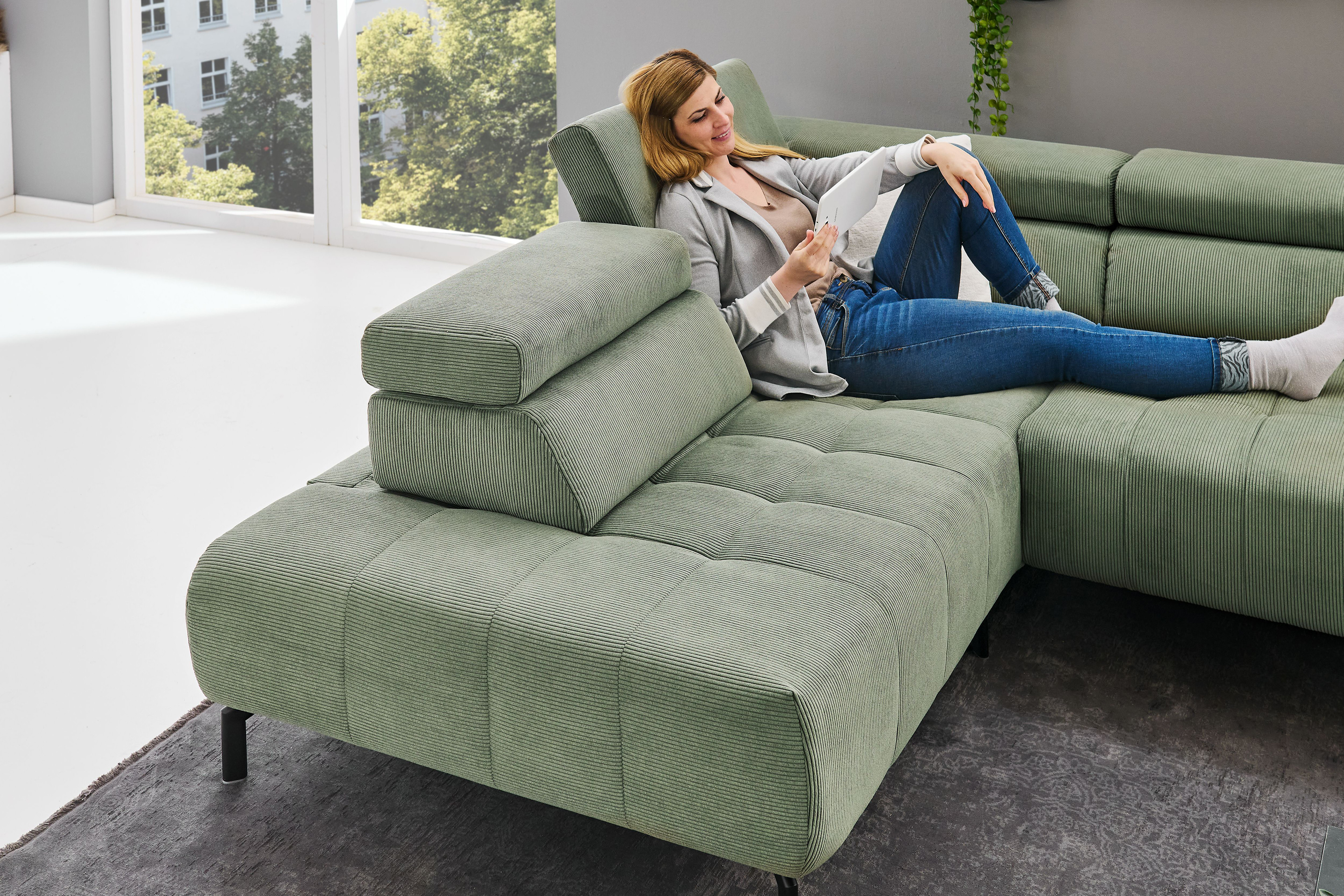MP-IN25098 von Megapol vereint modernes Design mit hervorragendem Komfort und wird so zu einem stilvollen Highlight in jedem Wohnraum. Bezogen mit einem angenehm weichen Cordbezug im schicken Grünton strahlt das Möbelstück eine dezente Eleganz aus. Getragen wird das Ecksofa von schwarzen Metallfüßen, die optisch perfekt passen und auch praktisch durchdacht sind: Mit einer Sitzhöhe von ca. 44 cm sowie einer Fußhöhe von ca. 18 cm bietet das Sofa nicht nur einen angenehmen Sitzkomfort, sondern auch ausreichend Bodenfreiheit. So kann ein Saugroboter problemlos unter ihm arbeiten, was bei der Pflege und Reinigung des Wohnbereichs von großem Vorteil ist. Die klare Linienführung, kombiniert mit der quadratischen Steppung und der Blocksitzausführung, verleiht dem Modell seinen gemütlichen sowie modernen Charakter. Die harmonische Balance aus perfekt abgestimmten Proportionen, sanften Rundungen und einem einladenden Sitzkomfort macht die Megapol Polstergarnitur zu einem idealen Rückzugsort für entspannte Stunden. Ob Sie sitzen oder liegen möchten, ein aufregendes Buch lesen oder entspannt fernsehen - MP-IN25098 ist äußerst vielseitig und bestens vorbereitet für all diese Momente. Die Polsterecke punktet mit einer durchdachten Kombination aus einem Kombi-Element mit Anstellhocker und einem 1,5-Sitzer XXL mit Armlehne, einer modelltypischen Kopfteilverstellung sowie einer bequemen Kaltschaumpolsterung und schafft trotz der eher kompakten Stellfläche von ca. 214 x 261 cm ausreichend Platz für unterschiedlichste Bedürfnisse. Für noch mehr Freiheit und Bequemlichkeit wurde die Garnitur mit einer motorischen Vorziehbank ergänzt. Durch einfaches Berühren zweier Touch-Buttons lässt sich die Sitzfläche des 1,5-sitzigen Elements um etwa 19 cm erweitern - ideal zum Ausruhen und Ausstrecken. Auch die integrierte Sitztiefenverstellung im Kombi-Element sorgt für zusätzliche Flexibilität: Durch leichtes Anheben und Vorziehen des Rückenkissens kann die Sitztiefe individuell angepasst werden. Komplettiert durch zwei dekorative Zierkissen entsteht ein Rückzugsort, der nicht nur ästhetisch überzeugt, sondern auch auf funktionale Anforderungen eingeht. MP-IN25098 aus dem Hause Megapol ist ein Polstermöbel, das Sie tagtäglich aufs Neue begeistern wird.