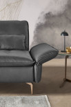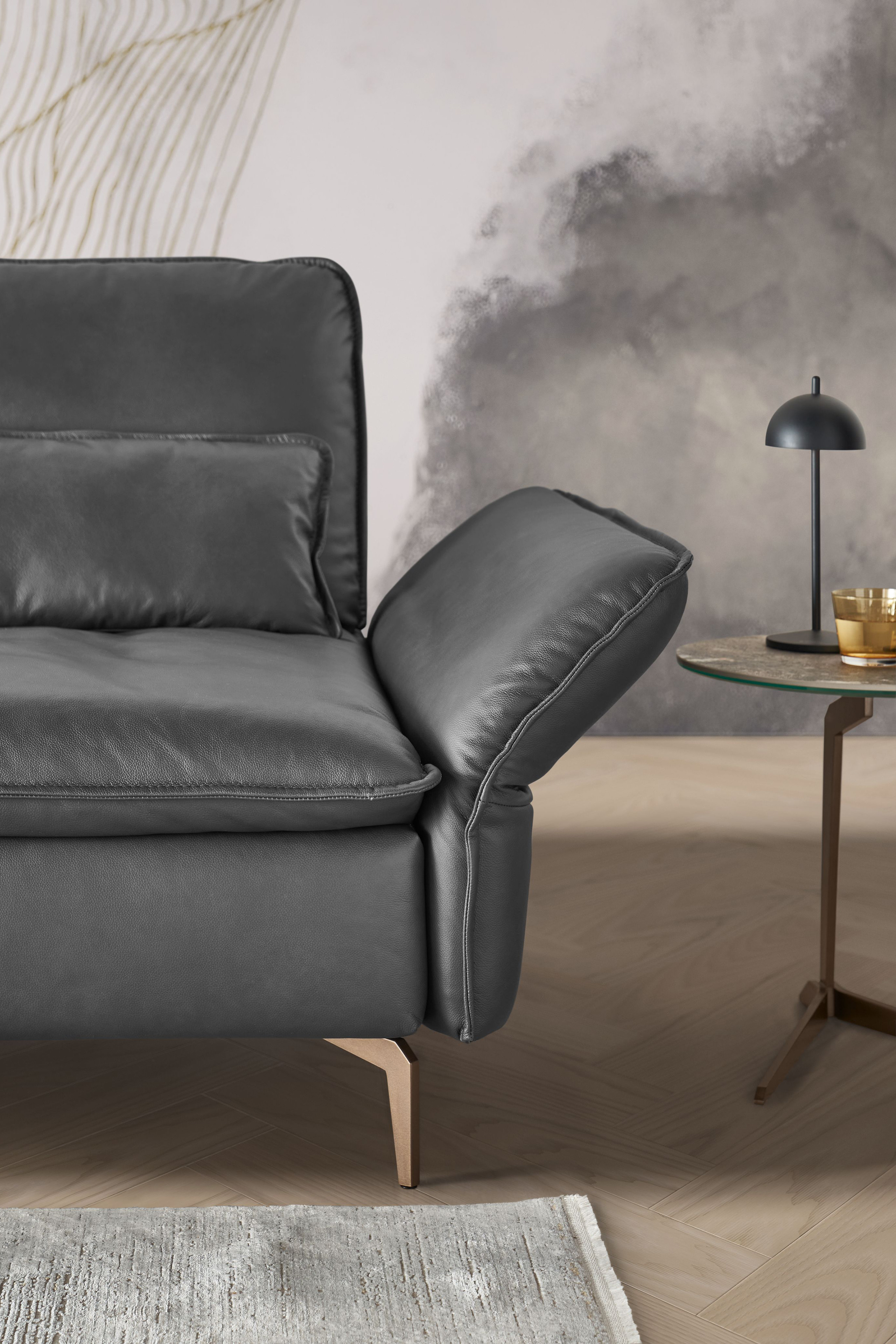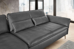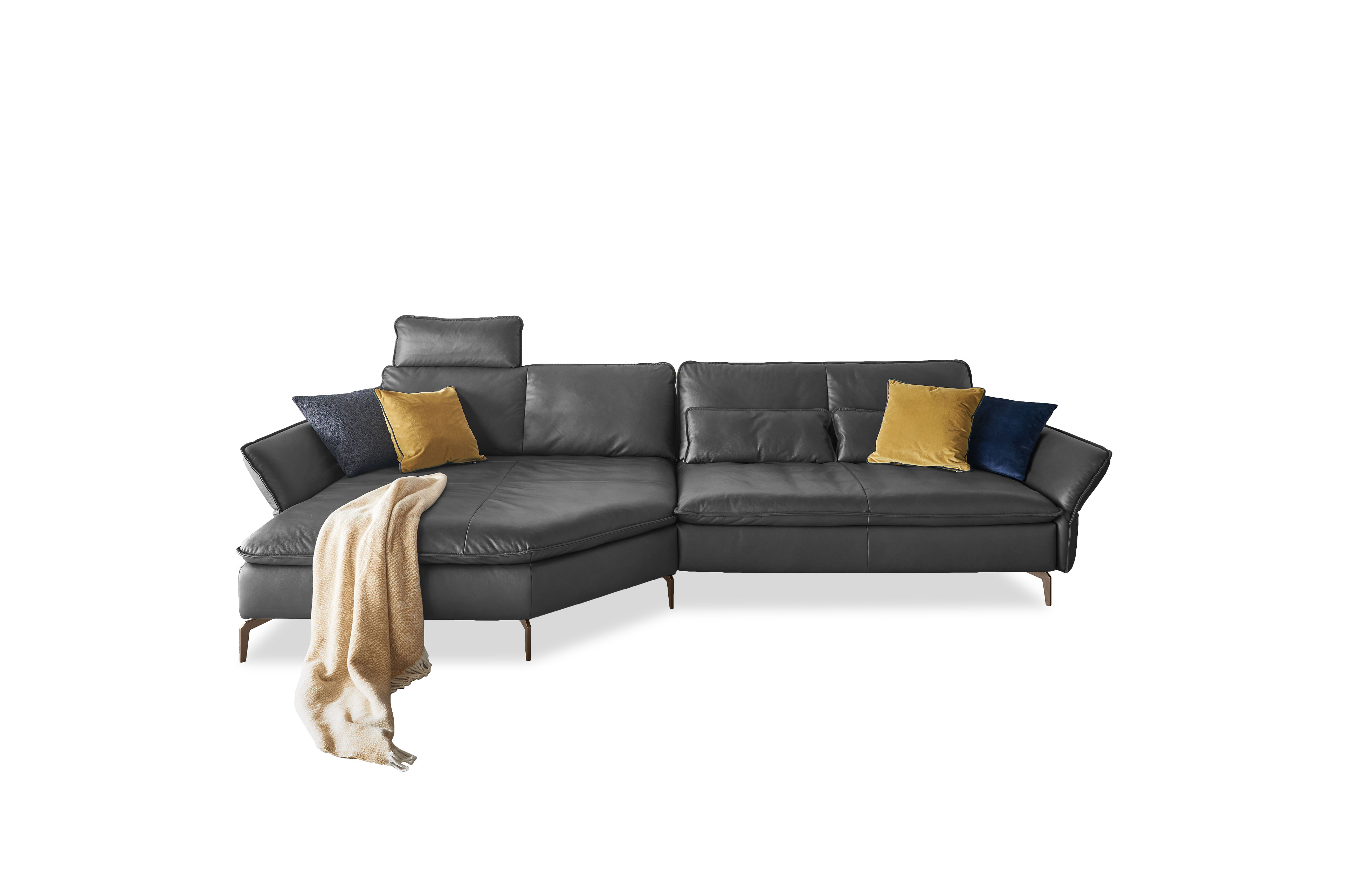 Mit der Eckgarnitur MR 2340 von Musterring erhalten Sie ein Möbelstück, welches Ihr Zuhause mit modernem Look, großzügiger Sitzfläche sowie einer hochwertigen Polsterung bereichert. Sie sind geschafft vom Tag und sehnen sich nach einer kleinen Auszeit? Dann nehmen Sie Platz auf der ca. 160 x 338 cm großen Couchgarnitur, welche mit ihrer ergo-PUR-Schaum gepolsterten Sitzfläche, getragen von dauerelastischen Wellenfedern, für ein herrliches Sitzerlebnis sorgt, und genießen Sie gemütliche Stunden mit einem guten Buch oder einer spannenden Serie. In unserem zauberhaften Angebot präsentiert sich das Schmuckstück mit einem dunkelgrauen Ledergewand sowie mit bronzefarbenen Metallfüßen. Diese Farbkombination harmoniert nicht nur perfekt miteinander, sondern wird zu einem stilvollen Highlight und verleiht jedem Wohnraum einen eleganten sowie einzigartigen Charme. Aber auch in puncto Funktion kann das Musterring Sofa überzeugen: Die im 2-Sitzer enthaltene Sitztiefenverstellung, ermöglicht durch das Zurücksetzen der Rückenlehne, die Sitztiefe von etwa 63 cm auf ca. 81 cm zu erweitern. Ideal für ein aufrechtes Sitzen beim Lesen oder ein entspanntes Zurücklehnen. Außerdem lässt sich MR 2340 mit einer Seitenteilverstellung ausstatten, sodass Sie die Armlehnen auf Ihre gewünschte Position stufenweise anpassen können. Über die Zusatzoptionen haben Sie die Möglichkeit, diese sowie auch Kopfstützen hinzuzubuchen oder aus verschiedenen Fußvarianten auszuwählen. Zudem finden Sie darüber hinaus Kissen, welche das Gesamtbild optimal ergänzen und den Wohlfühlfaktor erhöhen. Sie sind begeistert, aber das Äußere passt nicht zu Ihrem bestehenden Wohnkonzept? Kein Problem! Mit einem Klick auf "Farbe ändern" haben Sie die Wahl, zwischen dezenten oder kräftigen Farbnuancen sowie verschiedenen Bezugsmaterialien. Für noch mehr Gestaltungsfreiheit steht Ihnen der Polsterplaner zur Verfügung. So können Sie aus diversen Elementen auswählen und Ihr Traumsofa nach Ihrer Einrichtung sowie Ihrem Platzangebot konfigurieren. Setzen Sie ein Design-Statement und erleben Sie erholsame Momente mit der Polstergarnitur MR 2340 von Musterring.